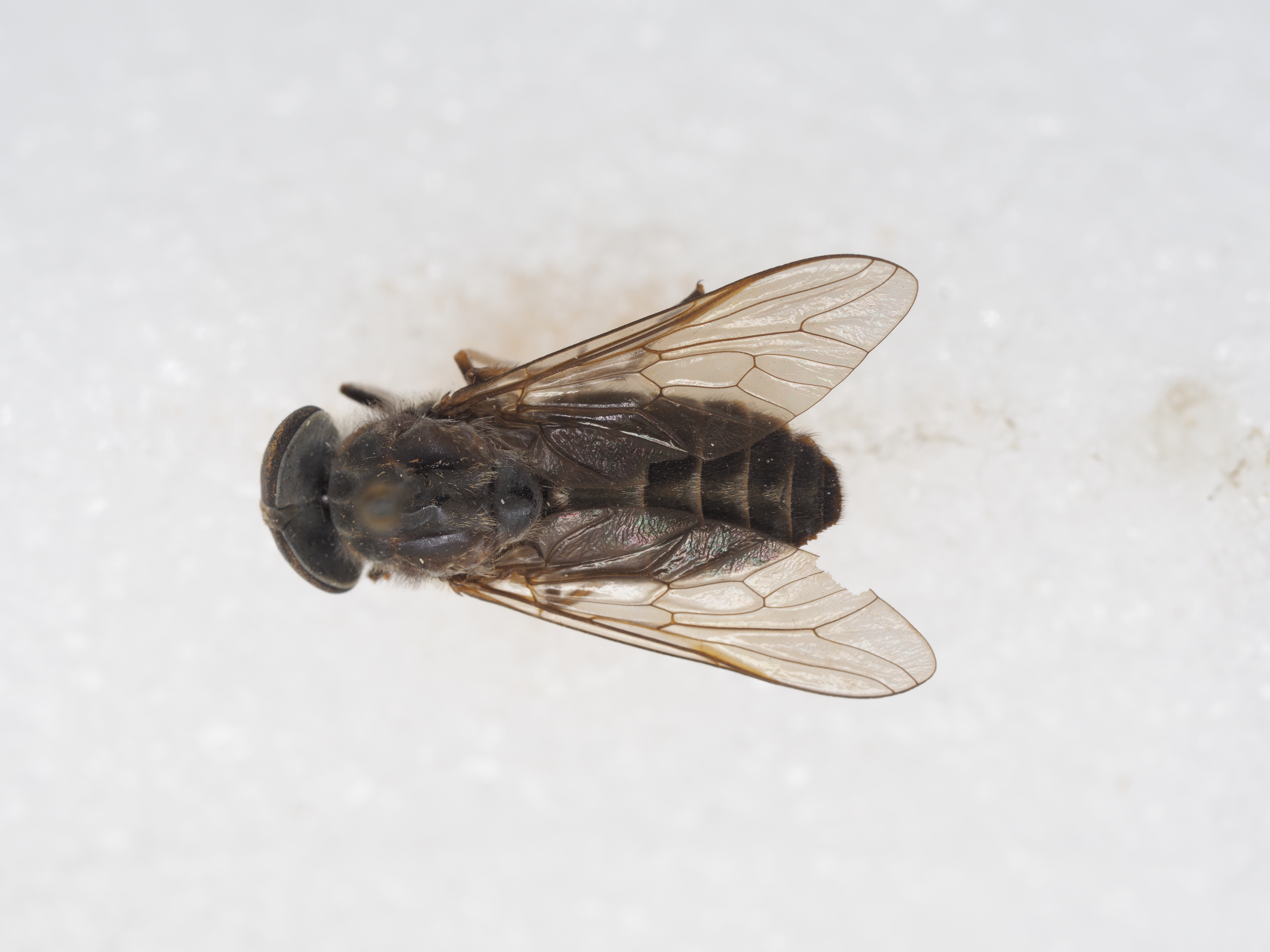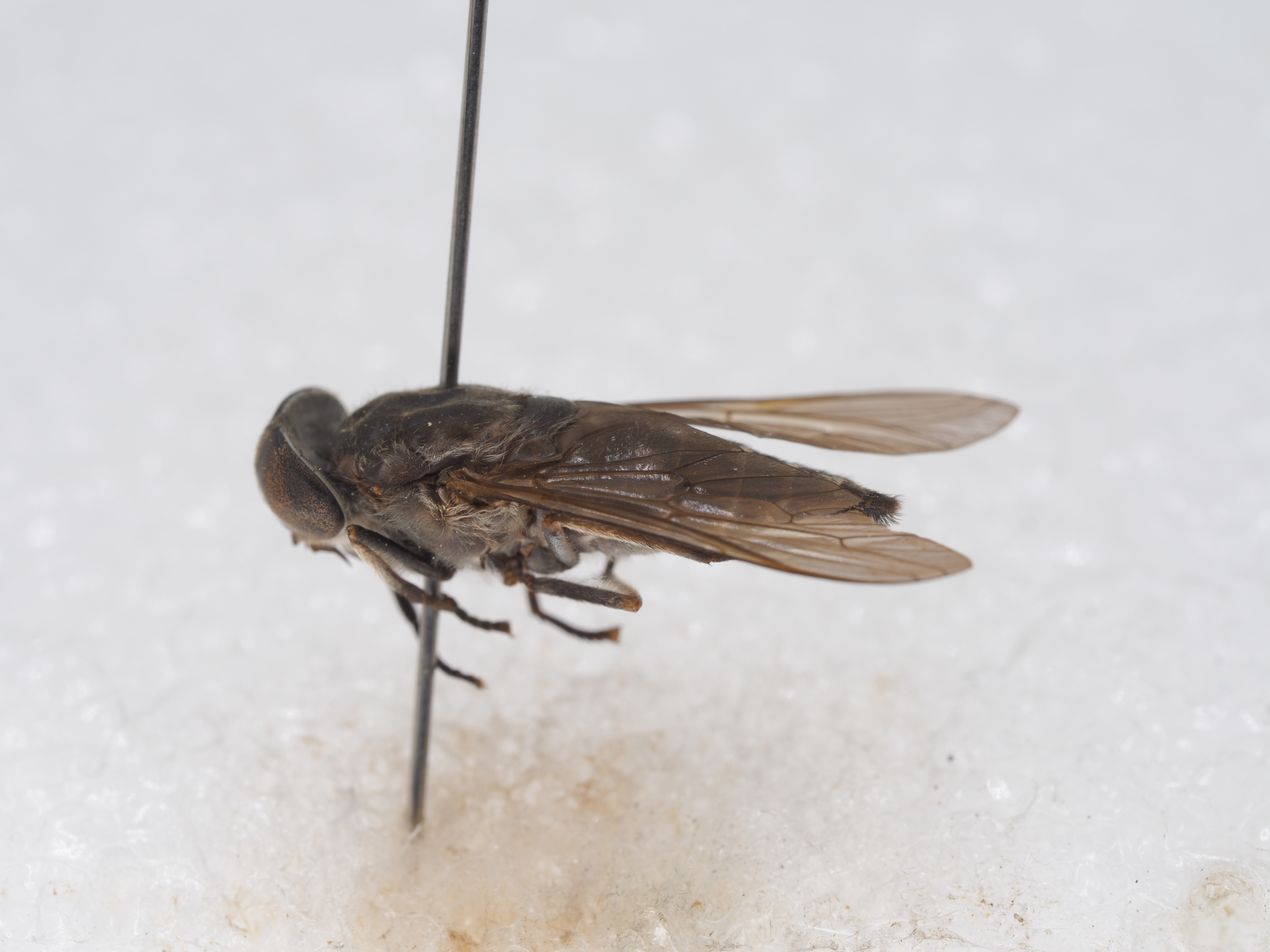 胸部盾片黑色,覆灰色粉被,有3条模糊的纵纹。小盾片纹饰同盾片。足黑色,胫节大部黄棕色,跗节黒色。翅透明,R4脉无附枝。