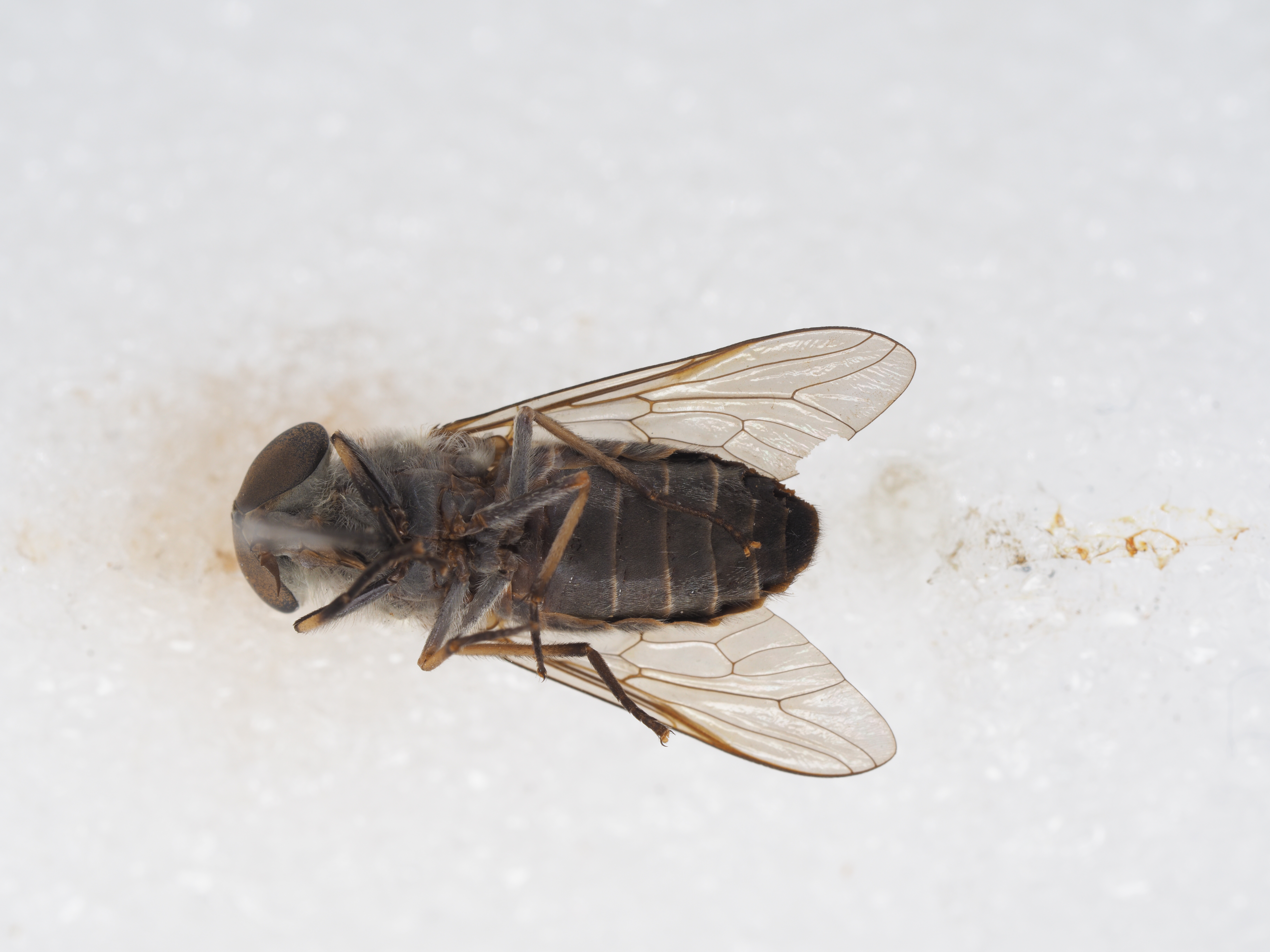 腹部背板黑色,2-5节中央具灰白色三角斑,与前节末端仅稍接触,2-4节两侧有灰白色斜斑,白斑处着生白毛,背板黑色部分着生黑毛。腹板黑色,覆灰粉被,两侧灰白色,中央灰黑色,形成深色纵条。