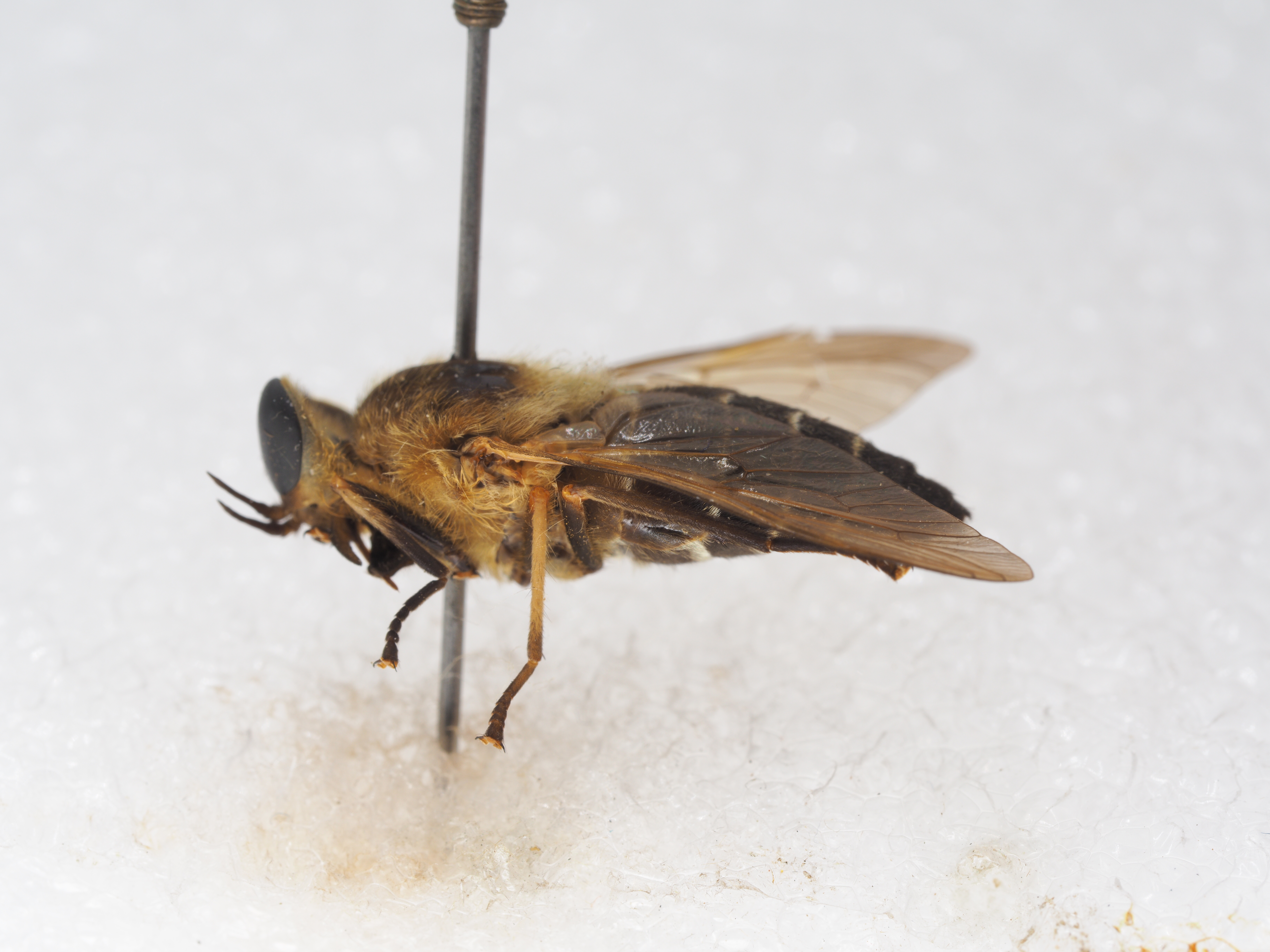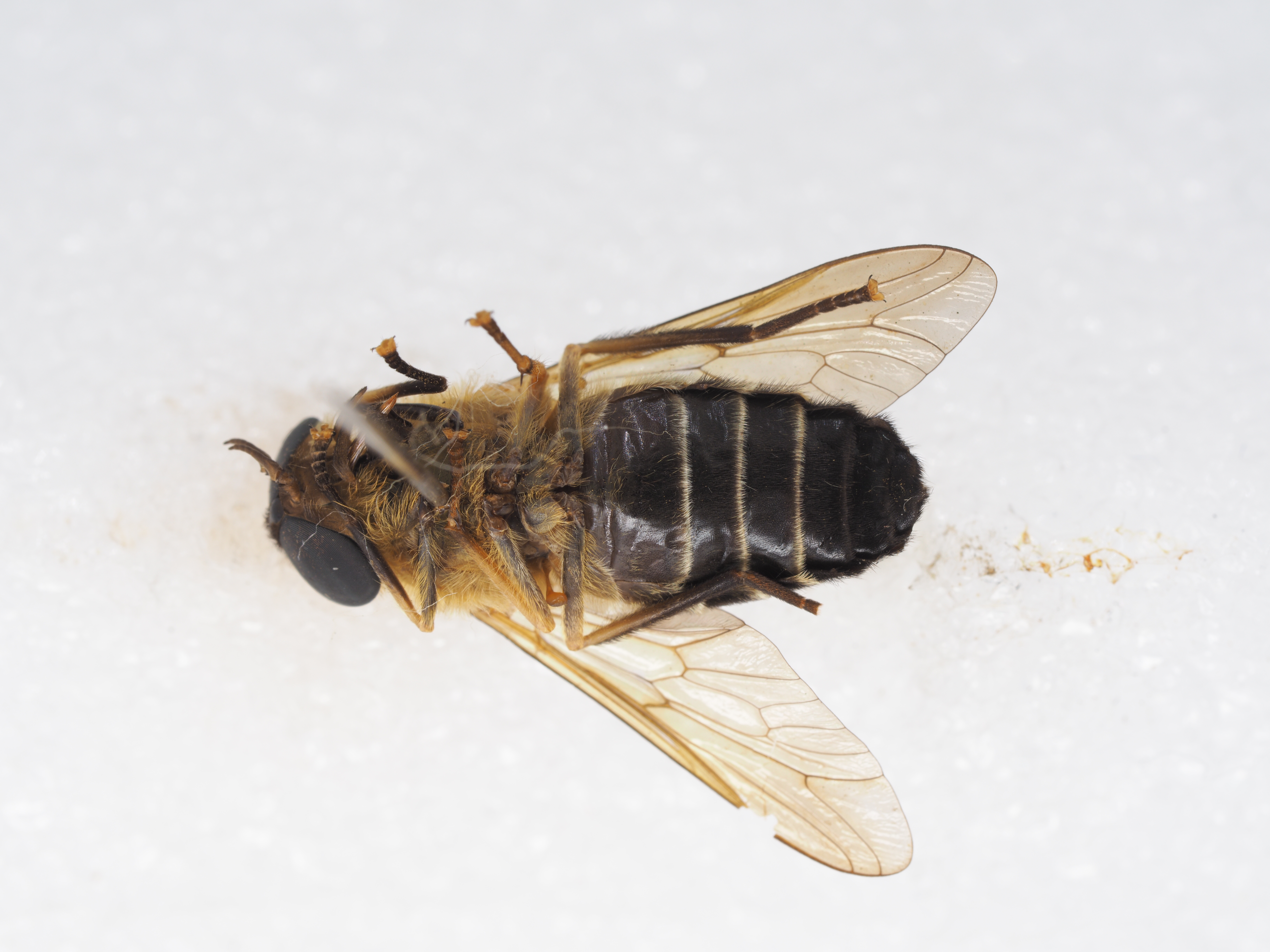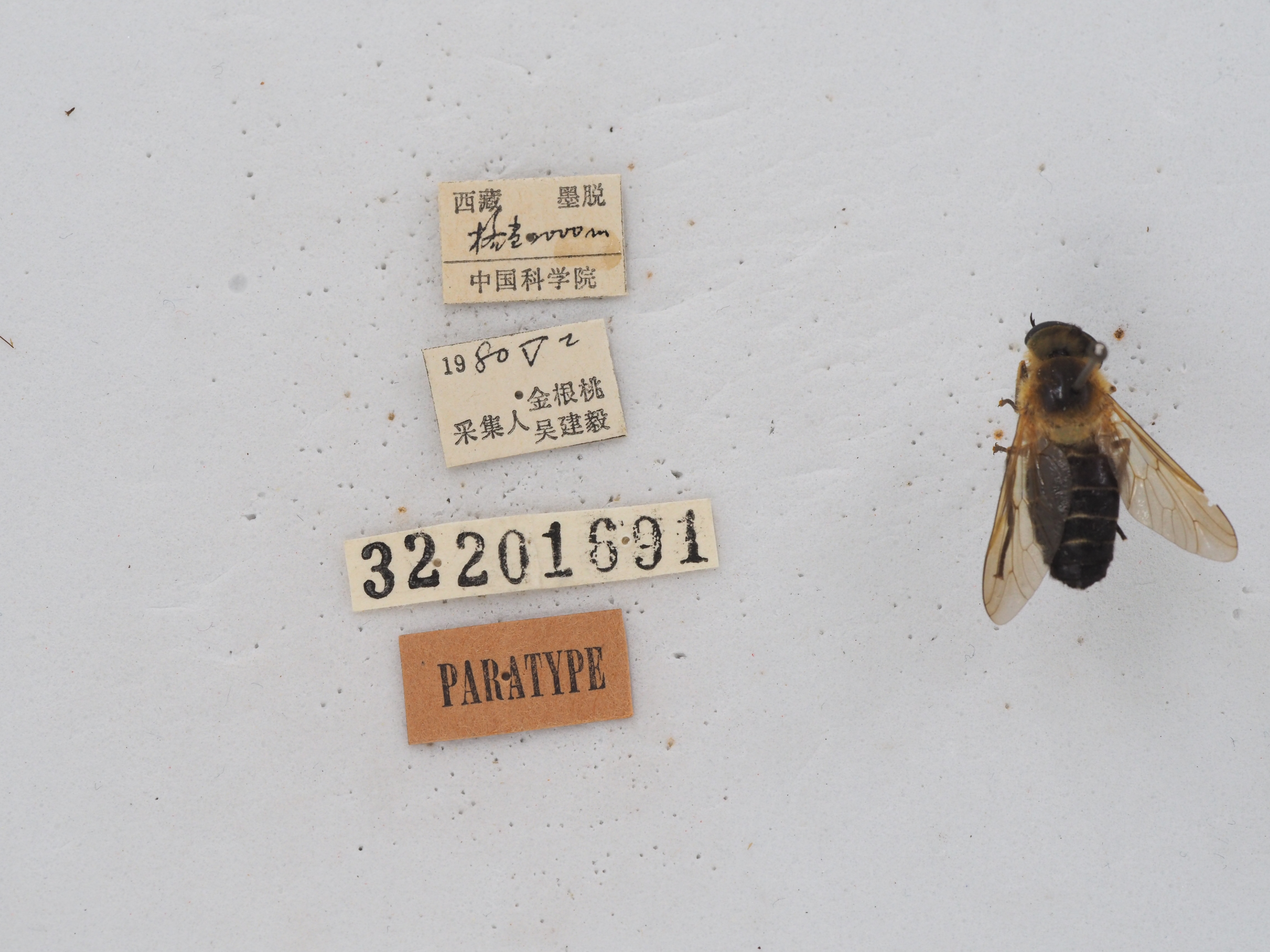 描述:雌虫体长20毫米黑色大型种。头部前额(frons)黑褐色,上宽下罕,高度为基部宽度的4倍,丛生黑毛。基胛(basal ca11us)近方形,与亚胛(subcallus)接触而不与眼接触。中胛(median callus)棱形,与基胛连在一起。亚胛色同前额。脸(face)及颊(gena)上部黑褐色,着生黑毛,颊下部黄色,着生黄毛。触角细长黑褐色,愈向末端色愈深,第1、2节稍浅,第3节第1环节基部有钝突,长为宽的2.5倍。下颚须第2节