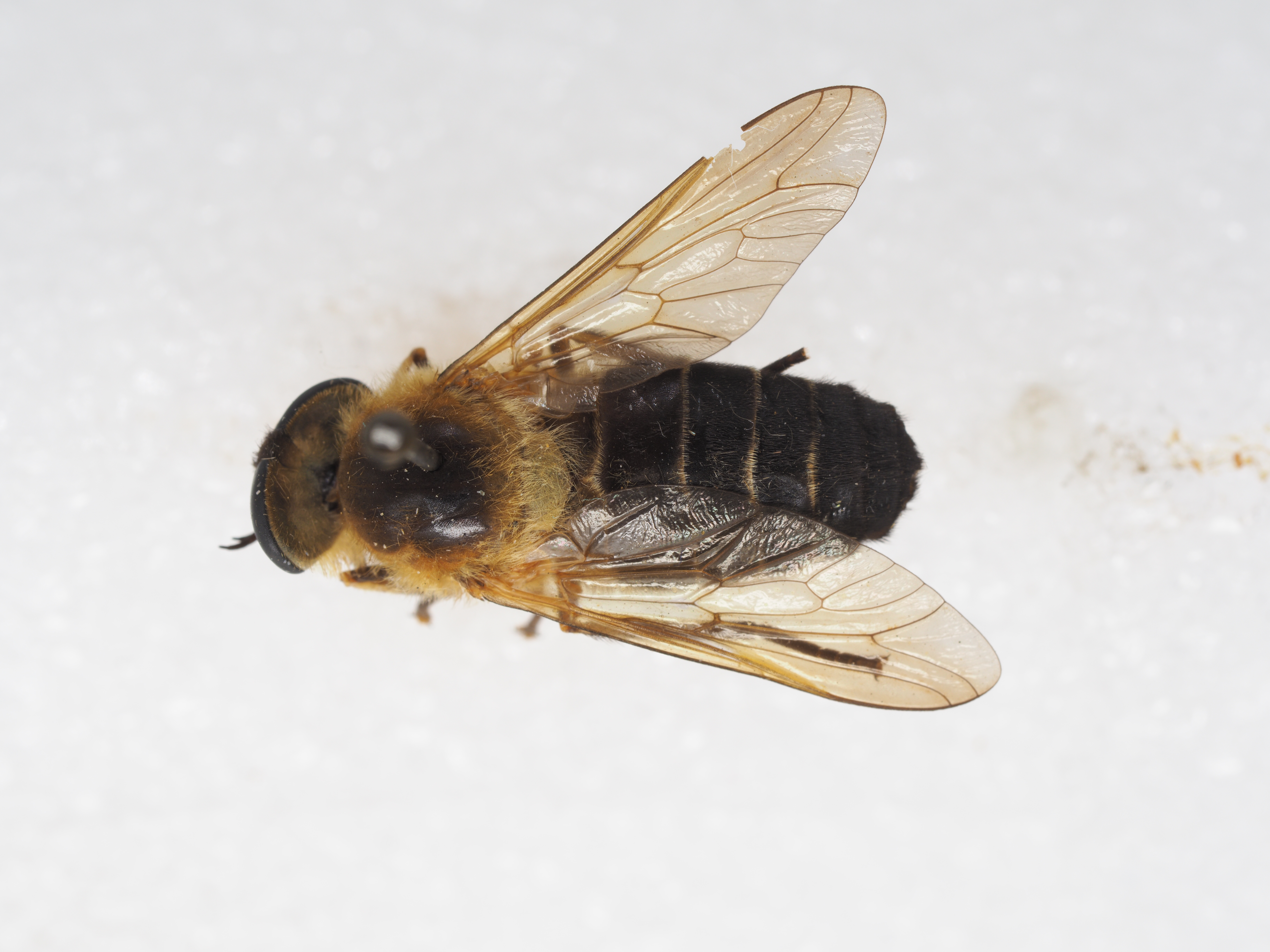 胸部盾片(scutum)黑色,中央大部光滑裸露,周缘覆黄绿色粉被及毛丛。小盾片(scutellum)覆灰色粉被及毛丛。翅透明,翅前缘着烟色。R4脉无附枝。足股节黑色,前胫节基部约1/3黄色,有些副模大部分黄色,其余黑色,中胫节黄色,仅末端部分黑色,后胫节基部1/3黄色,跗节黑色。腹部背板全部黑色,密覆黒毛,第1-4节末端具白色窄带,中央突起,第5-7背板完全黑色,白色部分着生白毛。腹板纹饰同背板,但白带中央无突起。