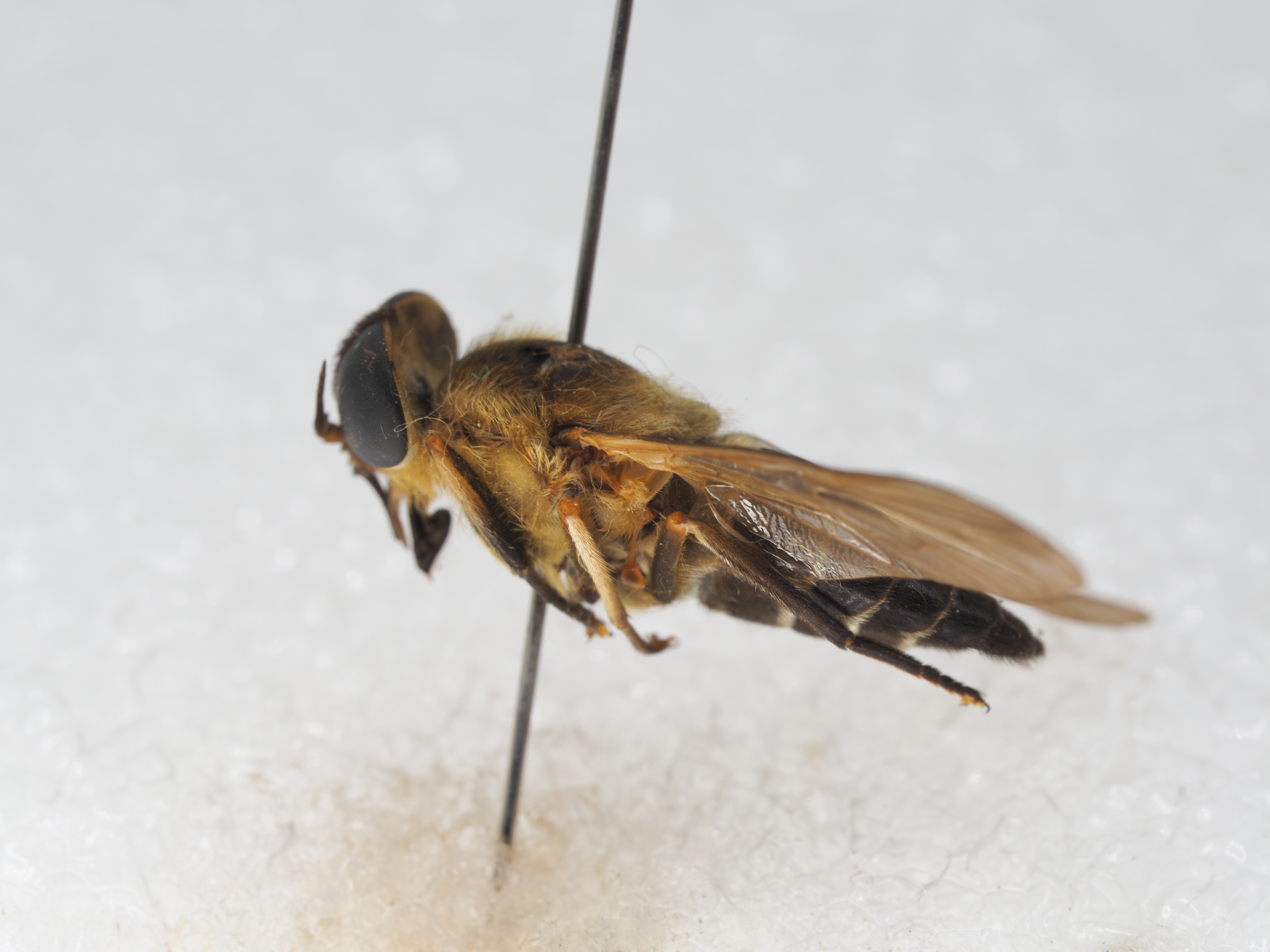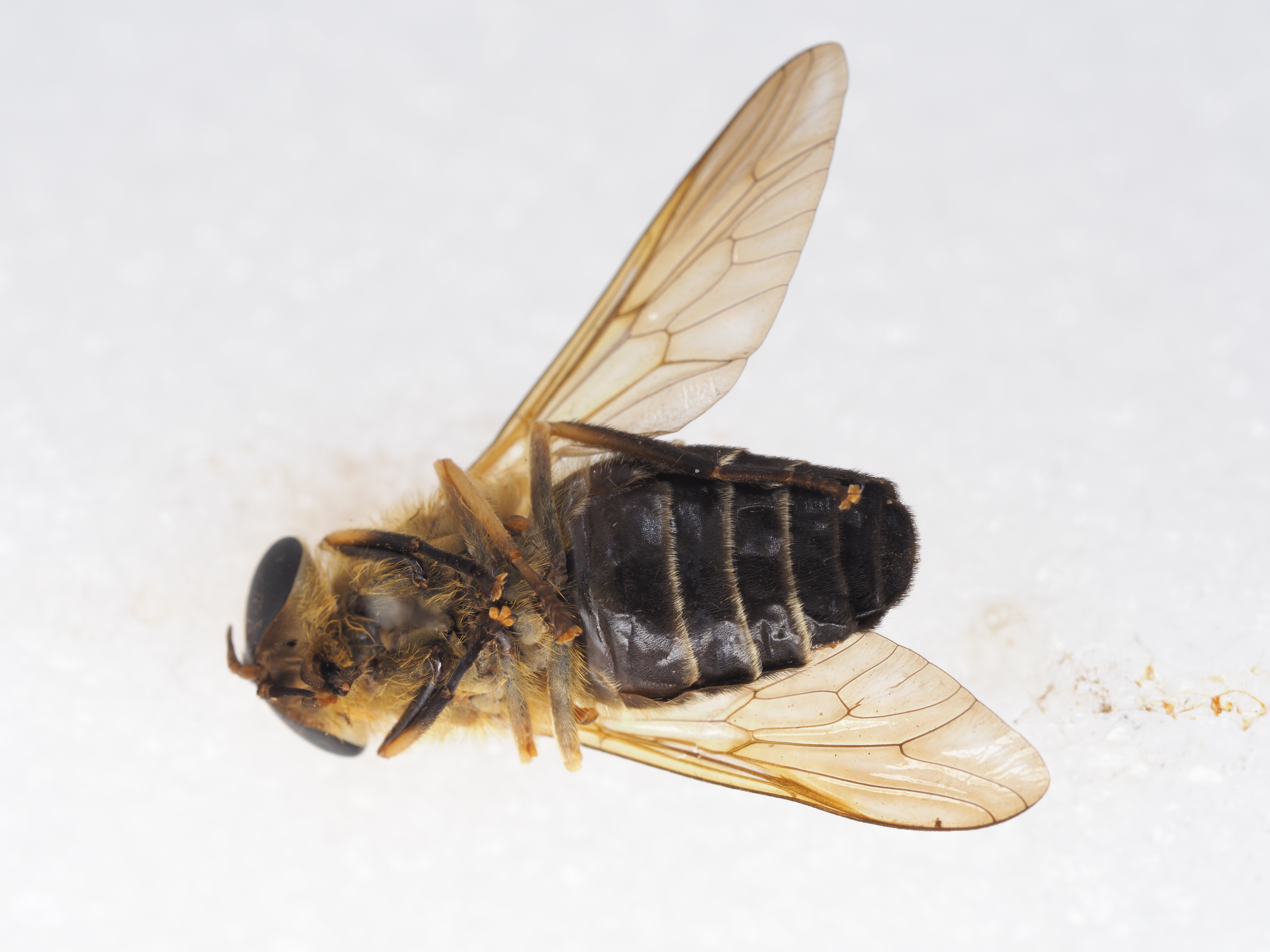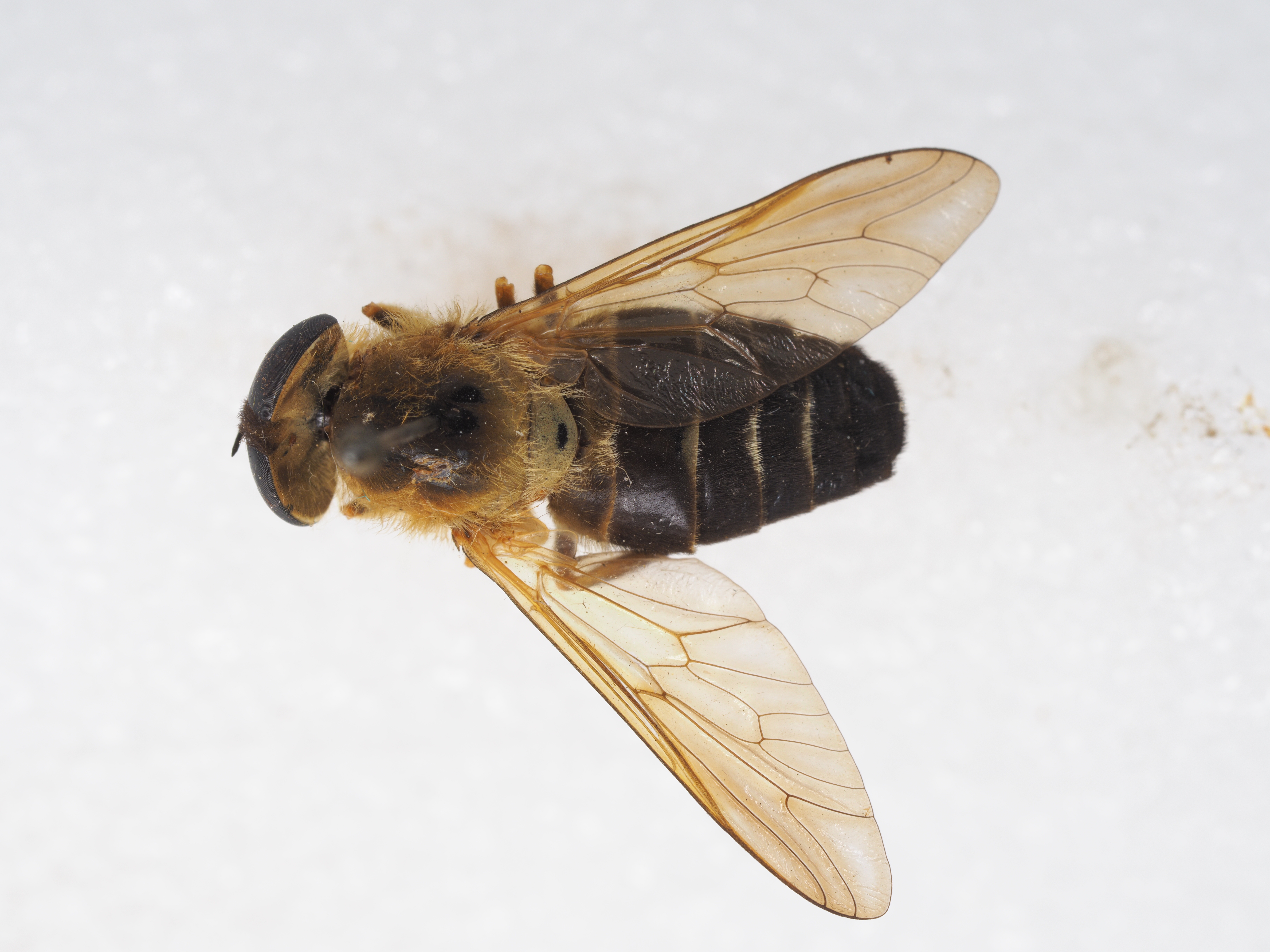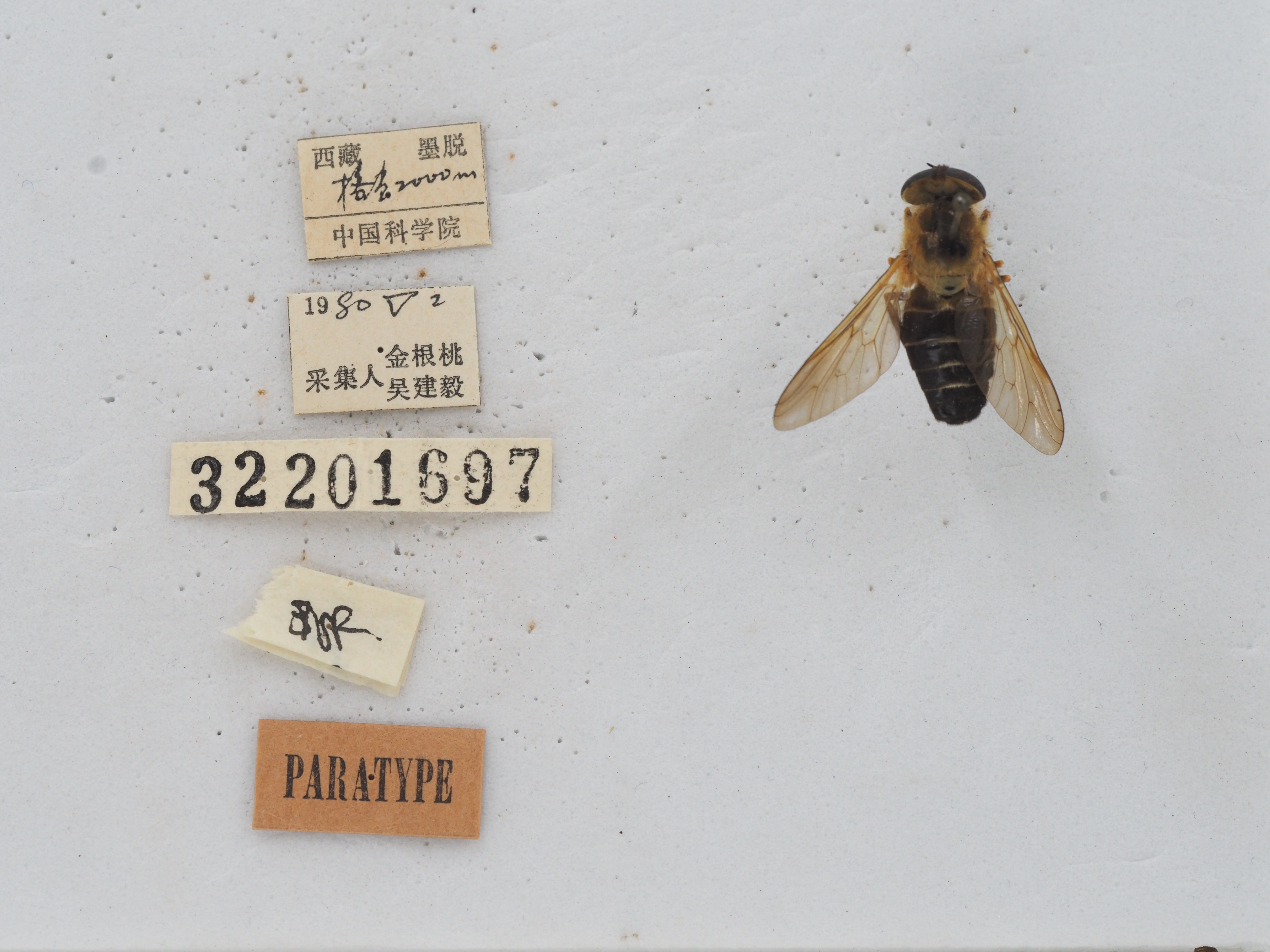 描述:雌虫体长20毫米黑色大型种。头部前额(frons)黑褐色,上宽下罕,高度为基部宽度的4倍,丛生黑毛。基胛(basal ca11us)近方形,与亚胛(subcallus)接触而不与眼接触。中胛(median callus)棱形,与基胛连在一起。亚胛色同前额。脸(face)及颊(gena)上部黑褐色,着生黑毛,颊下部黄色,着生黄毛。触角细长黑褐色,愈向末端色愈深,第1、2节稍浅,第3节第1环节基部有钝突,长为宽的2.5倍。下颚须第2节