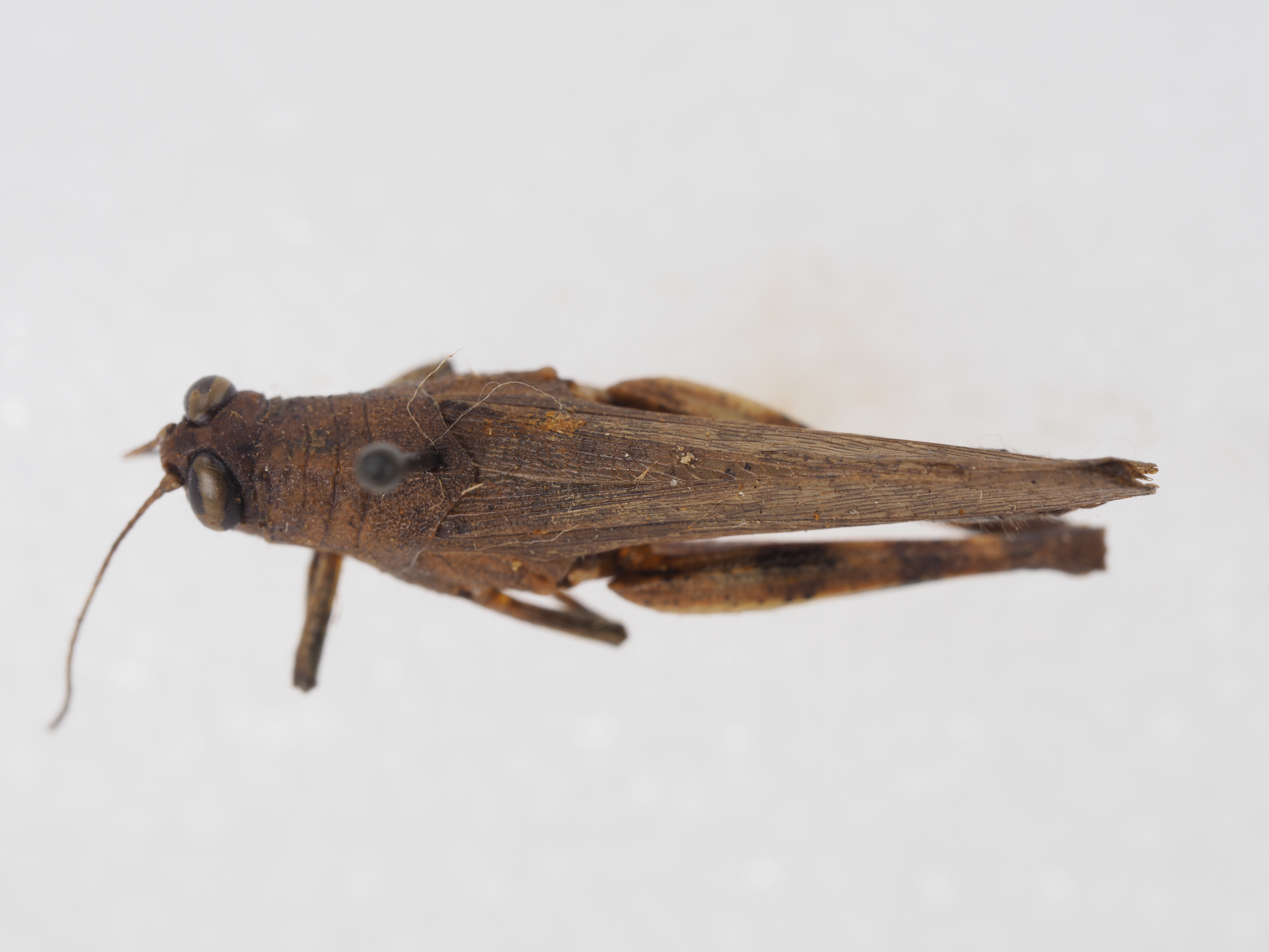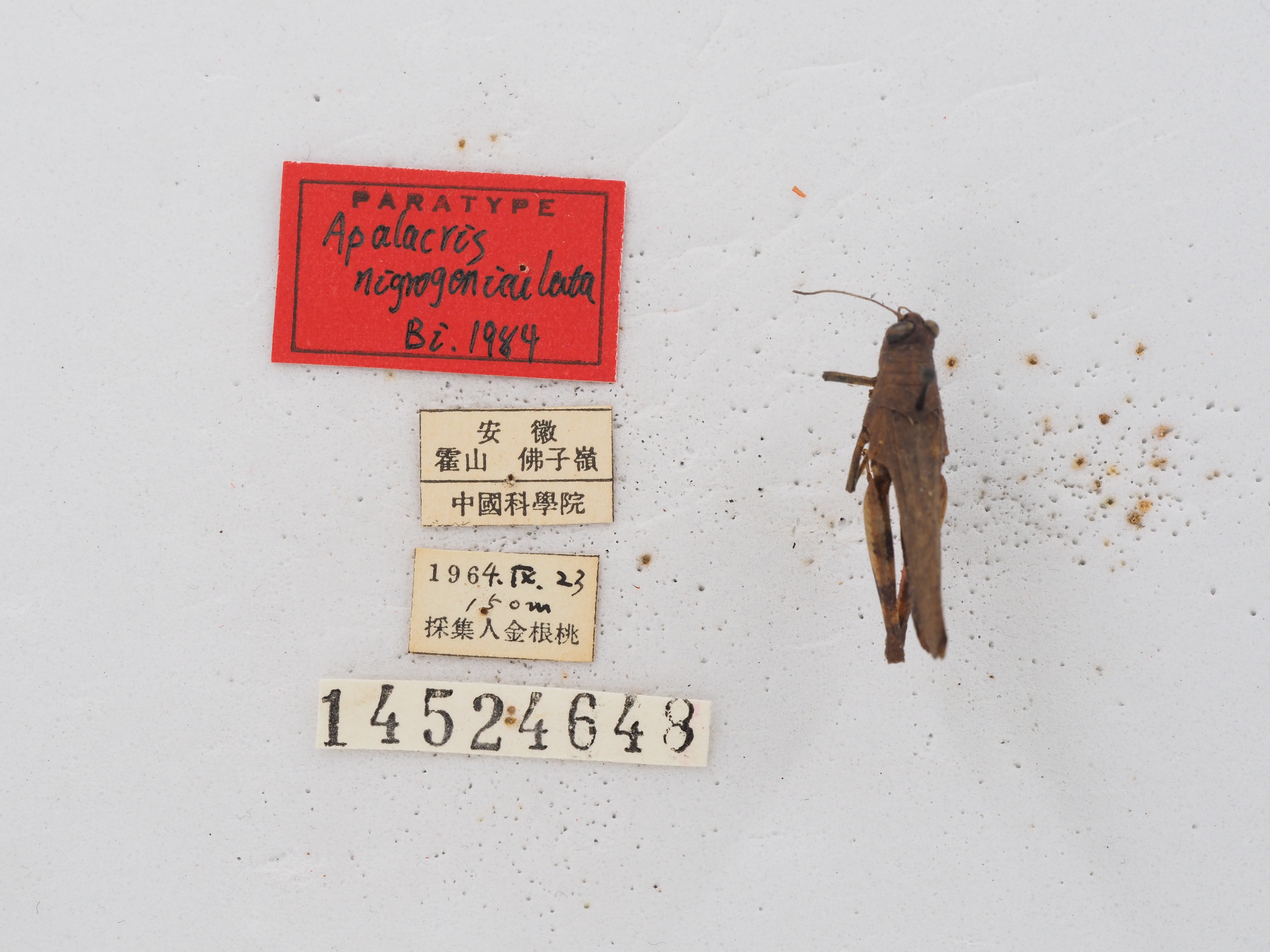 描述:雄性 体型中等。体匀称,具刻点和皱纹。腹面和足均具绒毛。头短,短于前胸背板,约等于沟前区的长度。头顶侧观略向前倾斜,与颜面组成圆弧形,背观近乎六角形,中央略低凹。后头具有中隆线。颜面侧观略向后倾斜;颜面隆起具粗刻点,侧缘明显隆起,自触角之下具纵沟,侧缘在中央单眼的下方具收缩之凹陷,其在触角之间的宽度大于其在复眼之间的宽度。复眼突出,卵形,其垂直的直径为其横径的1.6~1.7倍,为眼下沟长度的1.8倍。触角丝状,24节,向后超过后足股节基部,其中段一节的长为宽的3.0~3.6倍。前胸背板近乎圆筒形,沟后区略向外扩展;前缘圆弧形,后缘近直角形;中隆线明显,缺侧隆线;3条横沟均割中隆线,后横沟位于后端。前胸背板侧片长大于高,前下角几乎为直角,后下角为钝圆形。前胸腹板突为较短的圆锥形。中胸腹板侧叶间之中隔较宽,宽大于长;后胸腹板侧叶分开。前、后翅均发达;前翅长度超过后足股节端部,前缘基部较扩大,顶端为圆形斜切。后足股节较粗壮,上侧中隆线具细齿;下膝侧片顶端近圆形。后足胫节端部不扩大,缺外端刺,沿其外缘具刺9~11个,内缘具刺9~10个。后足跗节较短,不超过胫节中部,第3节长度约为其余两节之和。腹部末节背板后缘缺尾片。尾须圆锥形,其长不超过肛上板顶端。肛上板为长三角形,顶端圆形。下生殖板圆锥形,顶端狭圆。阳具基背片见图270b。
