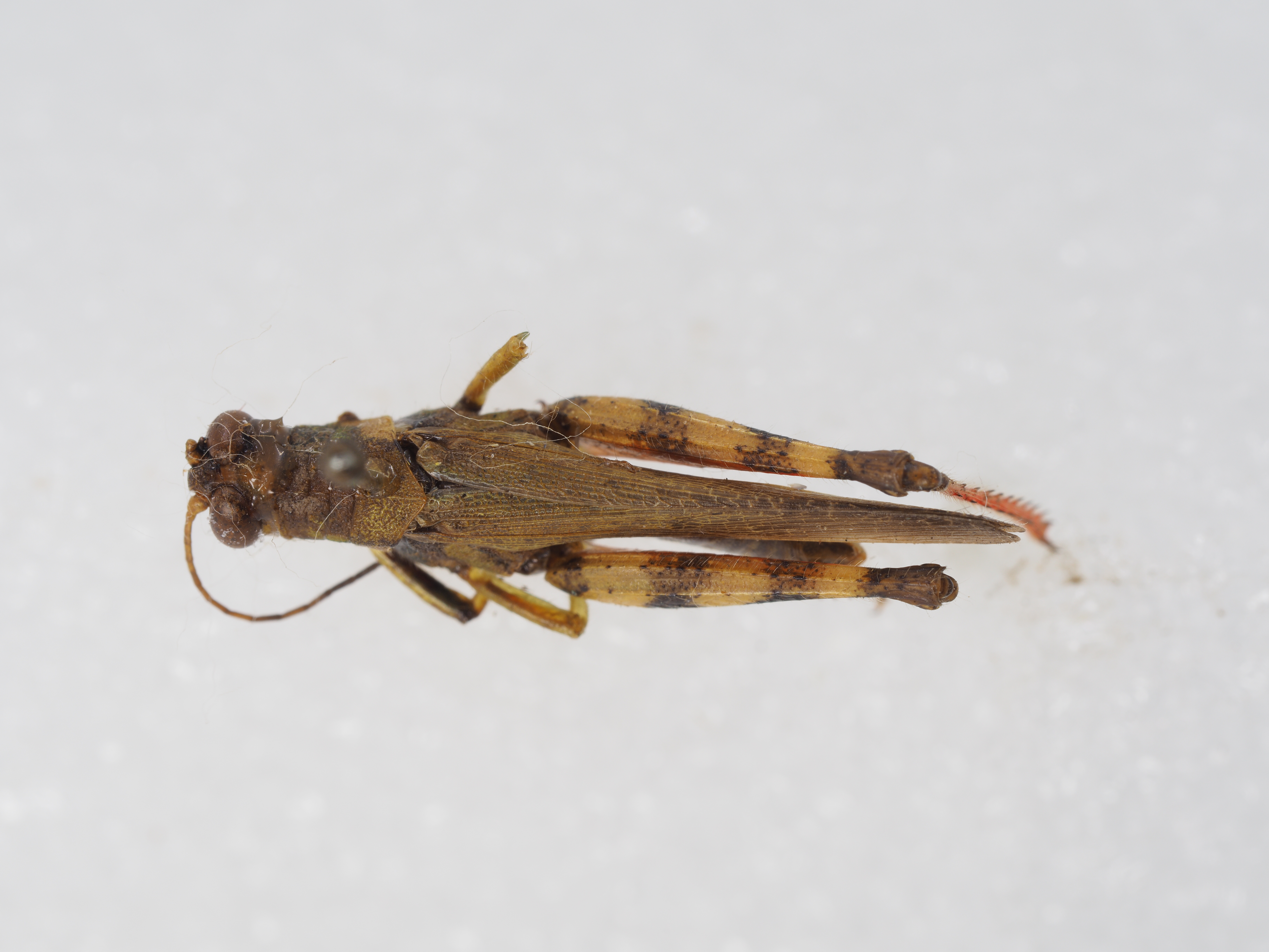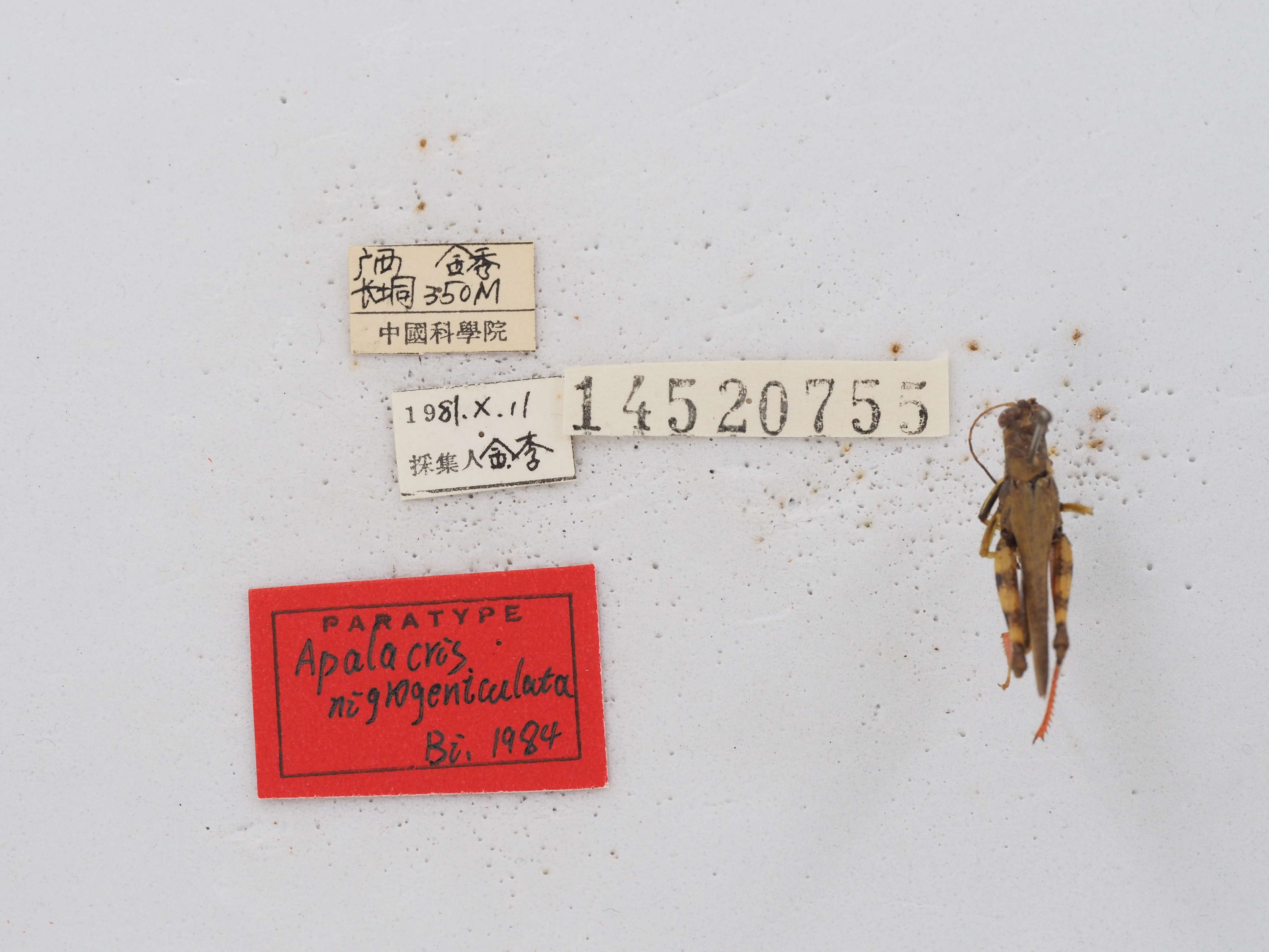 描述:雄性 体型中等。体匀称,具刻点和皱纹。腹面和足均具绒毛。头短,短于前胸背板,约等于沟前区的长度。头顶侧观略向前倾斜,与颜面组成圆弧形,背观近乎六角形,中央略低凹。后头具有中隆线。颜面侧观略向后倾斜;颜面隆起具粗刻点,侧缘明显隆起,自触角之下具纵沟,侧缘在中央单眼的下方具收缩之凹陷,其在触角之间的宽度大于其在复眼之间的宽度。复眼突出,卵形,其垂直的直径为其横径的1.6~1.7倍,为眼下沟长度的1.8倍。触角丝状,24节,向后超过后足股节基部,其中段一节的长为宽的3.0~3.6倍。前胸背板近乎圆筒形,沟后区略向外扩展;前缘圆弧形,后缘近直角形;中隆线明显,缺侧隆线;3条横沟均割中隆线,后横沟位于后端。前胸背板侧片长大于高,前下角几乎为直角,后下角为钝圆形。前胸腹板突为较短的圆锥形。中胸腹板侧叶间之中隔较宽,宽大于长;后胸腹板侧叶分开。前、后翅均发达;前翅长度超过后足股节端部,前缘基部较扩大,顶端为圆形斜切。后足股节较粗壮,上侧中隆线具细齿;下膝侧片顶端近圆形。后足胫节端部不扩大,缺外端刺,沿其外缘具刺9~11个,内缘具刺9~10个。后足跗节较短,不超过胫节中部,第3节长度约为其余两节之和。腹部末节背板后缘缺尾片。尾须圆锥形,其长不超过肛上板顶端。肛上板为长三角形,顶端圆形。下生殖板圆锥形,顶端狭圆。阳具基背片见图270b。