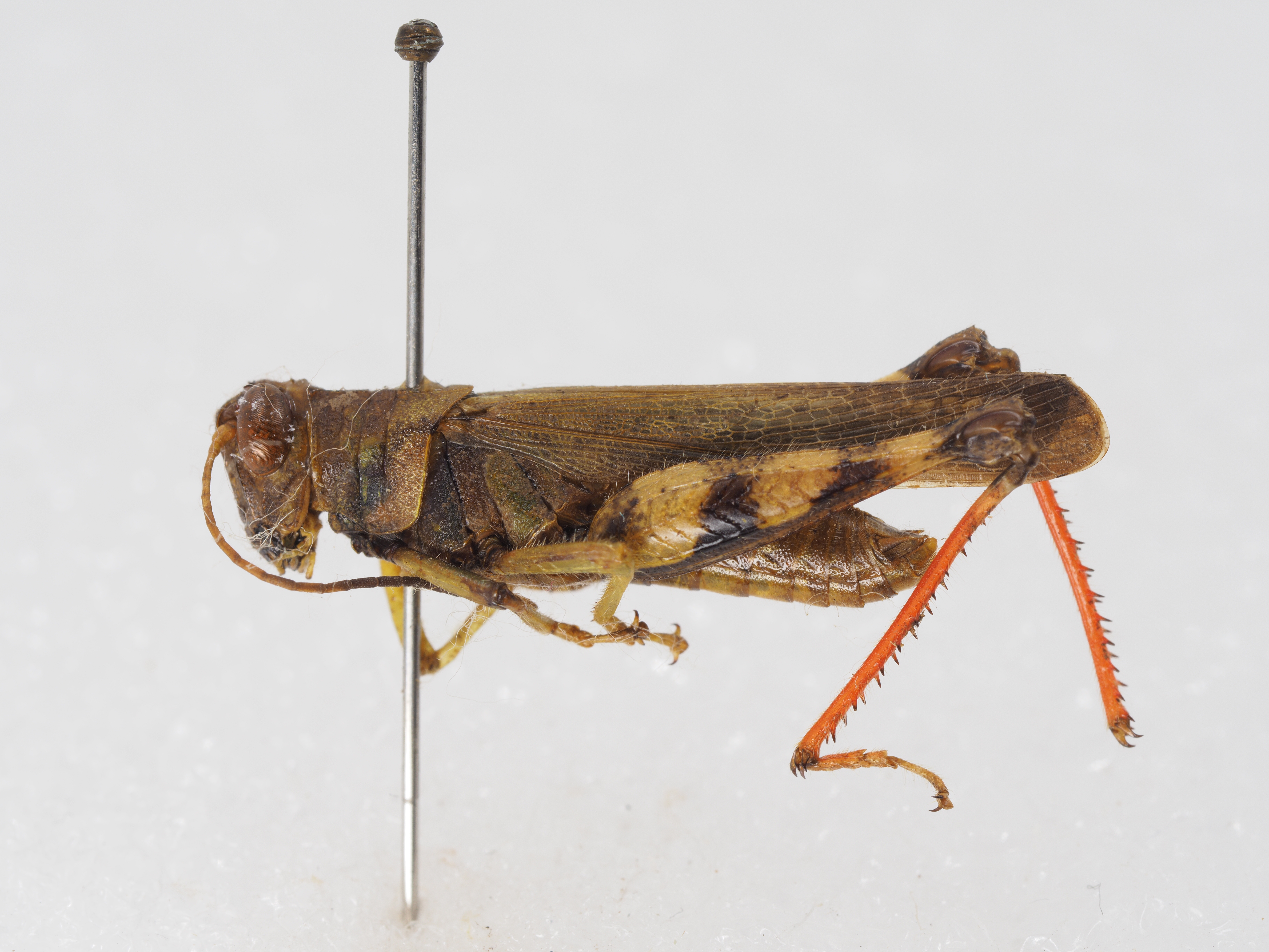 体色:一般为褐色或橄榄绿色或黑褐色,前胸背板侧片后缘具一长条形黄色斑,黄色斑的下端向前延伸到达中横沟;侧片的上部具有2个褐色的斑纹。前翅褐色或橄榄绿色,并具有分散的黑色斑,特别是雌性较多。后翅淡蓝色,外缘为烟色。后足股节外侧具有3个倾斜的淡黄色斑,雄性较完整,有时雌性较不明显;外侧下缘黑色;内侧和内侧下缘均为红色,内侧近端部具黑色斑;膝部为黑色或黑褐色。后足胫节红色,仅基部具黑色环,有时在其黑色中具有很狭的淡色环;胫节刺顶端为黑色。后足跗节红色。