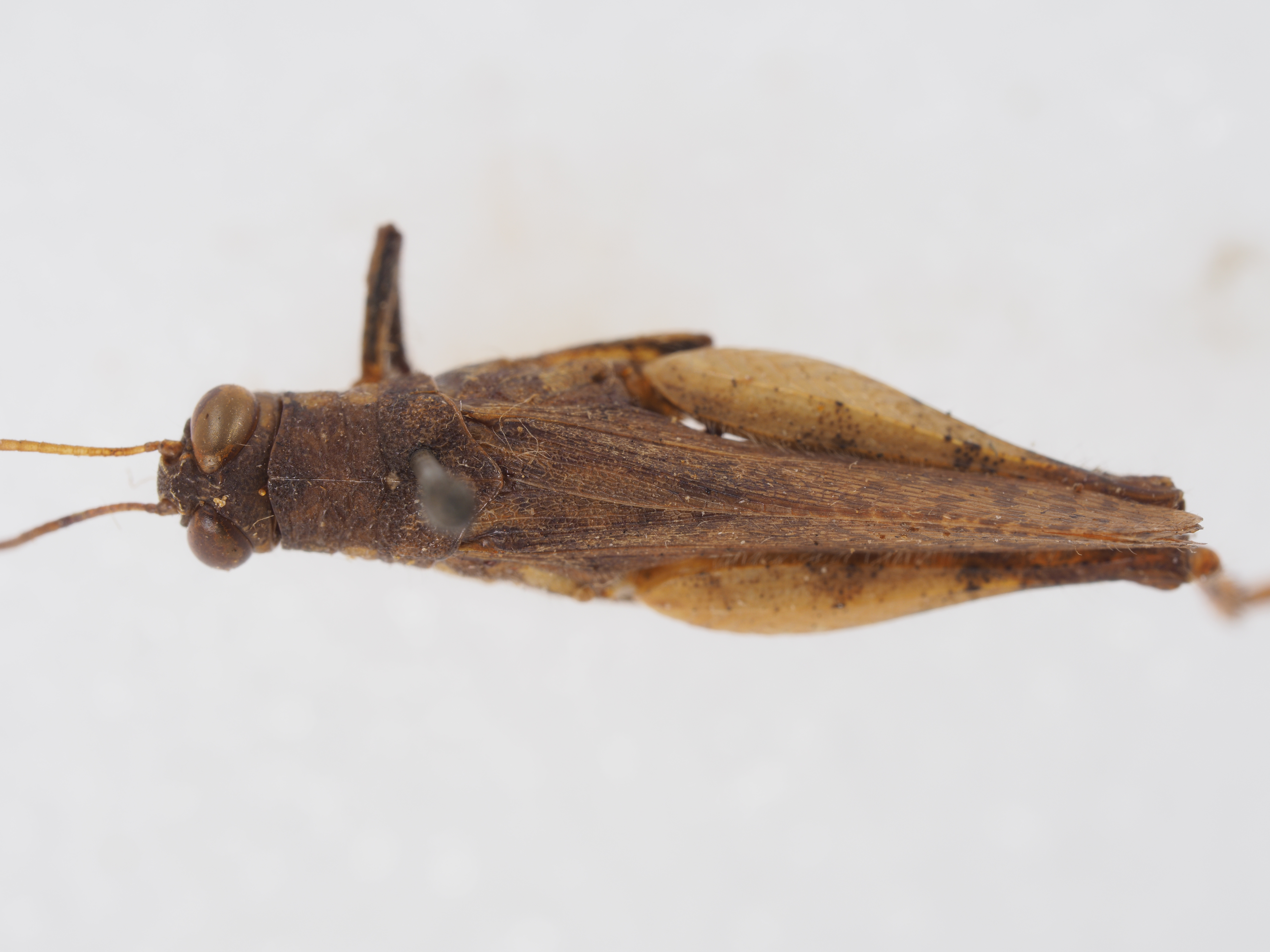描述:雄性 体型较小,匀称,略具细刻点和稀疏绒毛。头较短,短于或等于前胸背板沟前区的长度。.头顶呈水平状,六角形,在复眼之间向后倾斜,具有侧隆线和中隆线,中隆延伸至后头较不明显。颜面隆起侧缘明显,在触角之间较宽;其宽约为头顶在复眼之间宽度的2~2.5倍;自至唇基处开始趋狭,缺纵沟,刻点密。复眼长卵形。触角丝状,其长到达或超过前胸背板后缘。前胸背板的前缘呈圆弧形,中央略微突出;后缘中央向后较突出,几乎呈直角形,顶端钝圆形;中隆线略隆起,仅被后横沟较深的切割;缺侧隆线;前横沟只在其背面清楚可见,中横沟略弯曲,后横沟位于近中部处。前、后翅均发达,其长度多数不到达或刚到达、仅小数略超过后足股节端部。前翅的前缘较直,基部具基突,端部呈圆弧形,端部之横脉略倾斜于纵脉;后翅端部边缘亦呈圆弧形,具有较小的凹口(图281c)。前胸腹板突短圆锥形,顶端略钝。中胸腹板侧叶宽略大于长,内缘较直,后缘略宽;中隔长度约等于宽度;后胸腹板侧叶明显分开。后足股节上侧上隆线具细齿,顶端中央形成小齿。膝侧片为圆形。后足胫节圆柱形,缺外端刺,外缘具刺8~10个,内缘具刺10~11个(包括内端刺)。跗节较短,不到达胫节的中部;中垫较大,但不超过爪之顶端。腹部末节背板后缘具有三角形尾片。肛上板长方形,略向后趋狭;顶端钝圓,两侧缘略隆起,基部中央具短纵沟。尾须圆锥形,向内弯,顶端较尖,其长超过肛上板顶端。下生殖板短锥形。