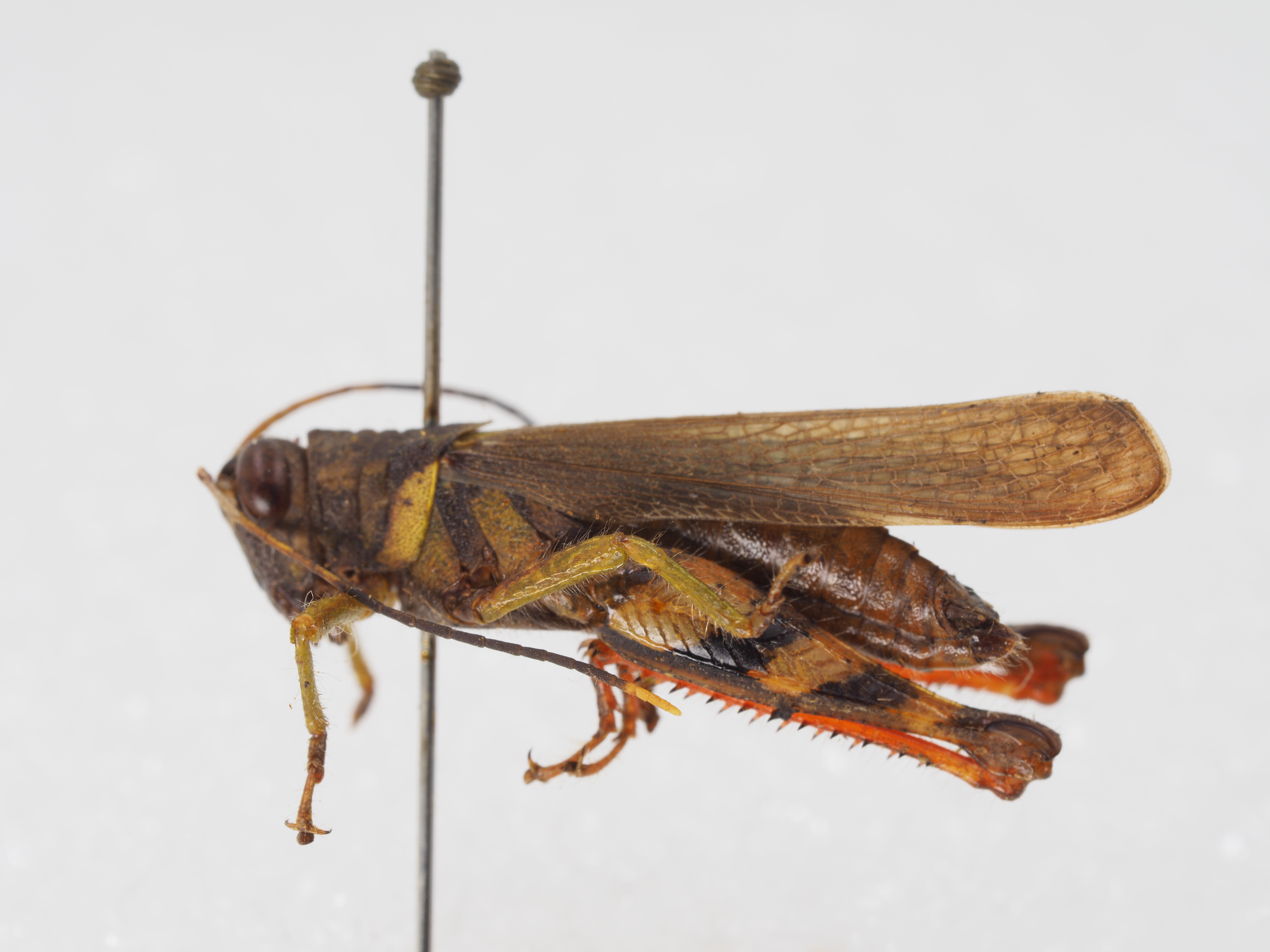 体色:一般为褐色或橄榄绿色。触角基部为淡褐色,中段为黑色,顶端4~5节为黄色或淡黄色。前胸背板侧片上部具有两个褐色斑纹;沿后缘具黄色斑纹,黄色斑纹的下端向前延伸刚达后横沟。前翅褐色或橄榄绿色,具有分散的小黑点,尤其在雌性中较多。后翅淡蓝色,外缘为烟色。后足股节外侧具有3个倾斜的黄色或黄褐色斑,雄性较完整,雌性有时较不完整;外侧下缘为红色,在内侧近顶端处具黑色斑;膝前具黄色环;膝部为淡褐色,外侧下膝侧片为淡褐色,并且有小黑点或红褐色;内侧下膝侧片为红色或红褐色。后足胫节红色,基部具污点,胫节刺顶端为黑色。后足跗节红褐色。