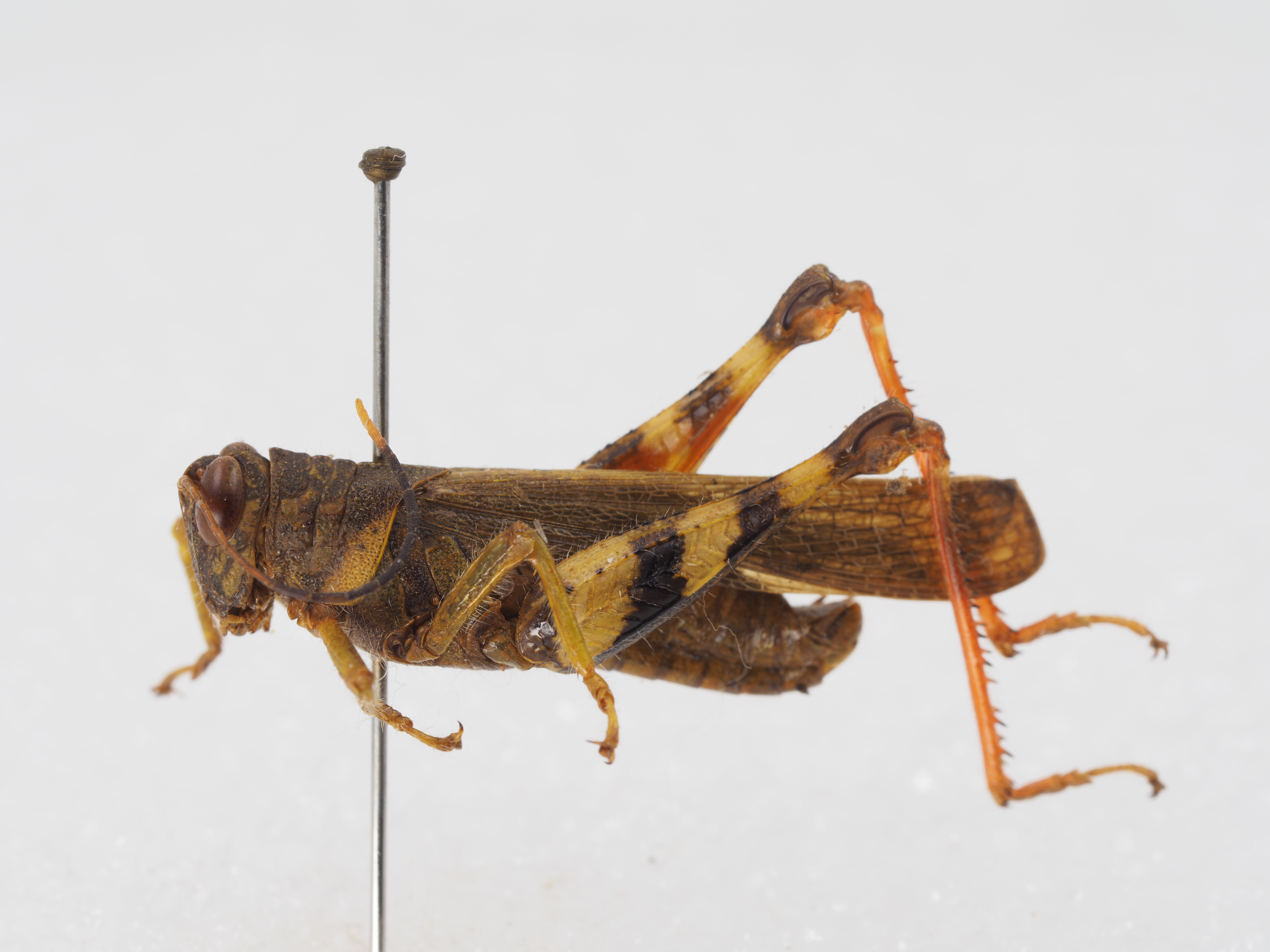 体色:一般为褐色或橄榄绿色。触角基部为淡褐色,中段为黑色,顶端4~5节为黄色或淡黄色。前胸背板侧片上部具有两个褐色斑纹;沿后缘具黄色斑纹,黄色斑纹的下端向前延伸刚达后横沟。前翅褐色或橄榄绿色,具有分散的小黑点,尤其在雌性中较多。后翅淡蓝色,外缘为烟色。后足股节外侧具有3个倾斜的黄色或黄褐色斑,雄性较完整,雌性有时较不完整;外侧下缘为红色,在内侧近顶端处具黑色斑;膝前具黄色环;膝部为淡褐色,外侧下膝侧片为淡褐色,并且有小黑点或红褐色;内侧下膝侧片为红色或红褐色。后足胫节红色,基部具污点,胫节刺顶端为黑色。后足跗节红褐色。