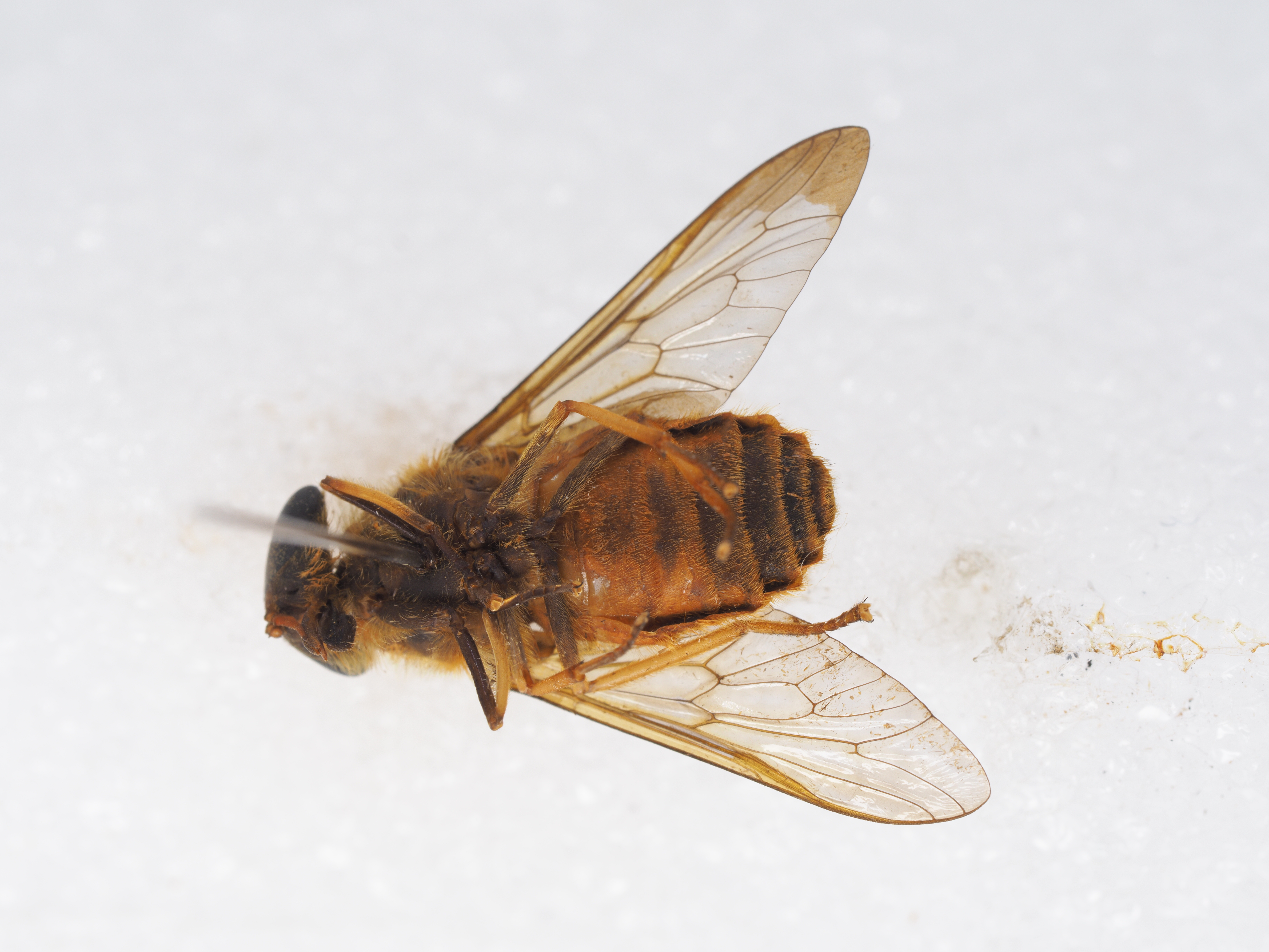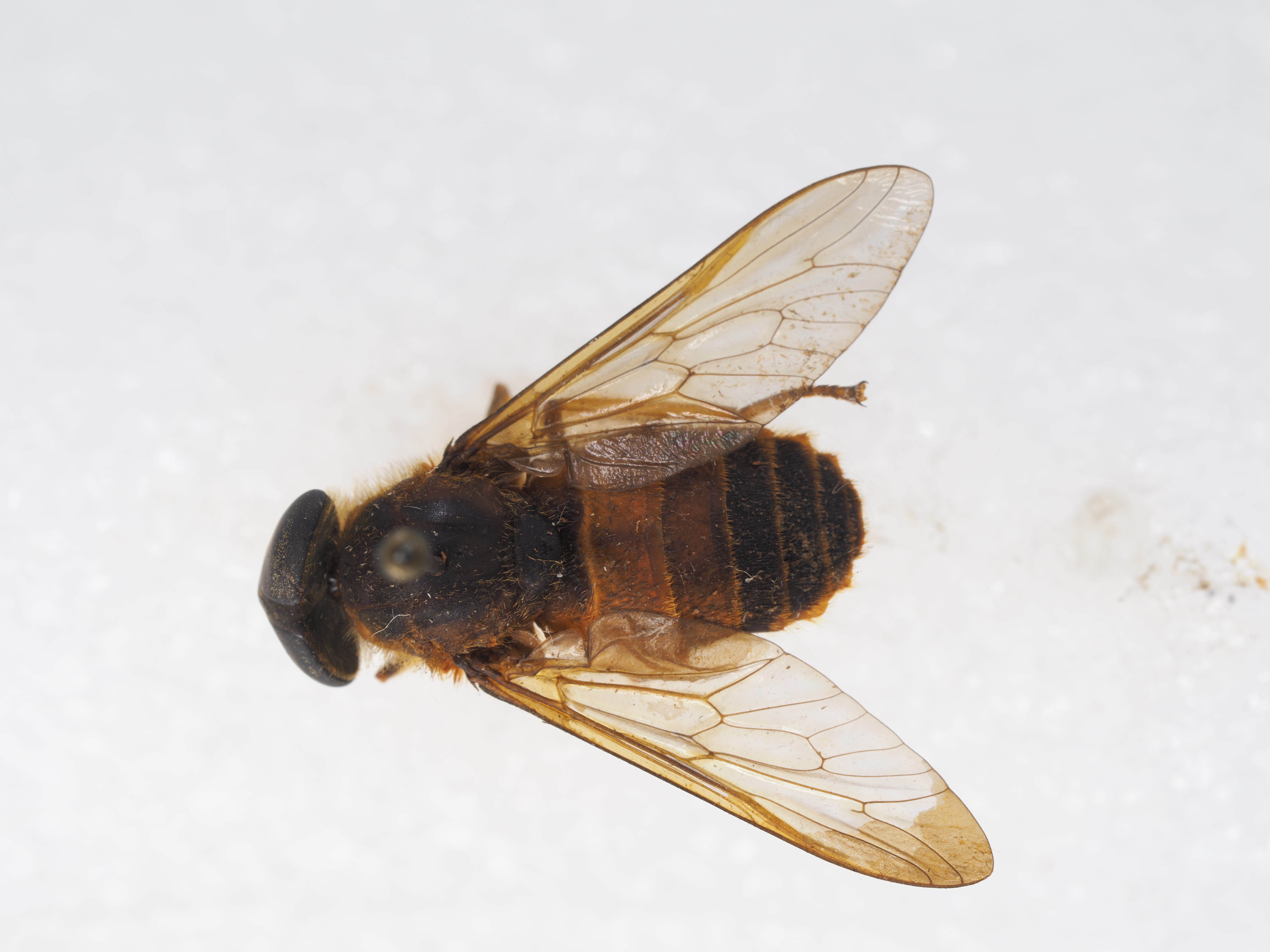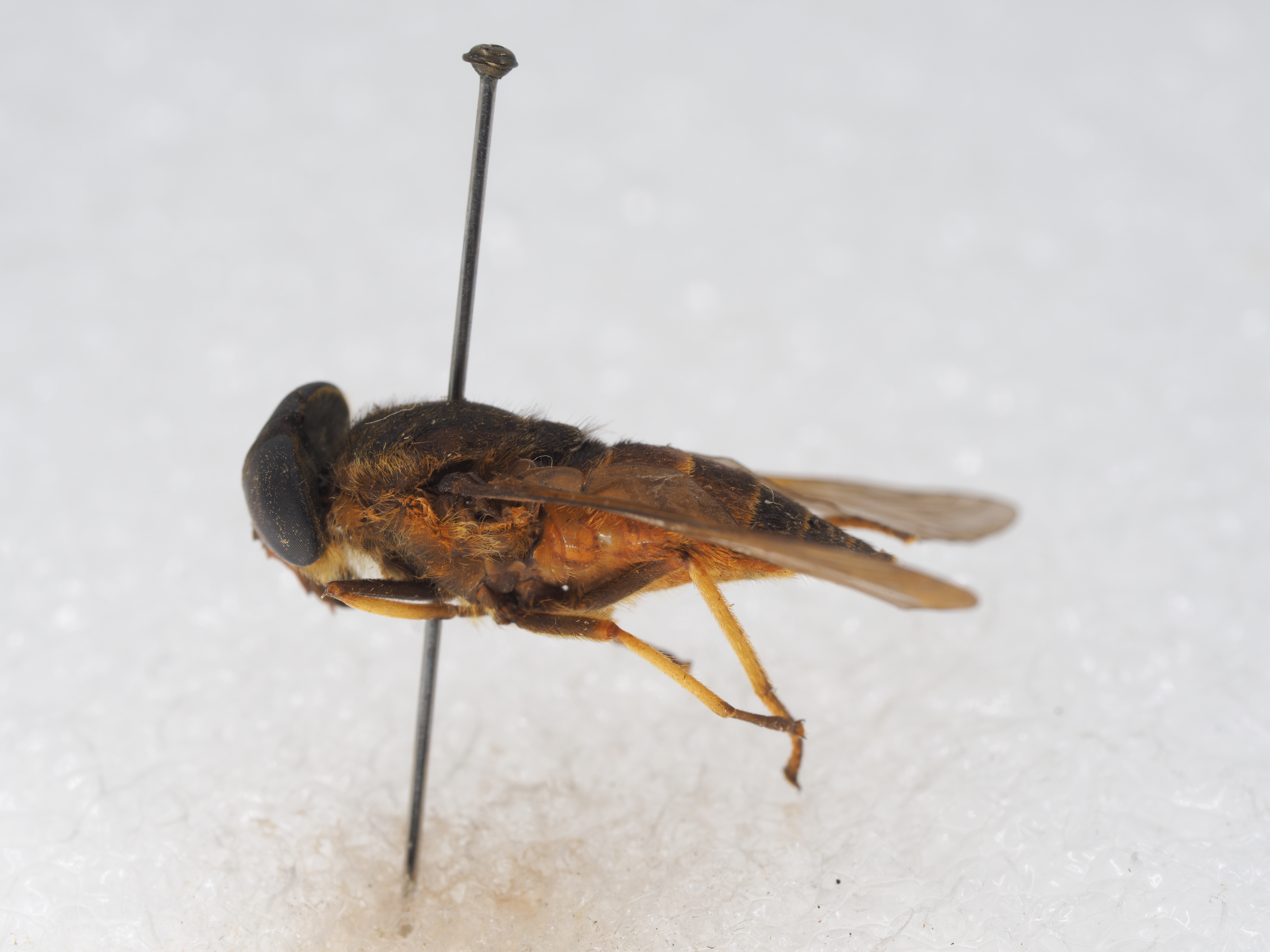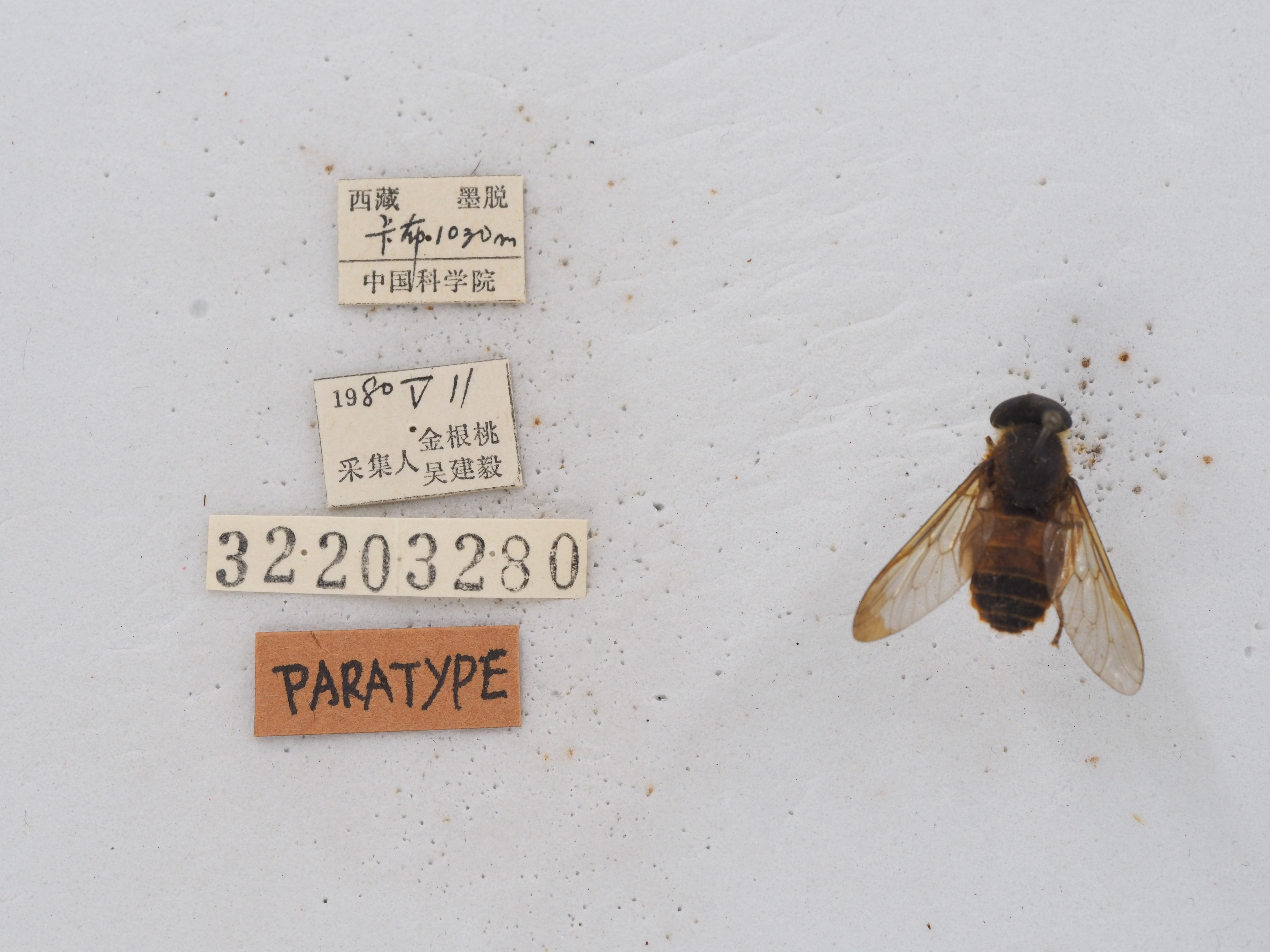 胸部盾片(suctum)及小盾片(scutellum)黑色,覆薄的棕色粉被,着生短黑毛及金黄毛多翅前胛棕色,着生黑毛及金黄毛;侧板灰黑色,着生黑毛及少量黄毛多翅透明,R5室在翅缘处开放;R4翅脉具附枝;足股节黑色,覆薄的黄粉被,着生黄毛,前胫节大部分棕黄色,着生黄毛,末端色深暗,着生黑毛,中、后胫节棕黄色,着生黄毛,跗节棕色,着生黒毛。