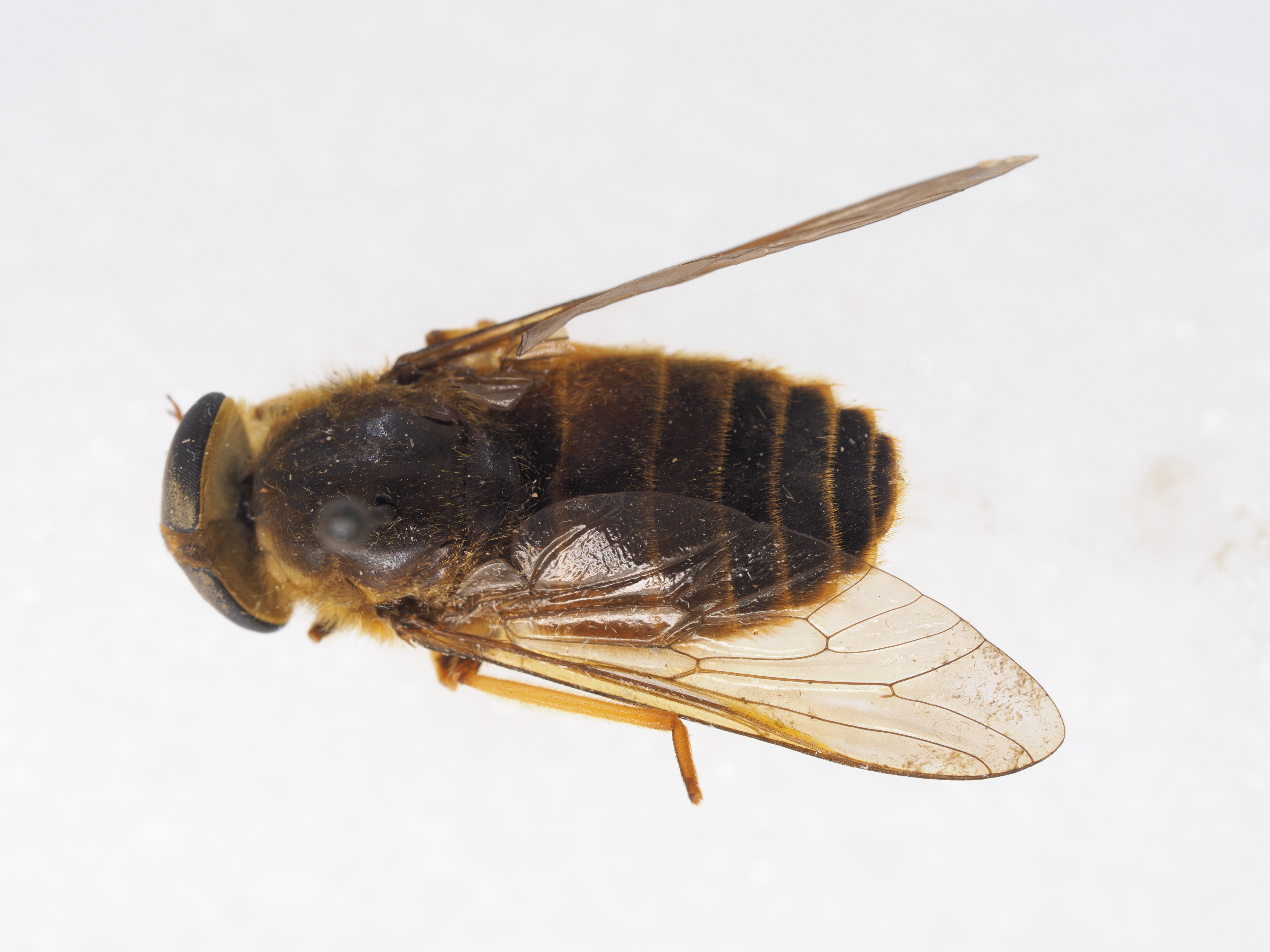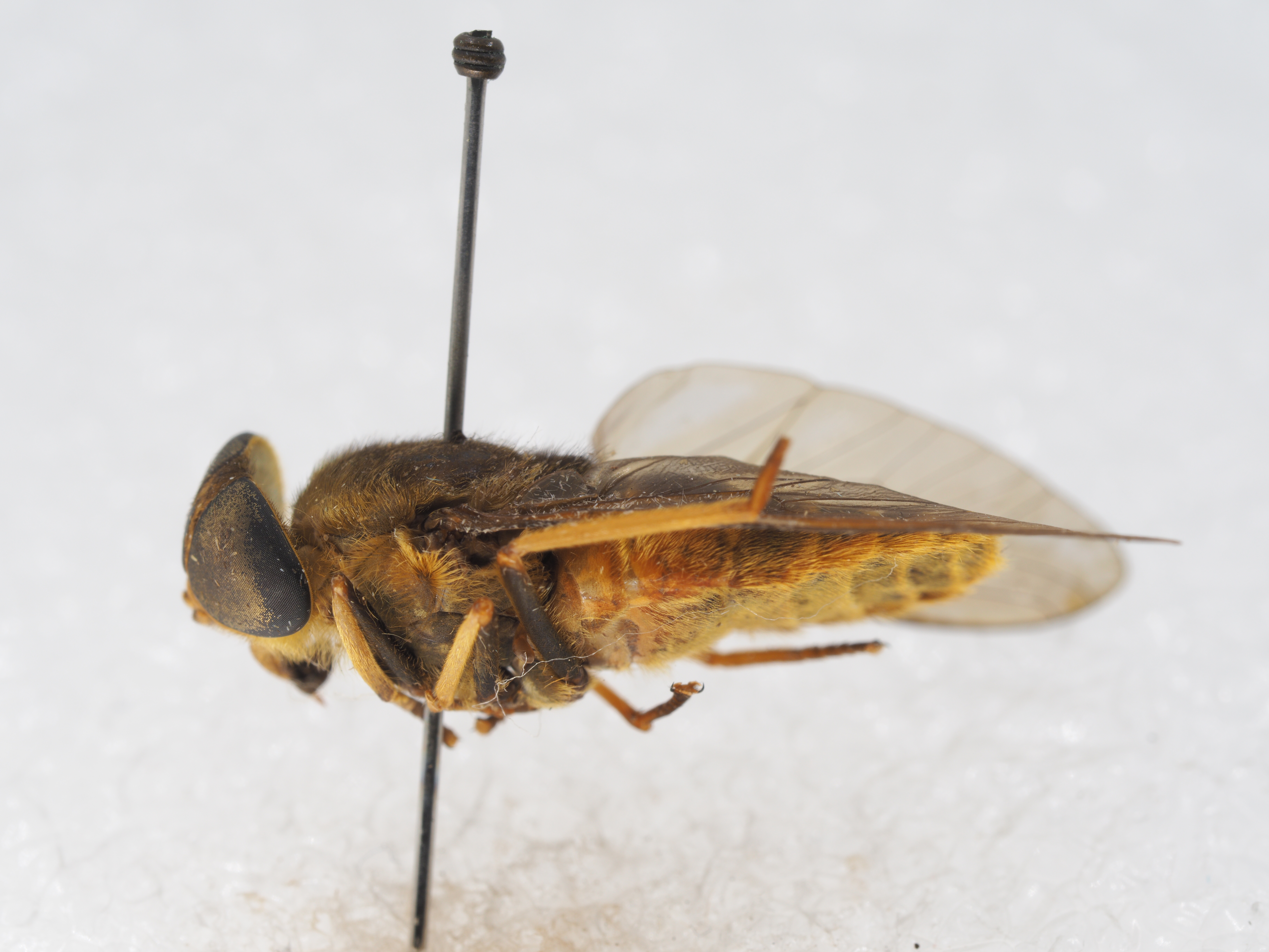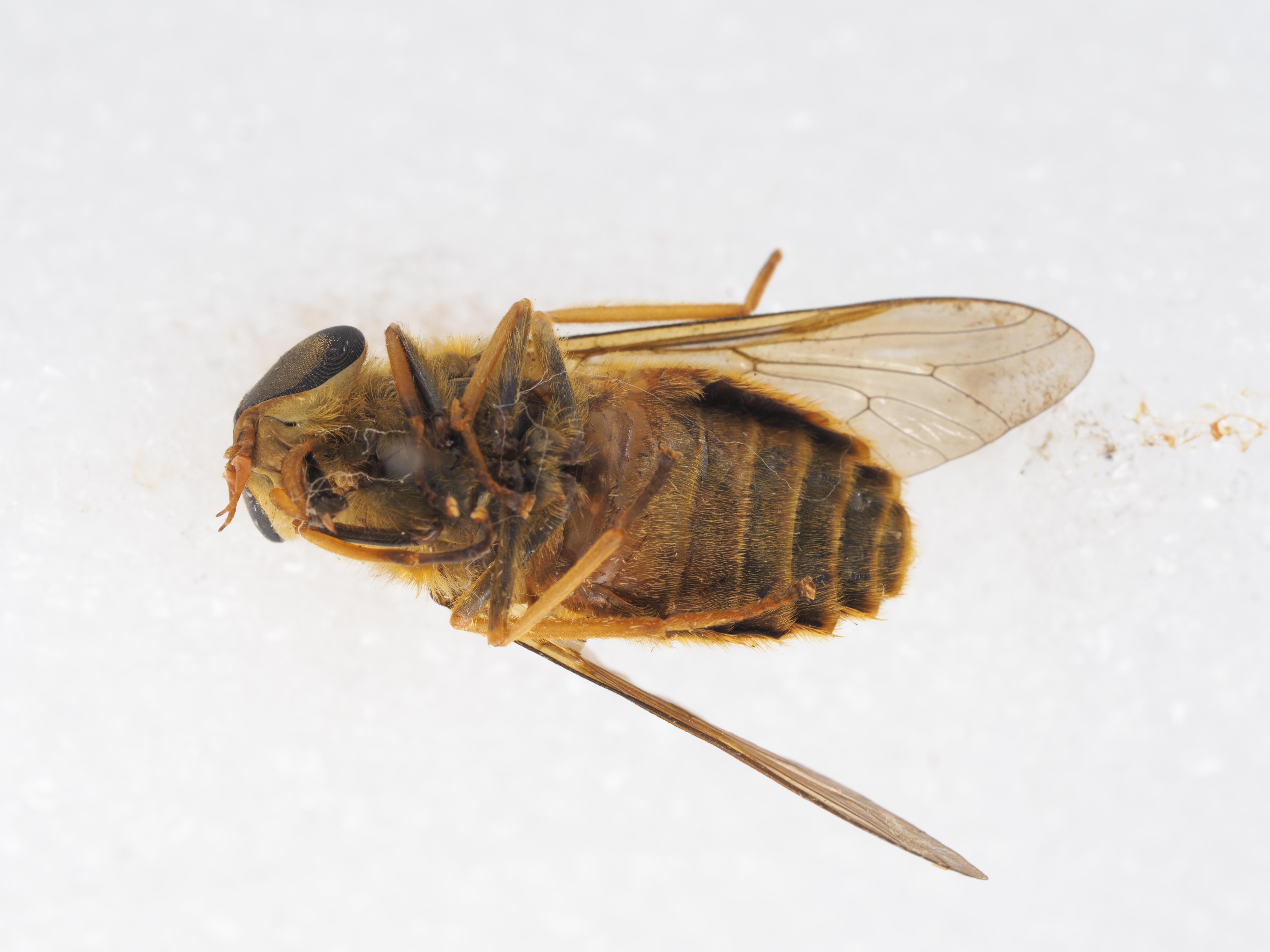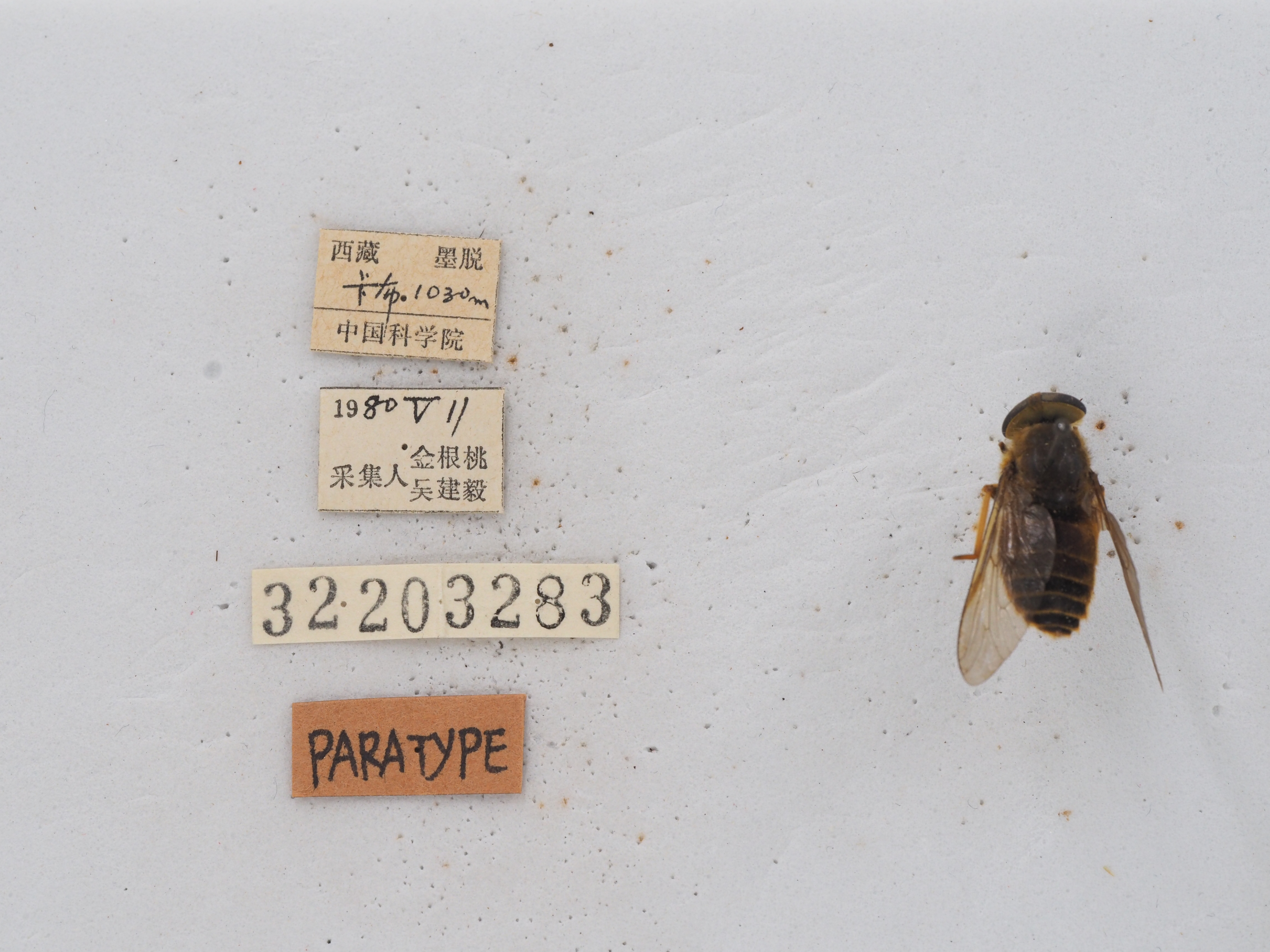 胸部盾片(suctum)及小盾片(scutellum)黑色,覆薄的棕色粉被,着生短黑毛及金黄毛多翅前胛棕色,着生黑毛及金黄毛;侧板灰黑色,着生黑毛及少量黄毛多翅透明,R5室在翅缘处开放;R4翅脉具附枝;足股节黑色,覆薄的黄粉被,着生黄毛,前胫节大部分棕黄色,着生黄毛,末端色深暗,着生黑毛,中、后胫节棕黄色,着生黄毛,跗节棕色,着生黒毛。