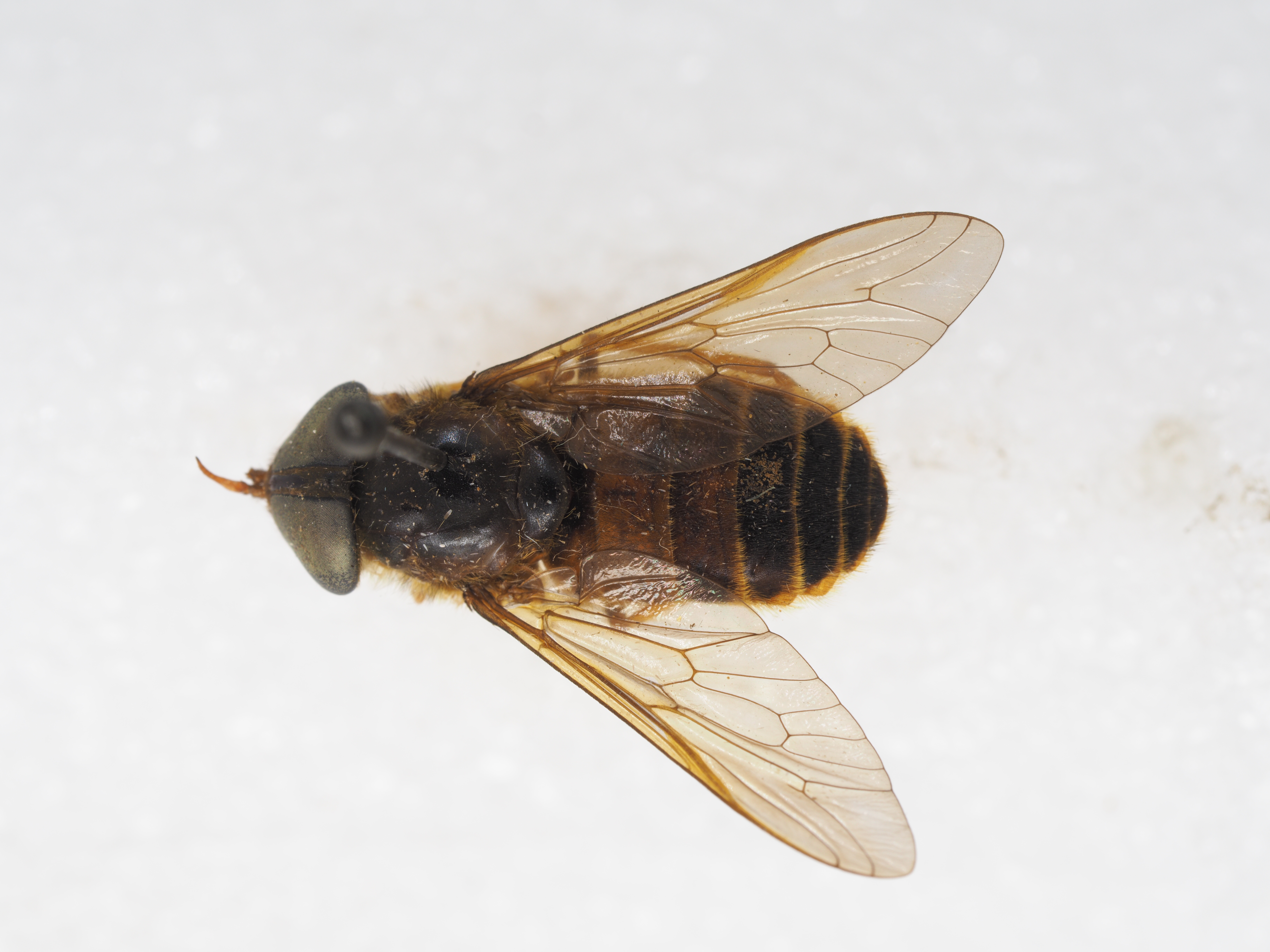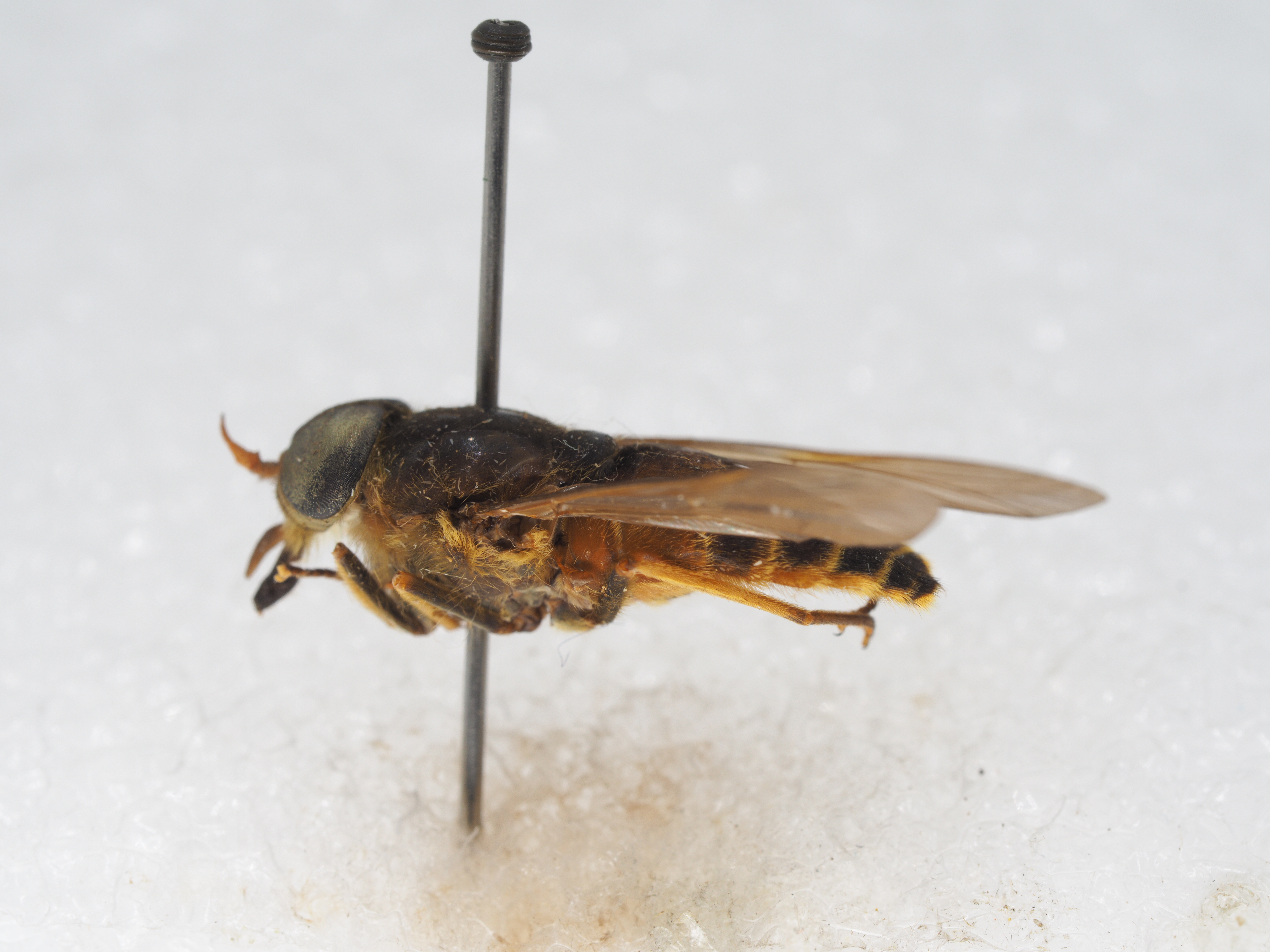 胸部盾片(suctum)及小盾片(scutellum)黑色,覆薄的棕色粉被,着生短黑毛及金黄毛多翅前胛棕色,着生黑毛及金黄毛;侧板灰黑色,着生黑毛及少量黄毛多翅透明,R5室在翅缘处开放;R4翅脉具附枝;足股节黑色,覆薄的黄粉被,着生黄毛,前胫节大部分棕黄色,着生黄毛,末端色深暗,着生黑毛,中、后胫节棕黄色,着生黄毛,跗节棕色,着生黒毛。