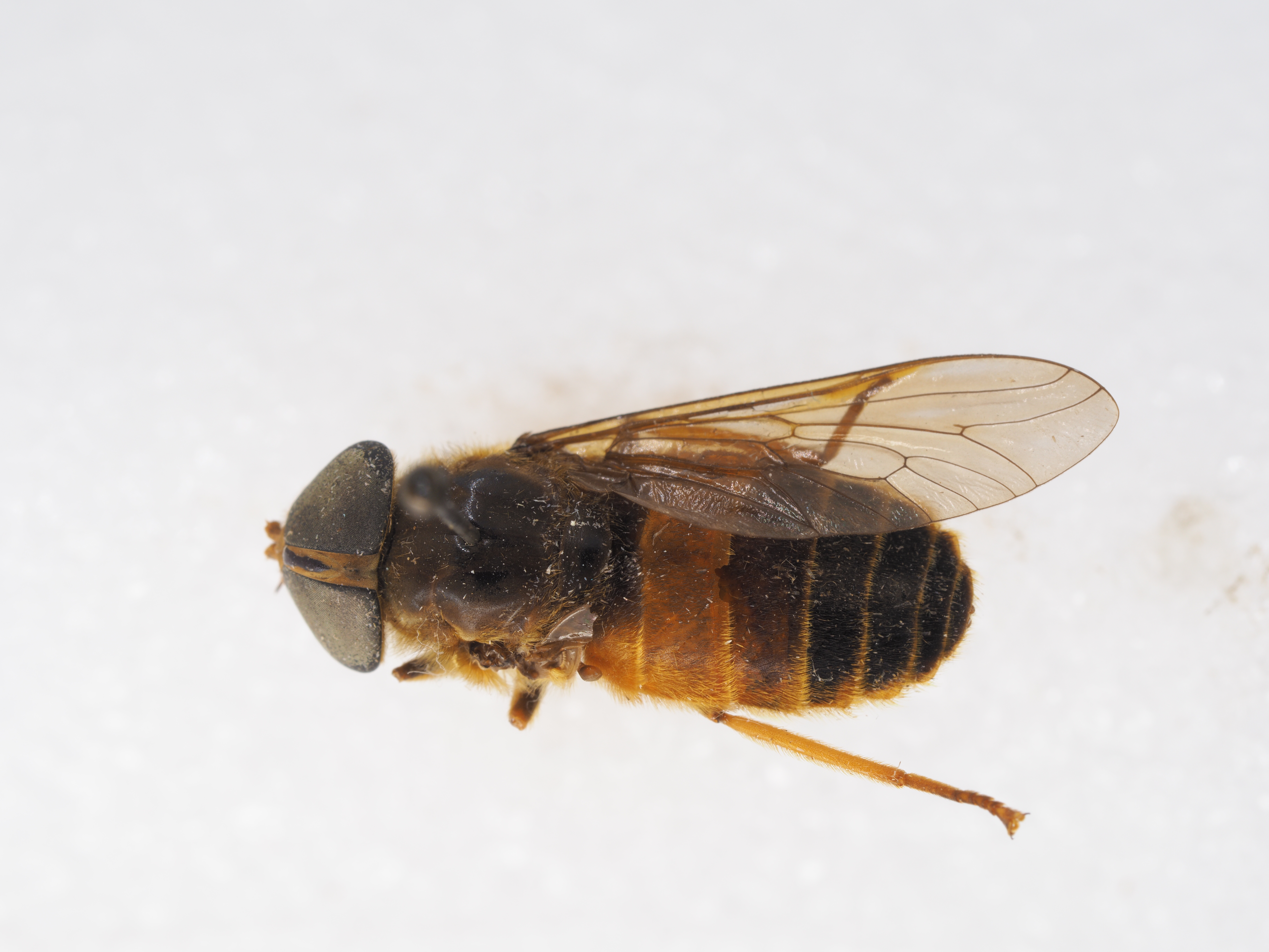 胸部盾片(suctum)及小盾片(scutellum)黑色,覆薄的棕色粉被,着生短黑毛及金黄毛多翅前胛棕色,着生黑毛及金黄毛;侧板灰黑色,着生黑毛及少量黄毛多翅透明,R5室在翅缘处开放;R4翅脉具附枝;足股节黑色,覆薄的黄粉被,着生黄毛,前胫节大部分棕黄色,着生黄毛,末端色深暗,着生黑毛,中、后胫节棕黄色,着生黄毛,跗节棕色,着生黒毛。