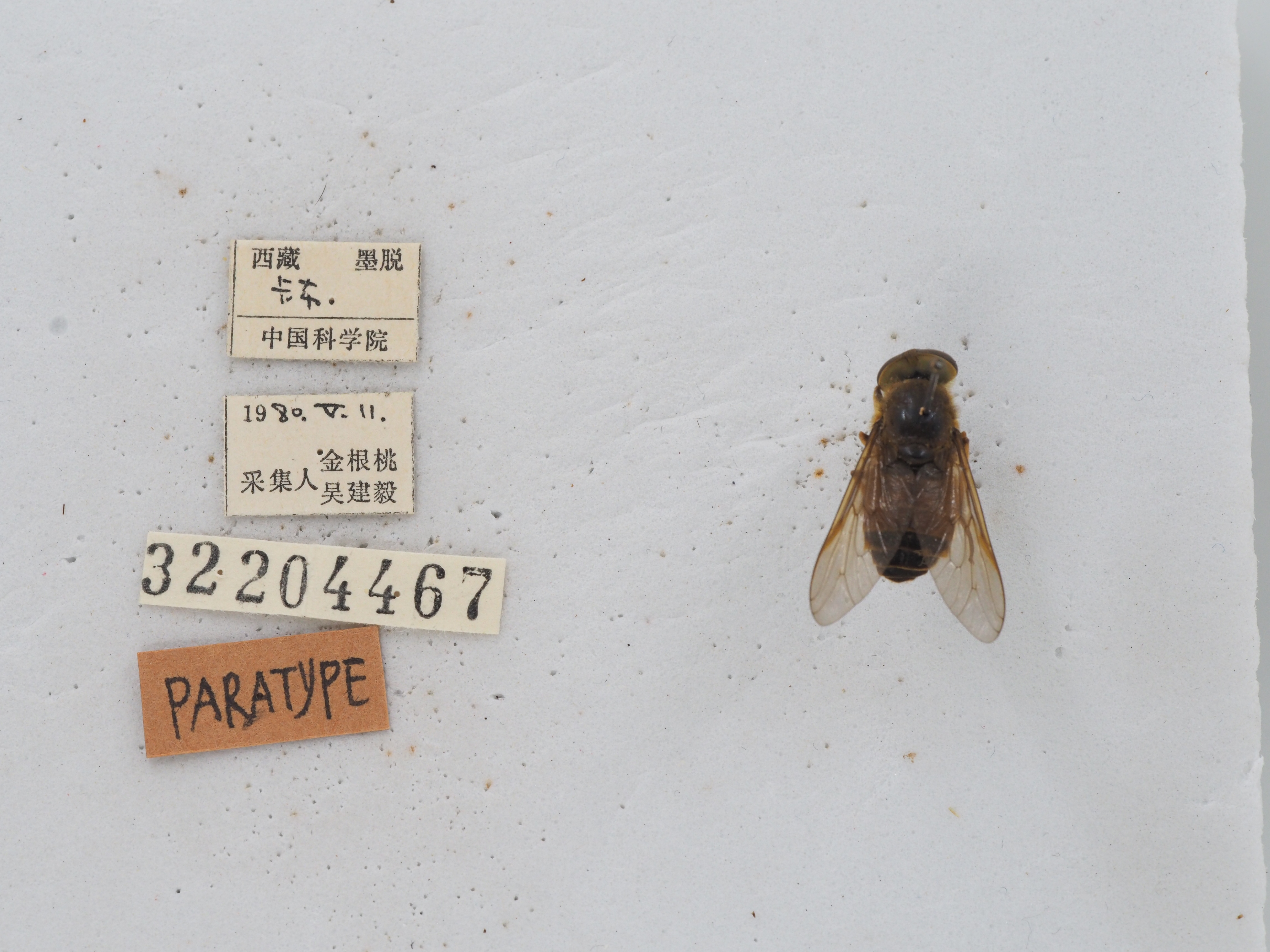 描述:雌虫体长17毫米。头部前额(frons)黑色,覆棕黄色粉被,顶部宽于基部,高约为基宽的5.5倍;基胛(basal callus)三角形,棕黑色,下缘有三个突出,中央一个突出与亚胛(subcallus)接触,两侧与眼分离;中胛(median callus)棒状,与基胛紧密接连;有的副模基胛下缘突起不明显,亚胛覆棕黄色粉被;颊(gena)上部及颜(face)覆棕黄色粉被,但浅于亚胛,颊下部灰黄色,着生黄毛,上部着生黑毛多触角第1、2节棕黄色,着生黑毛及少量黄毛,第3节棕红色,第1环节近基部有直角突,最末一个环节末端色暗;下颚须(palpi)第2节棕黄色,长约为最宽处4倍,密覆黑毛,副模夹少量黄毛。