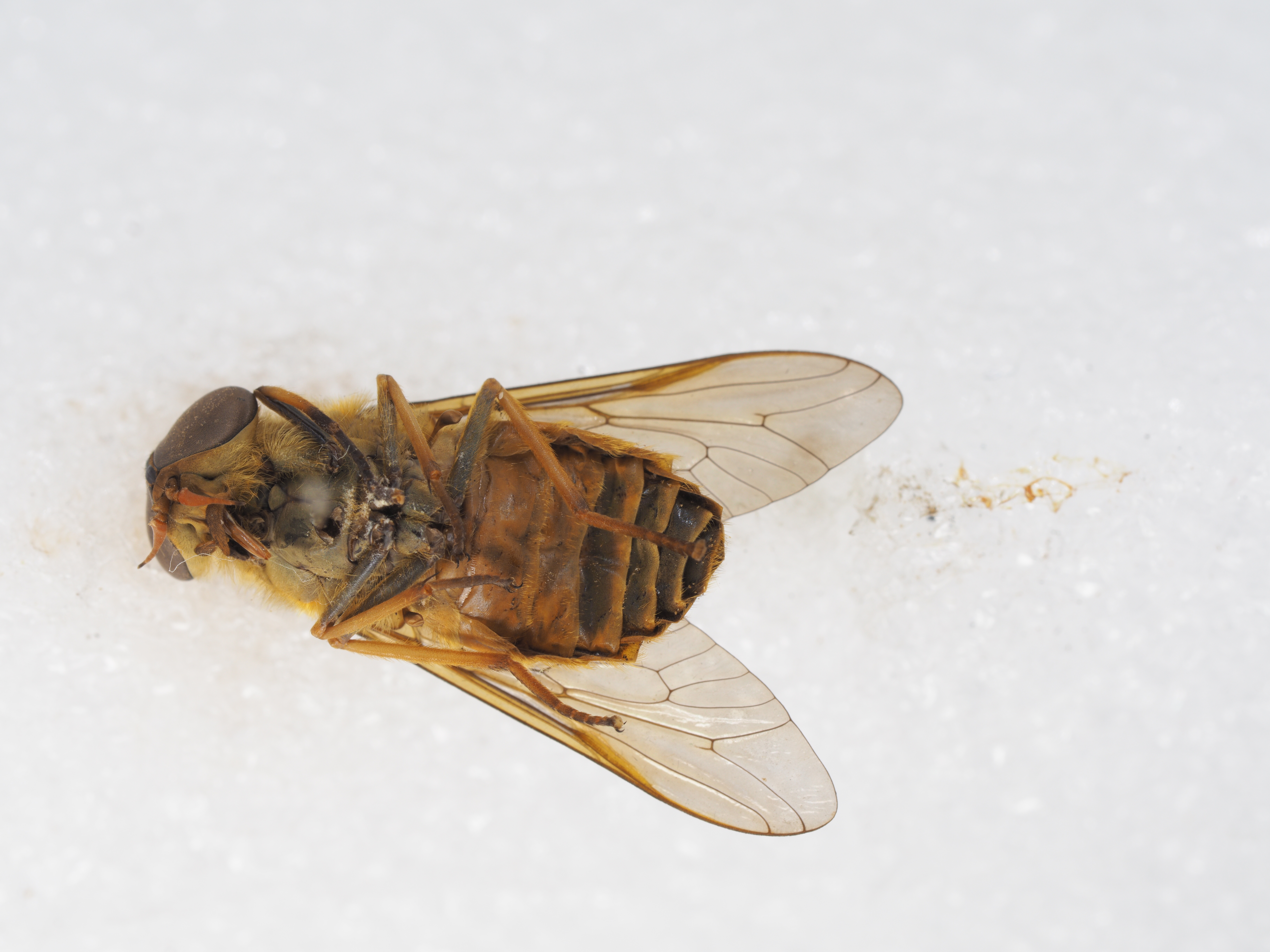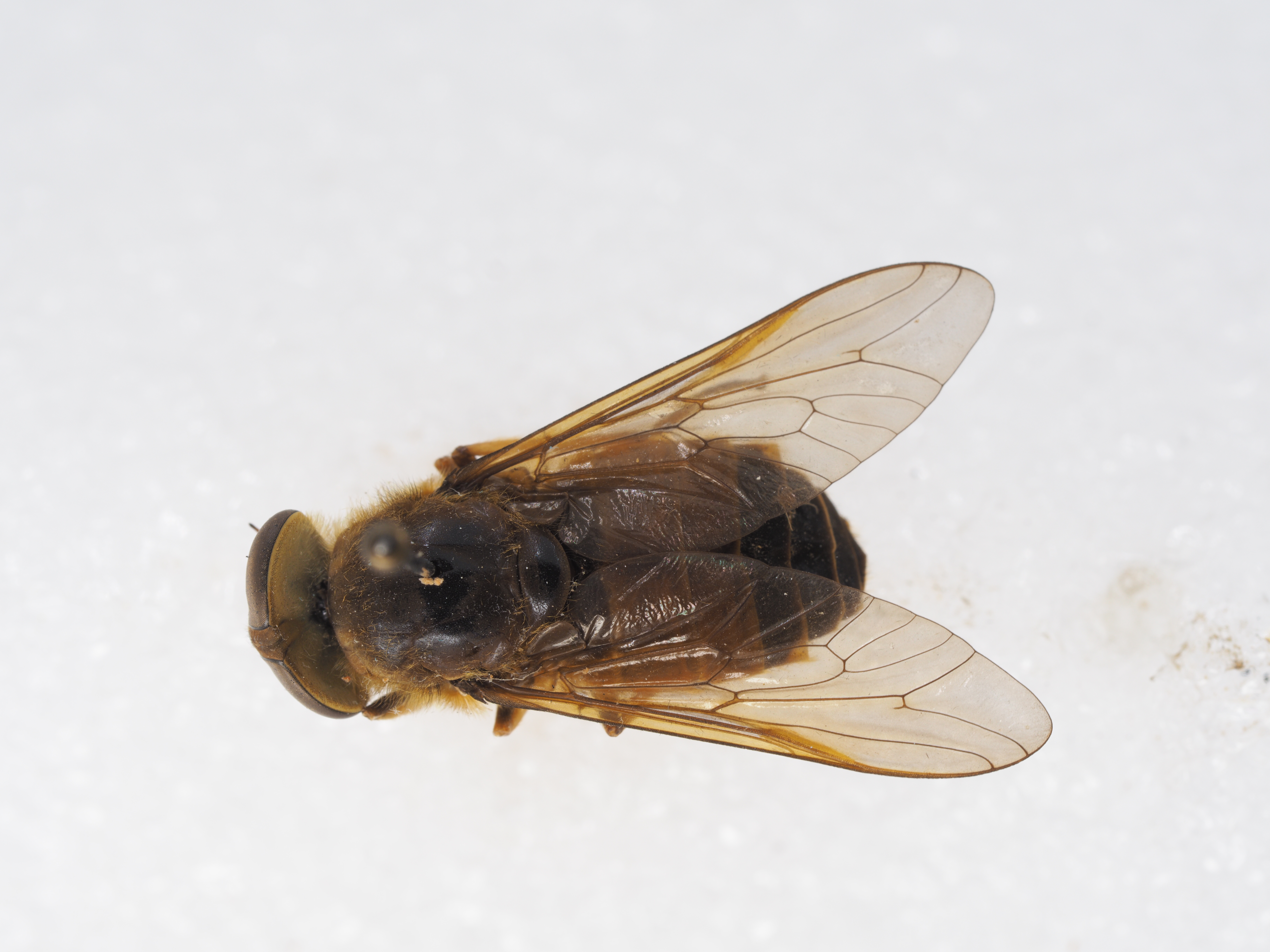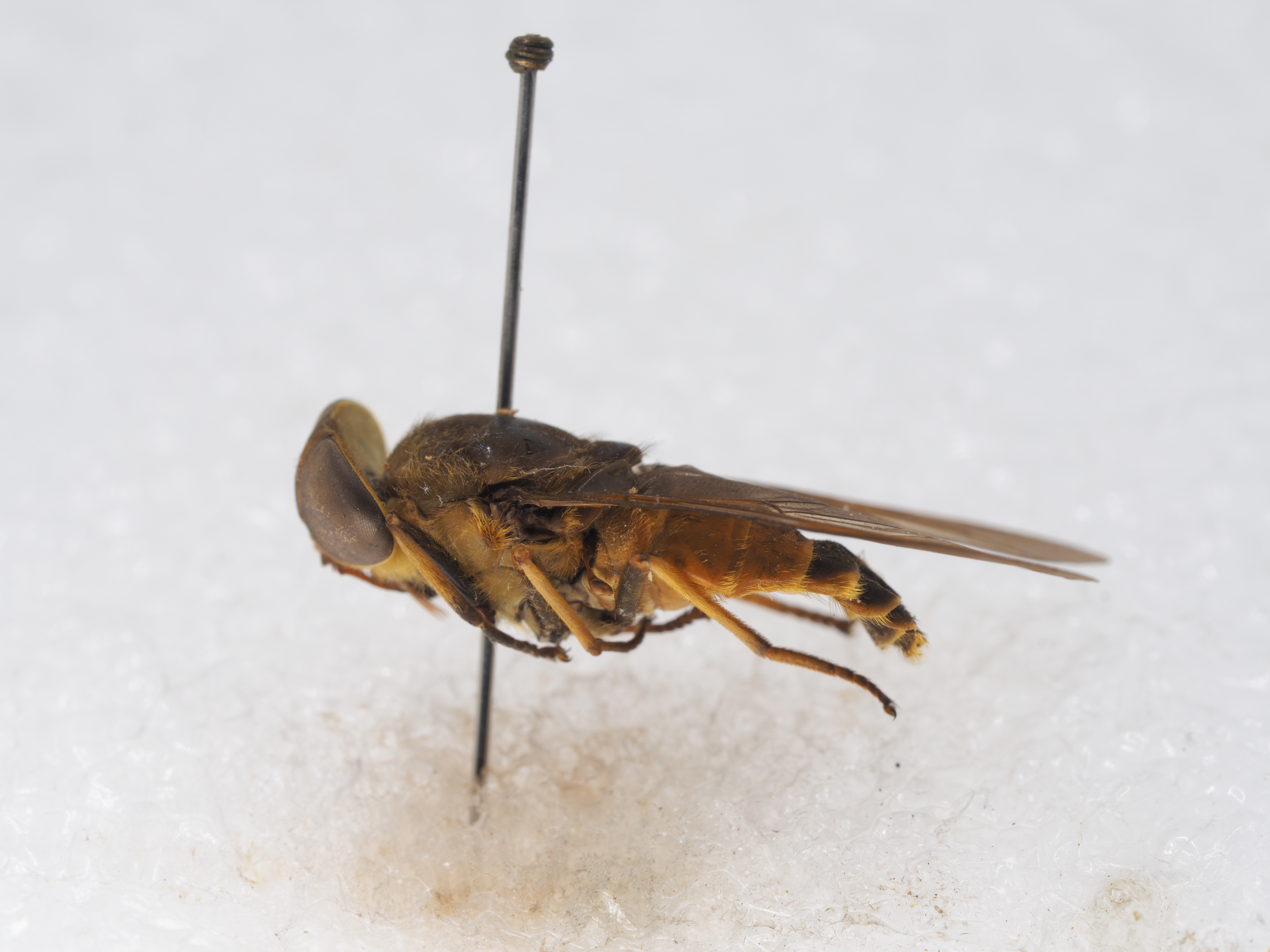 胸部盾片(suctum)及小盾片(scutellum)黑色,覆薄的棕色粉被,着生短黑毛及金黄毛多翅前胛棕色,着生黑毛及金黄毛;侧板灰黑色,着生黑毛及少量黄毛多翅透明,R5室在翅缘处开放;R4翅脉具附枝;足股节黑色,覆薄的黄粉被,着生黄毛,前胫节大部分棕黄色,着生黄毛,末端色深暗,着生黑毛,中、后胫节棕黄色,着生黄毛,跗节棕色,着生黒毛。