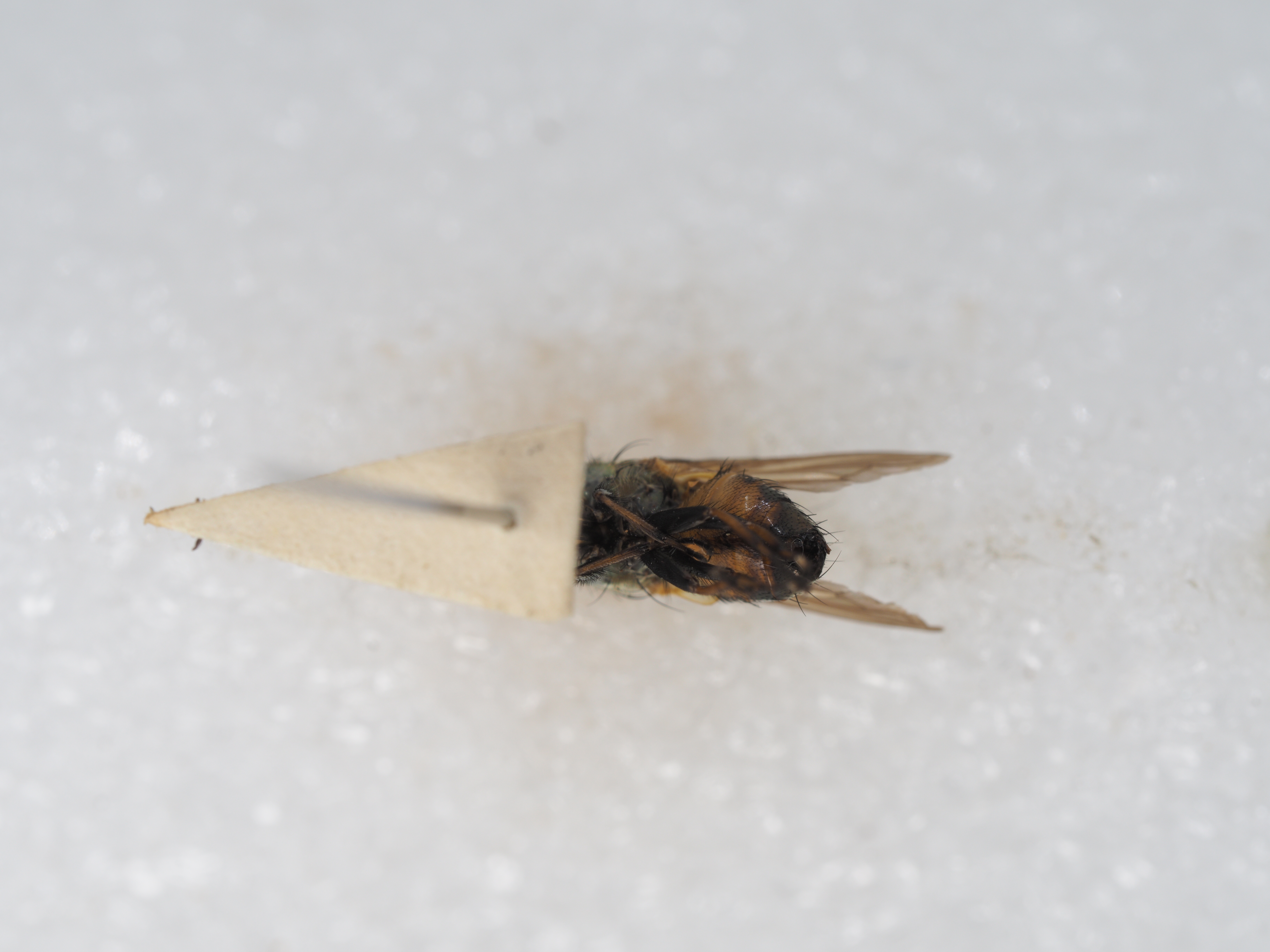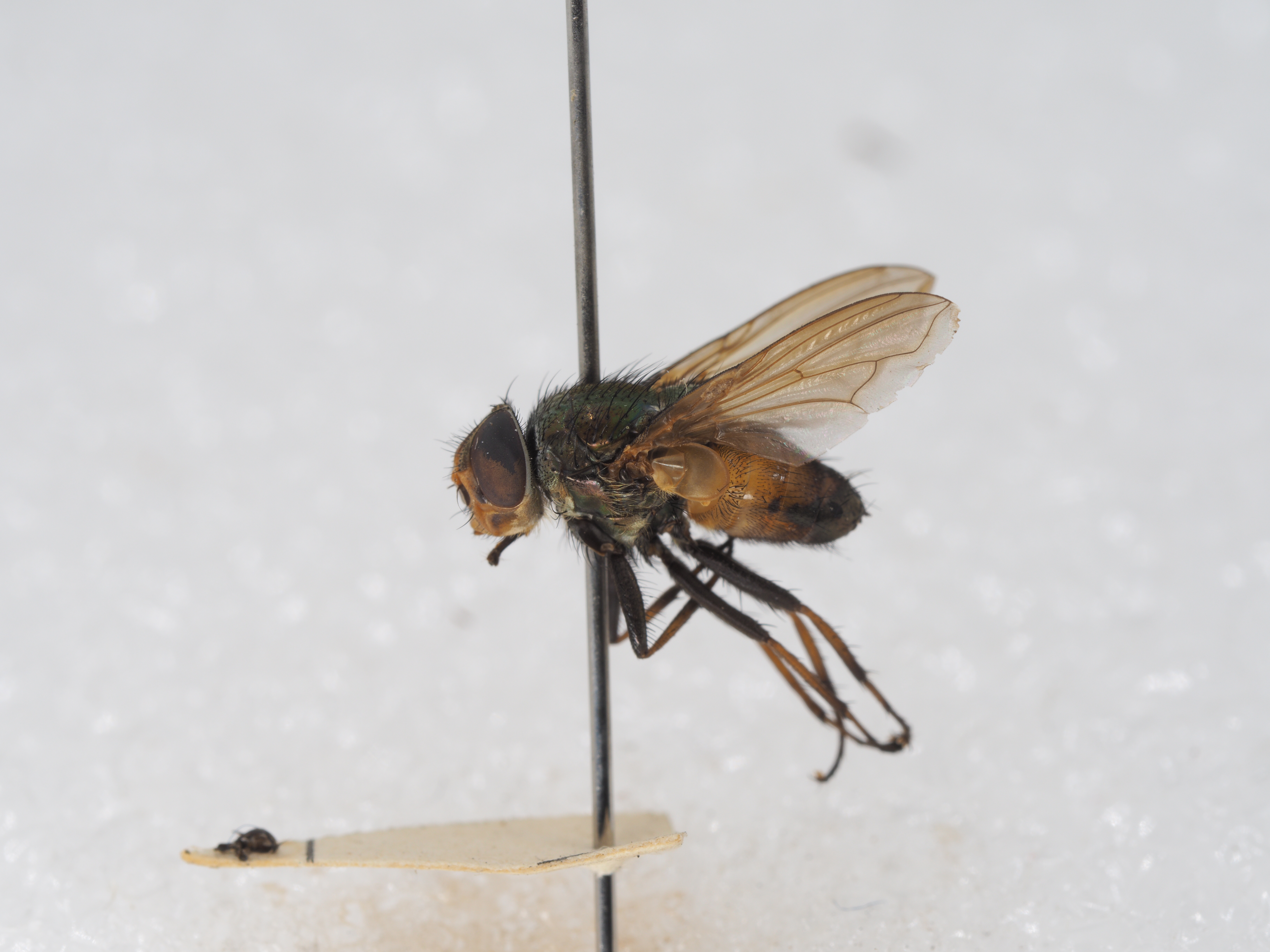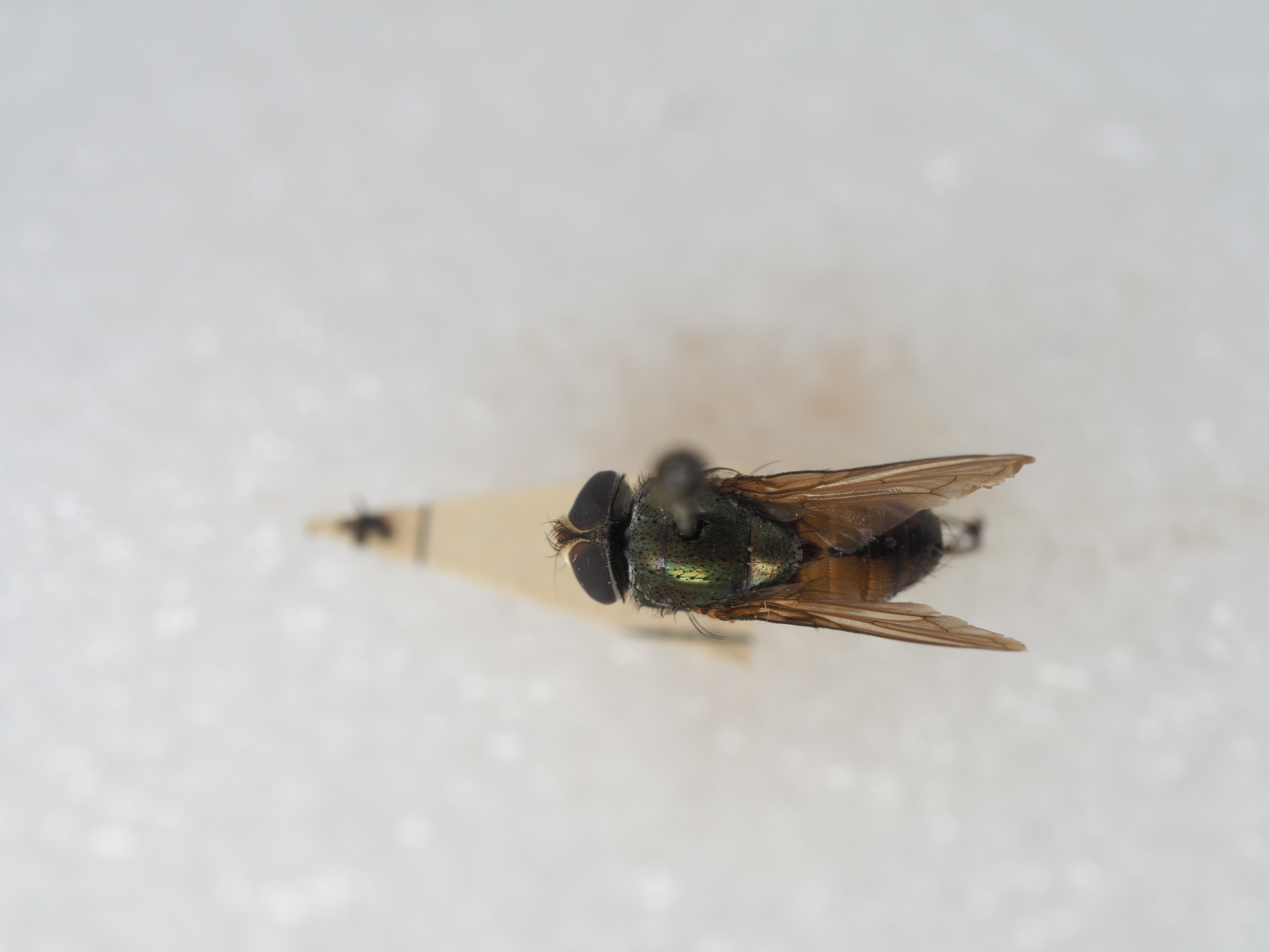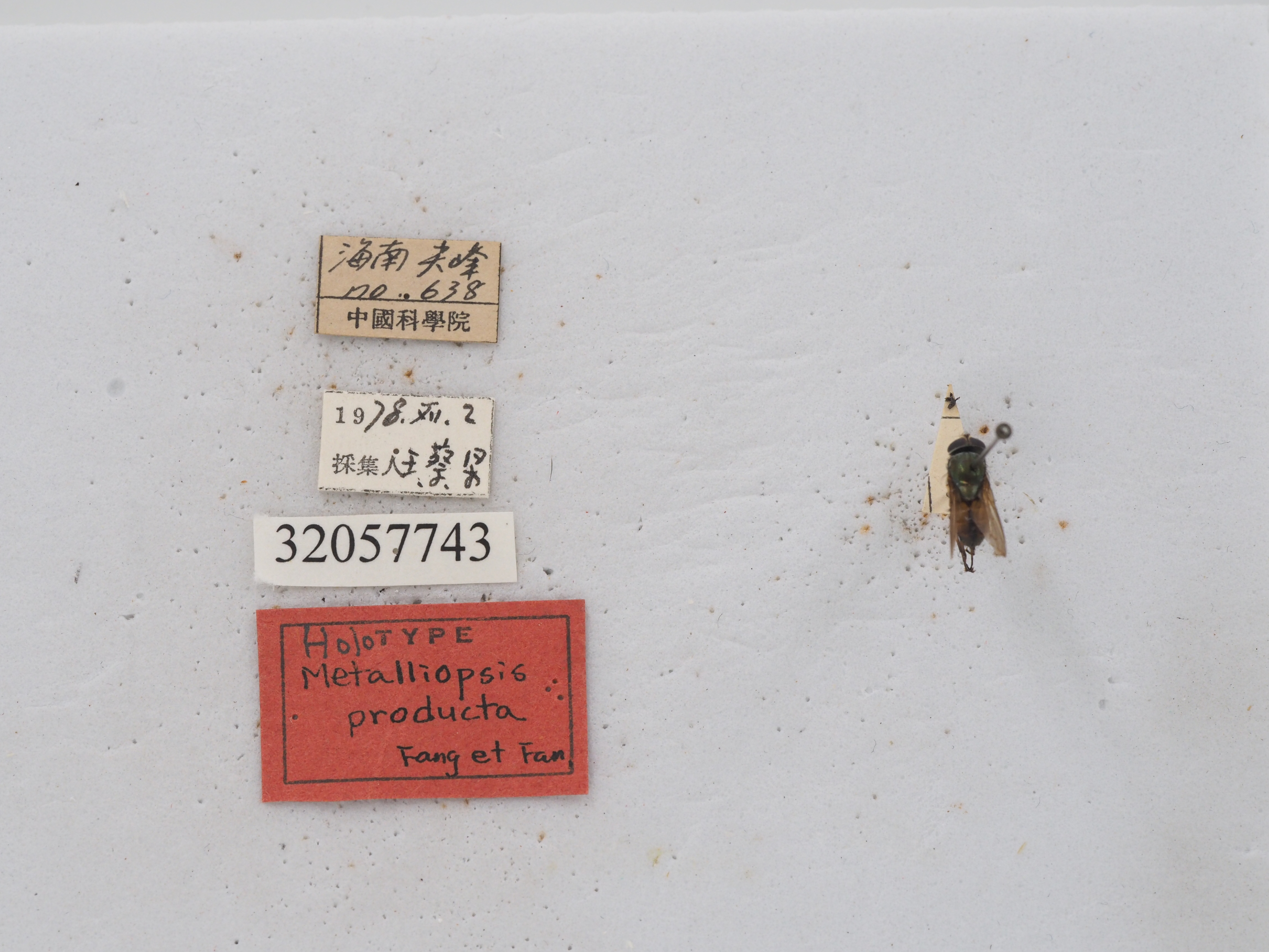 描述:雄:体长9毫米。头:额宽约为前单眼的2.6-3.0倍宽;间额黄褐色,侧额暗绿色且具灰黄色粉被;额鬃9个,侧额仅存小黑刚毛;侧颜(侧面观)中段宽约为触角第三节宽的2.5倍,侧颜有小熊刚毛多新月片裸;触角黄色,触角间楔存在,触角第三节外缘黒多触角芒毳毛状,其上最长毛仅大于芒基宽;颜面及颊均黄色;颊前半部无粉被,后半部具黄色粉被;喙黒;下颚须黄,末端略暗色。胸:金属绿色,具灰色粉被多中鬃1+(4一5),背中鬃2+4,翅内鬃1+3,肩鬃2,肩后鬃2。各侧片上具长而稀的黄白色毛,背侧片有小黑刚毛,中侧片上部有黑刚毛,腹侧片前部具少数黑毛多腹侧片上灰色粉被厚。翅透明烟黄色,前缘基鳞黄,m1+2脉弧形弯曲,径脉结节上小刚毛1-2个,决不超过结节;2R5室开放;上、下腋瓣均黄,平衡棒黄。股节黑,仅前足股节腹面微具金属绿色,胫节黄褐色,末端稍暗,第一分跗节黄褐,其余跗节黑;前足胫节有5一6个前背景,1个后腹鬃;中足胫节前背鬃、后背鬃各1,具2个后腹鬃;后足胫节具1列前背鬃(其中2个较长),后背鬃2-3个。