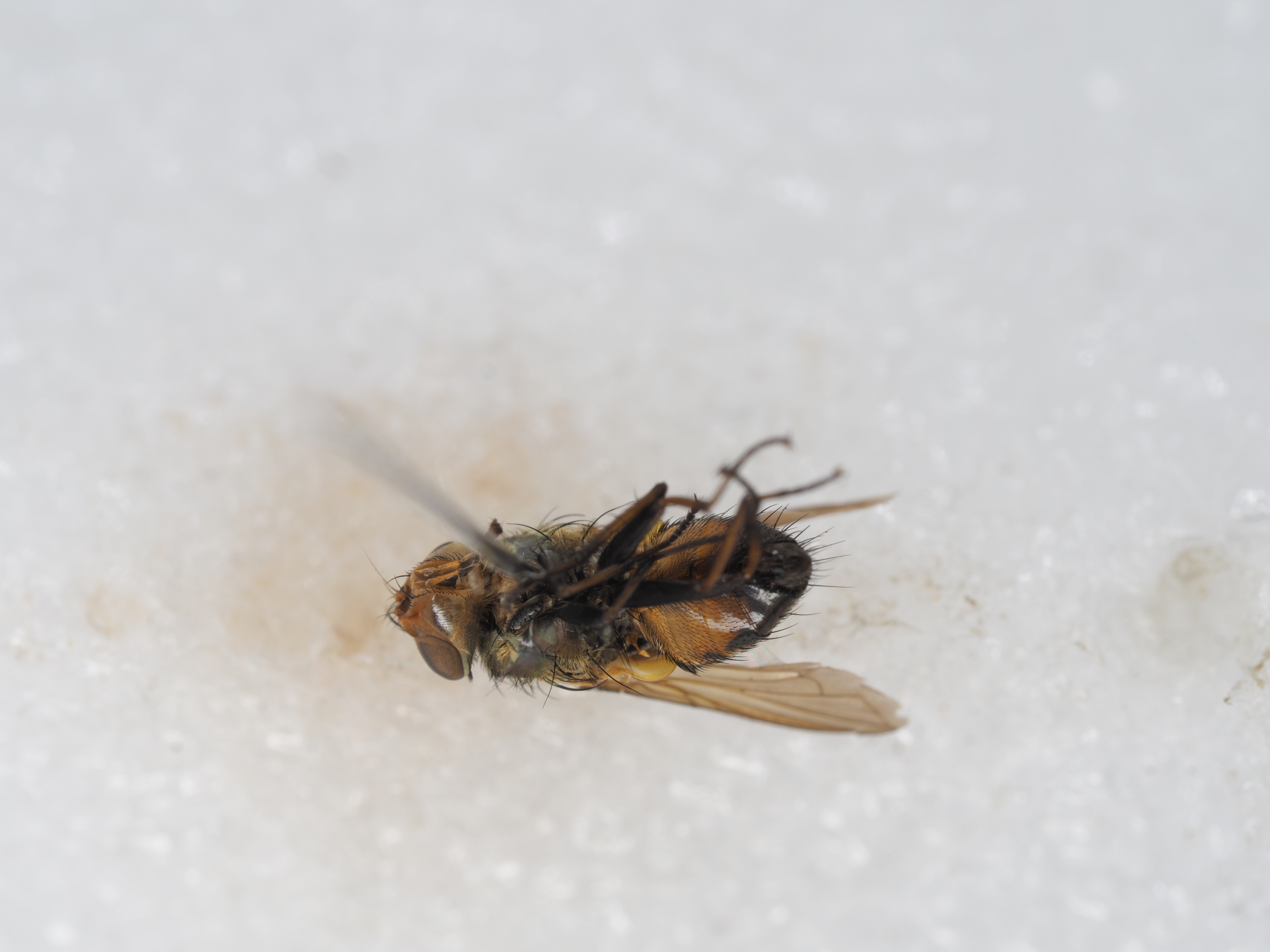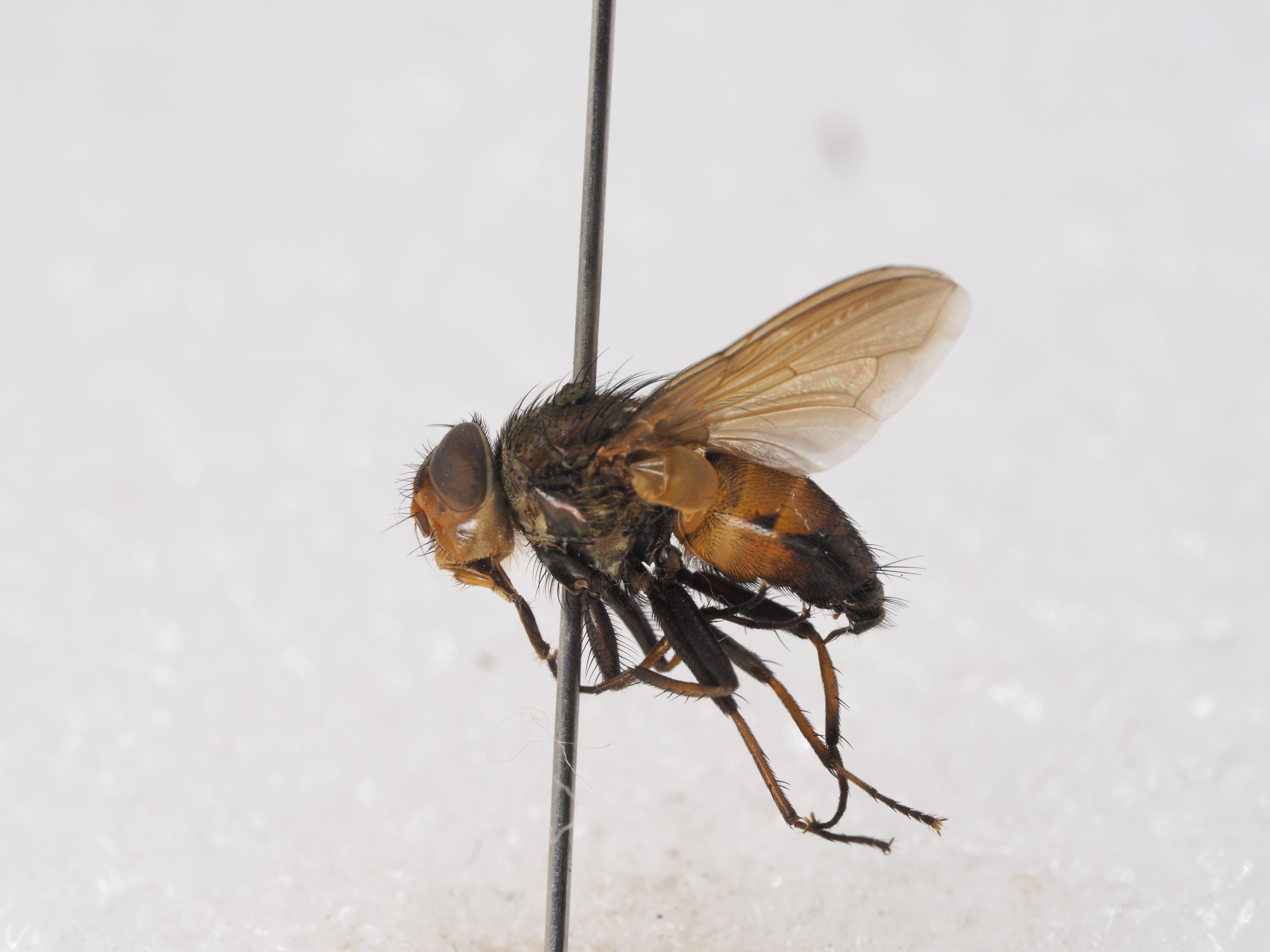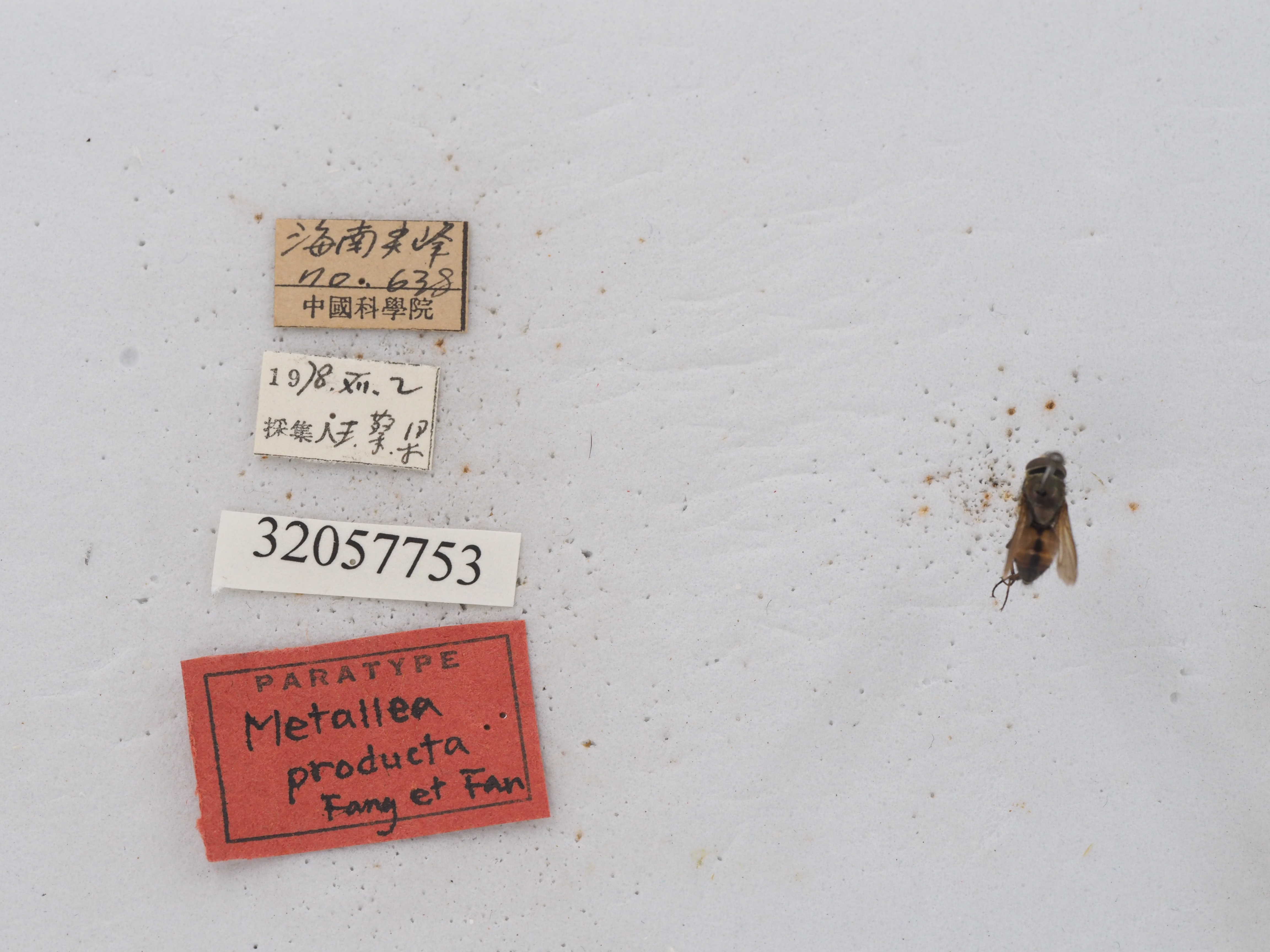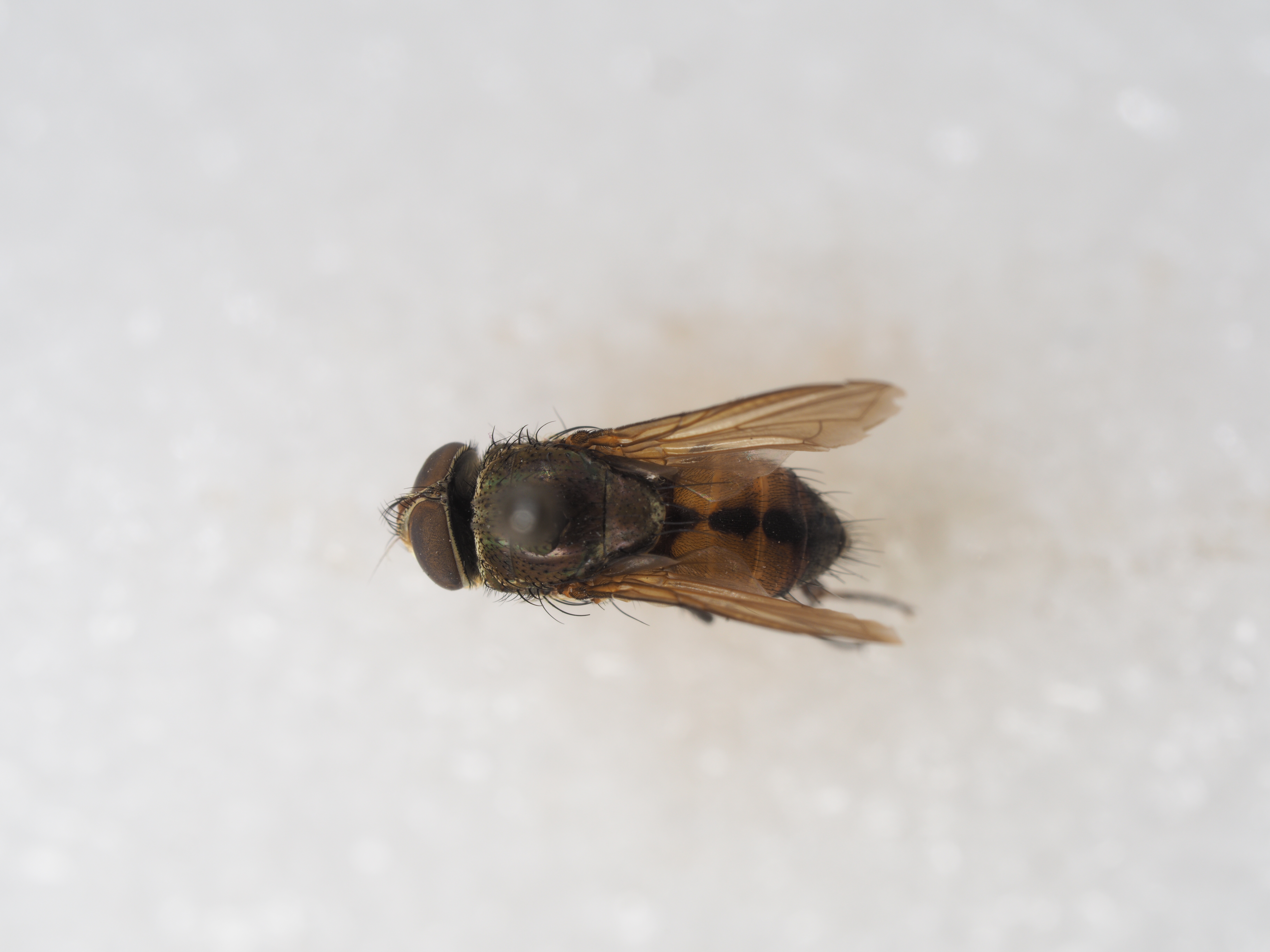 描述:雄:体长9毫米。头:额宽约为前单眼的2.6-3.0倍宽;间额黄褐色,侧额暗绿色且具灰黄色粉被;额鬃9个,侧额仅存小黑刚毛;侧颜(侧面观)中段宽约为触角第三节宽的2.5倍,侧颜有小熊刚毛多新月片裸;触角黄色,触角间楔存在,触角第三节外缘黒多触角芒毳毛状,其上最长毛仅大于芒基宽;颜面及颊均黄色;颊前半部无粉被,后半部具黄色粉被;喙黒;下颚须黄,末端略暗色。胸:金属绿色,具灰色粉被多中鬃1+(4一5),背中鬃2+4,翅内鬃1+3,肩鬃2,肩后鬃2。各侧片上具长而稀的黄白色毛,背侧片有小黑刚毛,中侧片上部有黑刚毛,腹侧片前部具少数黑毛多腹侧片上灰色粉被厚。翅透明烟黄色,前缘基鳞黄,m1+2脉弧形弯曲,径脉结节上小刚毛1-2个,决不超过结节;2R5室开放;上、下腋瓣均黄,平衡棒黄。股节黑,仅前足股节腹面微具金属绿色,胫节黄褐色,末端稍暗,第一分跗节黄褐,其余跗节黑;前足胫节有5一6个前背景,1个后腹鬃;中足胫节前背鬃、后背鬃各1,具2个后腹鬃;后足胫节具1列前背鬃(其中2个较长),后背鬃2-3个。