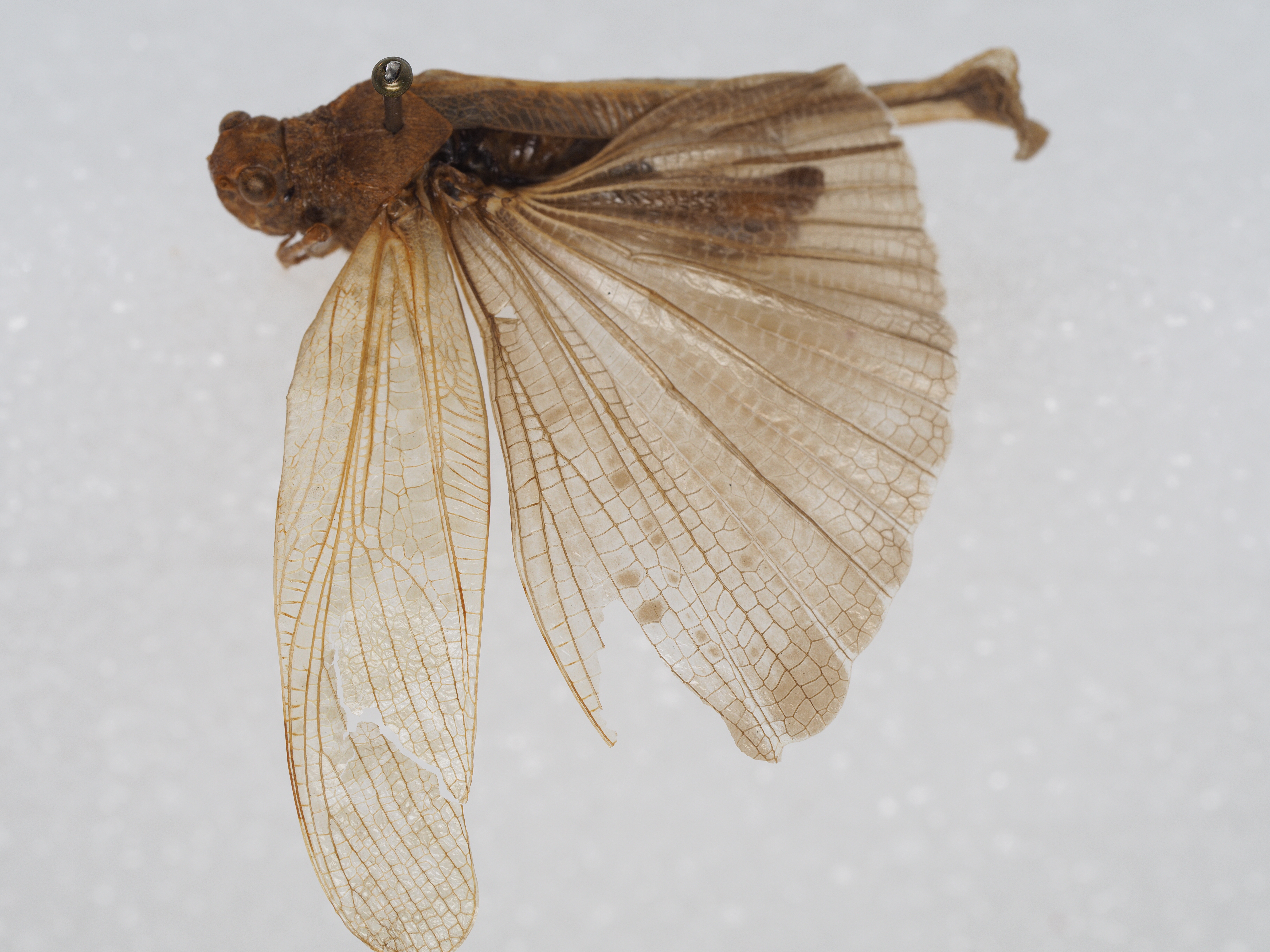 体色 淡褐黄色,具细小的暗色斑纹。复眼褐色。前翅淡黄色,略透明,具大小细碎淡褐色斑点,后翅外缘具极细的淡色边缘;后足股节外侧上隆线之下和下隆线之上具3个暗色横斑,在端部之前的淡色横带,基部的一个较大,端部2/3处较小,内侧上膝侧片褐色。后足胫节基部1/3处具一个淡褐色斑纹,胫节刺顶端暗色。
