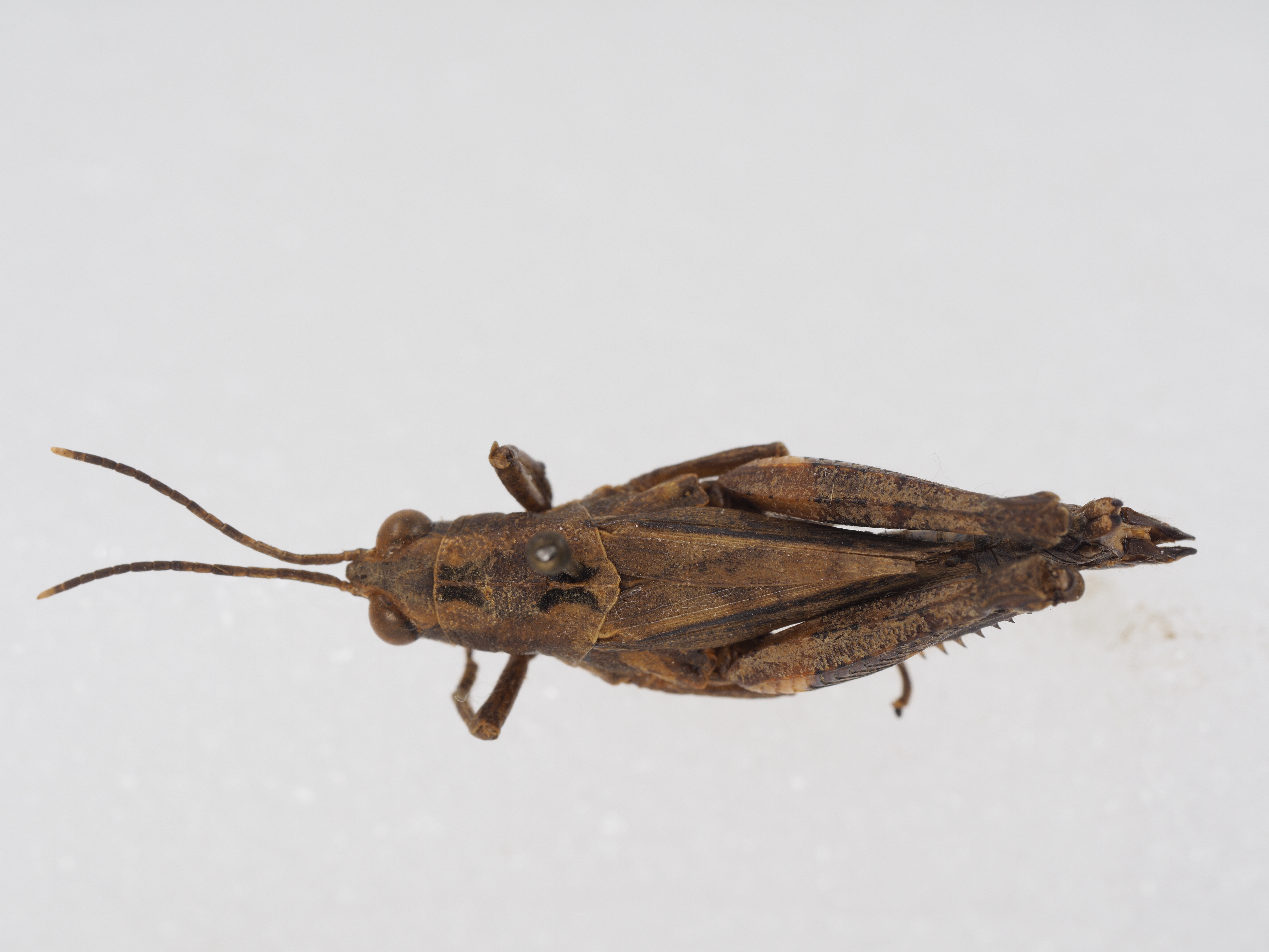体色:通常为淡褐色至黑褐色。头为淡黄色,背面具暗色纵条纹,复眼后具暗色斑纹。触角背面为淡褐色,底面为黑褐色。复眼为褐色。颜面在触角基部为黑褐色,在近上唇基具四方形黑色斑块。下颚须和下唇须均为黄色。前胸背板中央具一条黑纵纹,在沟前区的前部和沟后区各具近长方形黑丝绒斑纹。前翅在肘脉域之前为暗褐色。后足股节外侧基部具有一个倾斜的三角形黄色斑纹;下隆线中部具一小黄色斑块;膝前环淡色完整,但外侧略暗,内侧较淡。后足胫节为黑褐色,仅近基部具淡色环,有时端部外侧