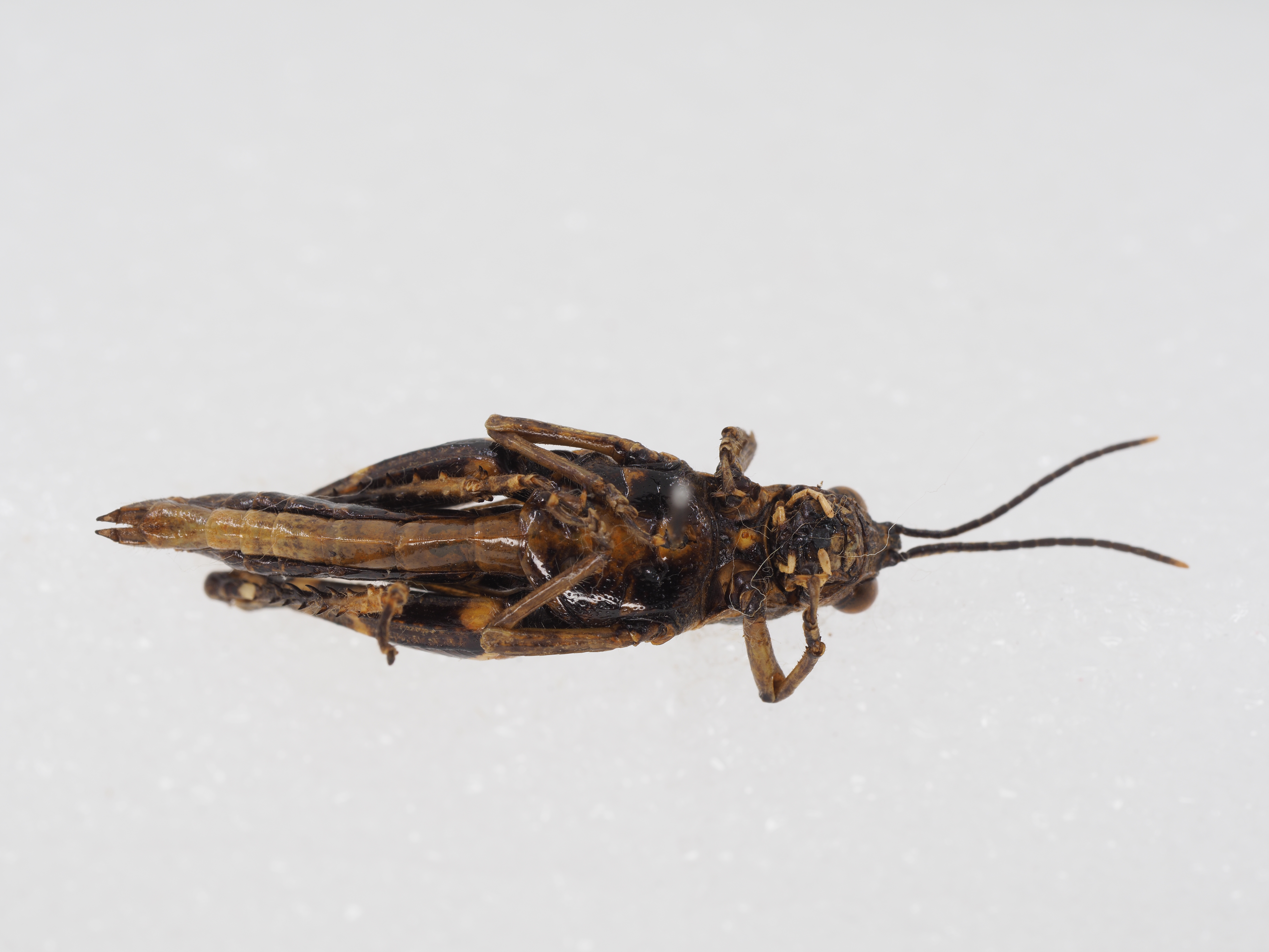 雌性 体较大于雄性。肛上板为长三角形,顶端较钝,基部纵沟终止于横隆线。尾须短圆锥形,顶端较钝,未到达肛上板顶端。上、下产卵瓣较直,顶端呈钝钩形,上缘缺齿。下生殖板长大于宽,后缘为锐角形突出。