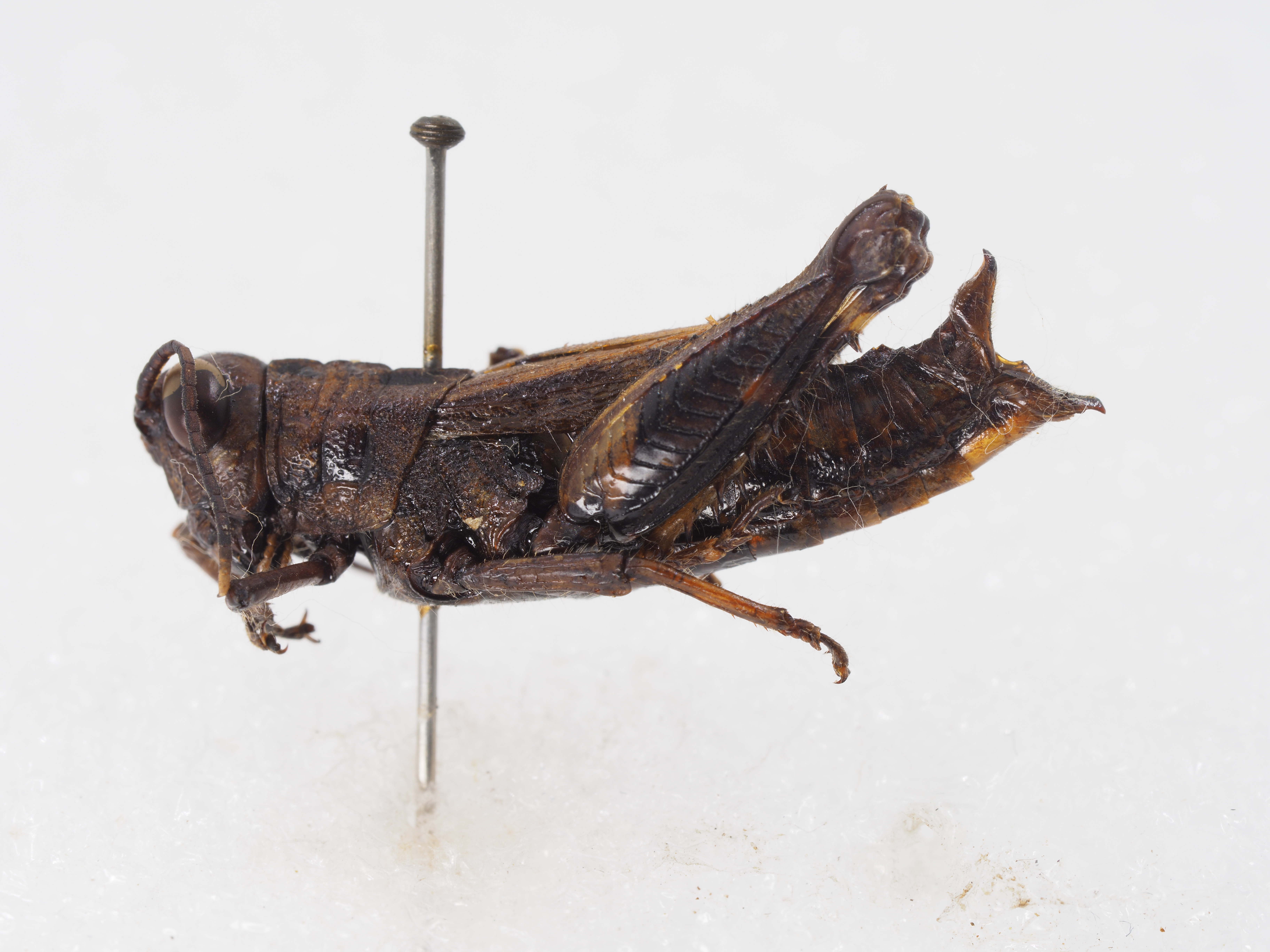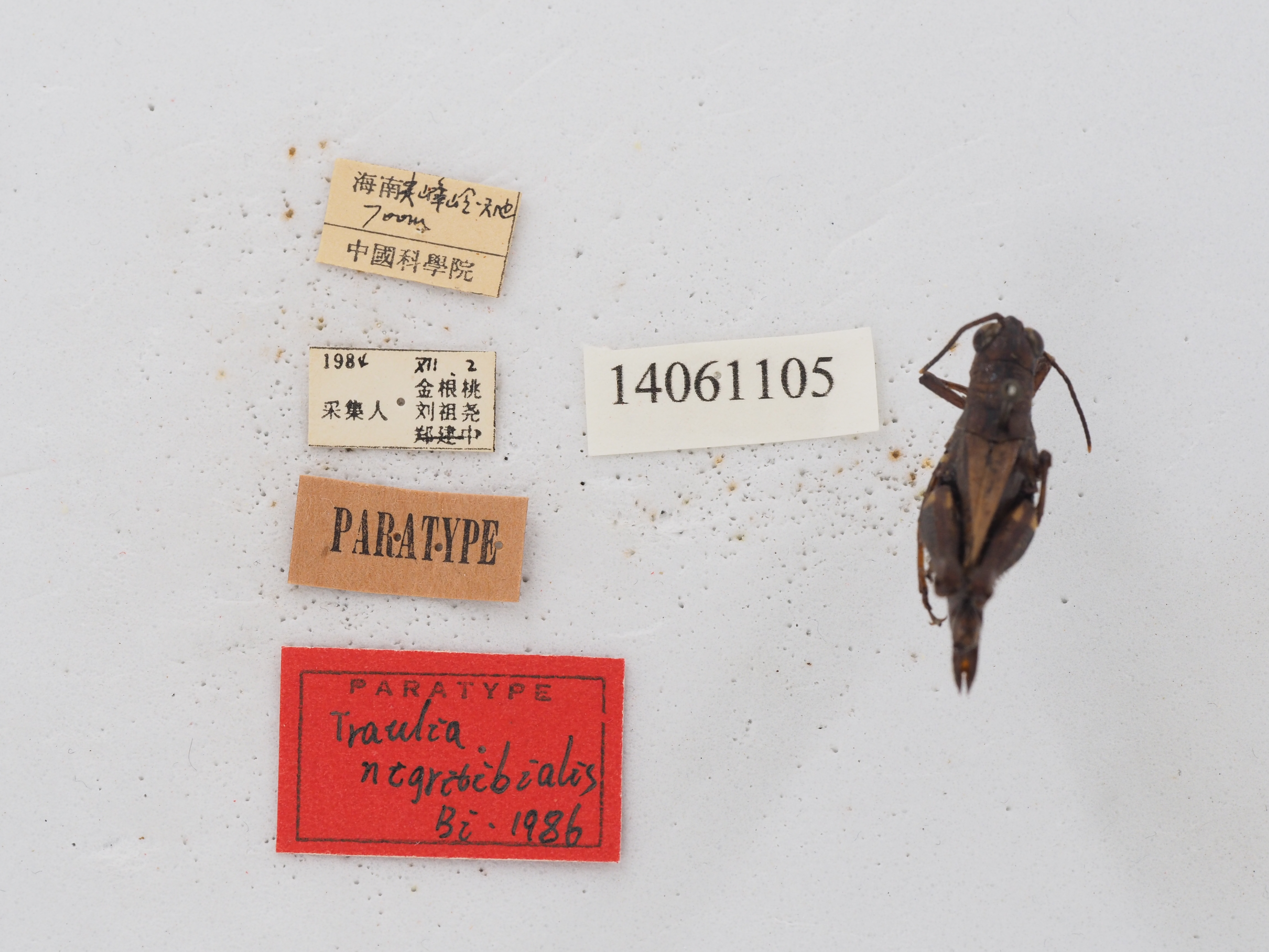 描述:雄性 体型中等,体表具粗刻点和皱纹。头大而短,较短于前胸背板。头顶向前倾斜,背面较低凹,颜面隆起在触角之间颇向前突出;其在复眼之间的宽度约为颜面隆起在触角之间宽度的2.2倍;全长具纵沟,两侧不平行,近上唇基略向外扩展;颜面侧隆线明显,略弯。复眼卵圆形,向外突出。触角丝状,21节,超过前胸背板的后缘,到达后足股节基部。前胸背板圆筒形,前缘较直,缺三角形凹口,后缘为钝角形向后突出;中隆线较隆起,全长明显;缺侧隆线;3条横沟明显深切中隆线,沟前区较长,约为沟后区长的1.6倍。前胸腹板突为圆锥形,顶端较钝。中胸腹板侧叶间之中隔较宽,其宽度大于长度;后胸腹板侧叶较宽地分开。前、后翅较短,到达或超过后足股节中部。后足股节略粗壮,上隆线具细齿;下膝侧片端部为圆弧形。后足胫节略弯,端部不扩大,缺外端刺,胫节刺外缘具刺7个,内缘具刺7~8个(包括端刺)。腹部向上翘起,腹部末节背面后缘中央两侧各具一个小点状尾片。肛上板为盾形,顶端略锐,基部中央较低凹,两侧中部各具一个较高的突起。尾须侧扁,基部较宽,端部呈刀状,中央略狭,其长超肛上板的端部。下生殖板短锥形,向上翘。阳具基背片和阳具复合体见图257d~e。