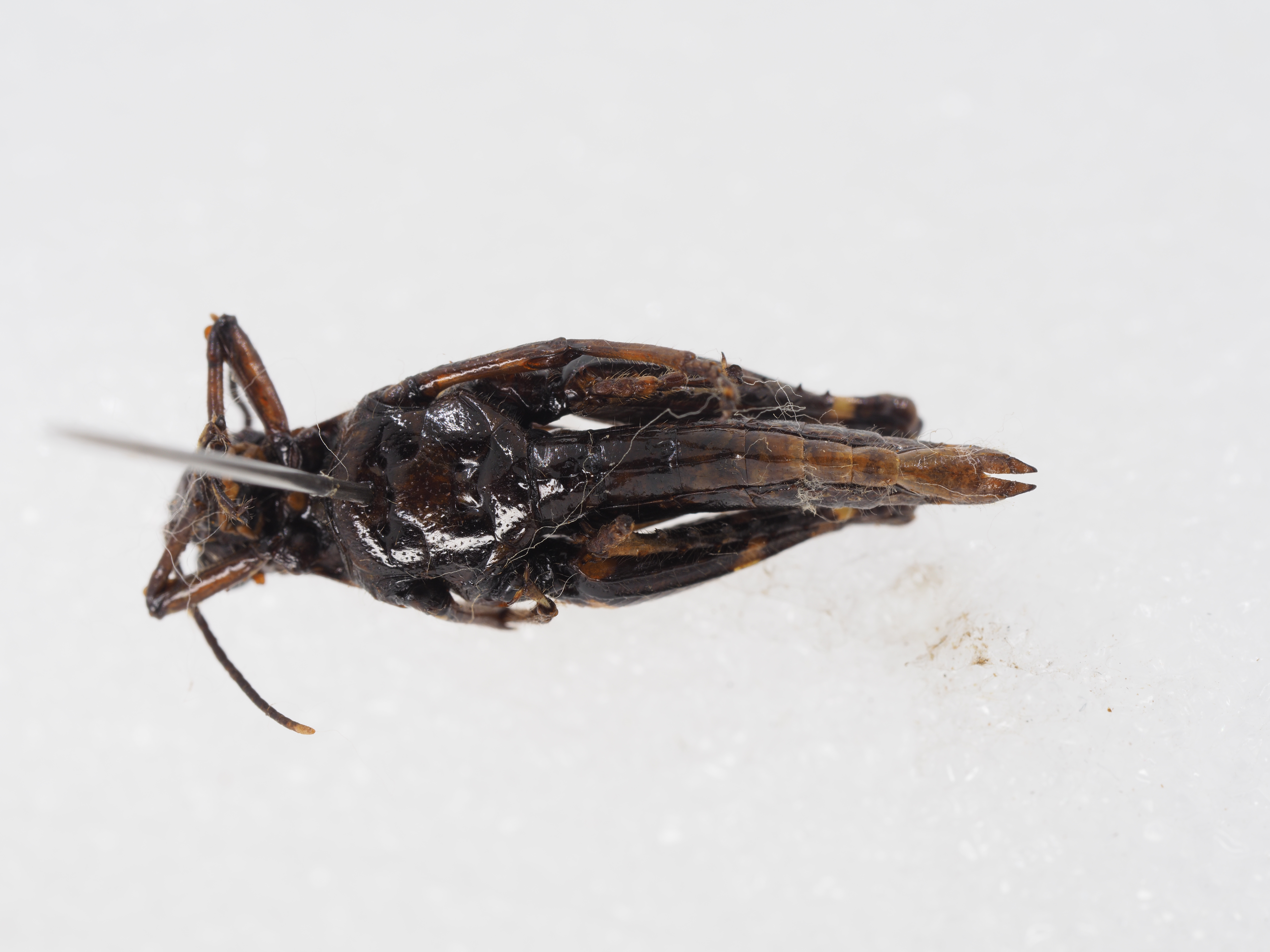 雌性 体较大于雄性。肛上板为长三角形,顶端较钝,基部纵沟终止于横隆线。尾须短圆锥形,顶端较钝,未到达肛上板顶端。上、下产卵瓣较直,顶端呈钝钩形,上缘缺齿。下生殖板长大于宽,后缘为锐角形突出。