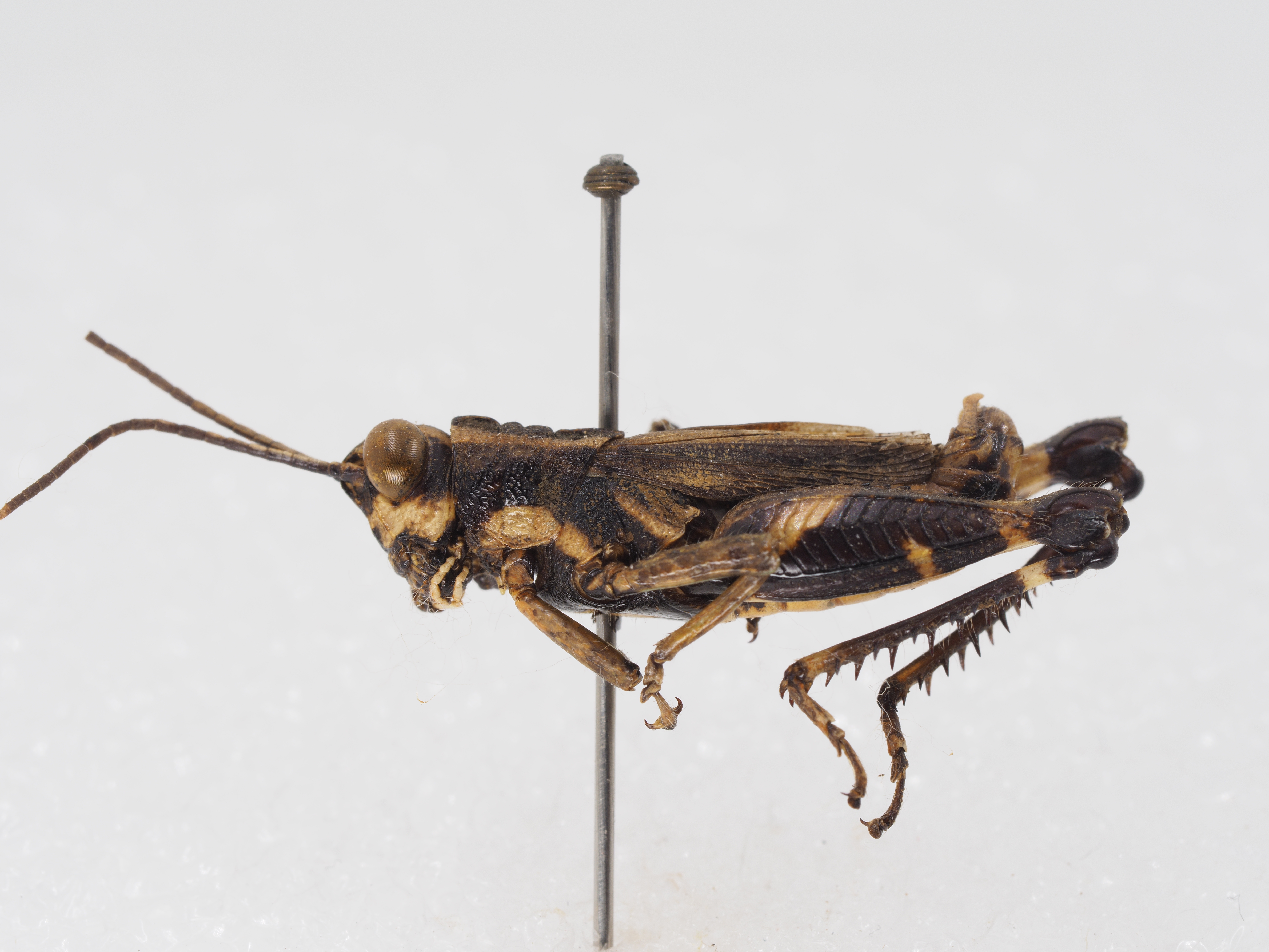 体色:通常为淡褐色至黑褐色。头为淡黄色,背面具暗色纵条纹,复眼后具暗色斑纹。触角背面为淡褐色,底面为黑褐色。复眼为褐色。颜面在触角基部为黑褐色,在近上唇基具四方形黑色斑块。下颚须和下唇须均为黄色。前胸背板中央具一条黑纵纹,在沟前区的前部和沟后区各具近长方形黑丝绒斑纹。前翅在肘脉域之前为暗褐色。后足股节外侧基部具有一个倾斜的三角形黄色斑纹;下隆线中部具一小黄色斑块;膝前环淡色完整,但外侧略暗,内侧较淡。后足胫节为黑褐色,仅近基部具淡色环,有时端部外侧