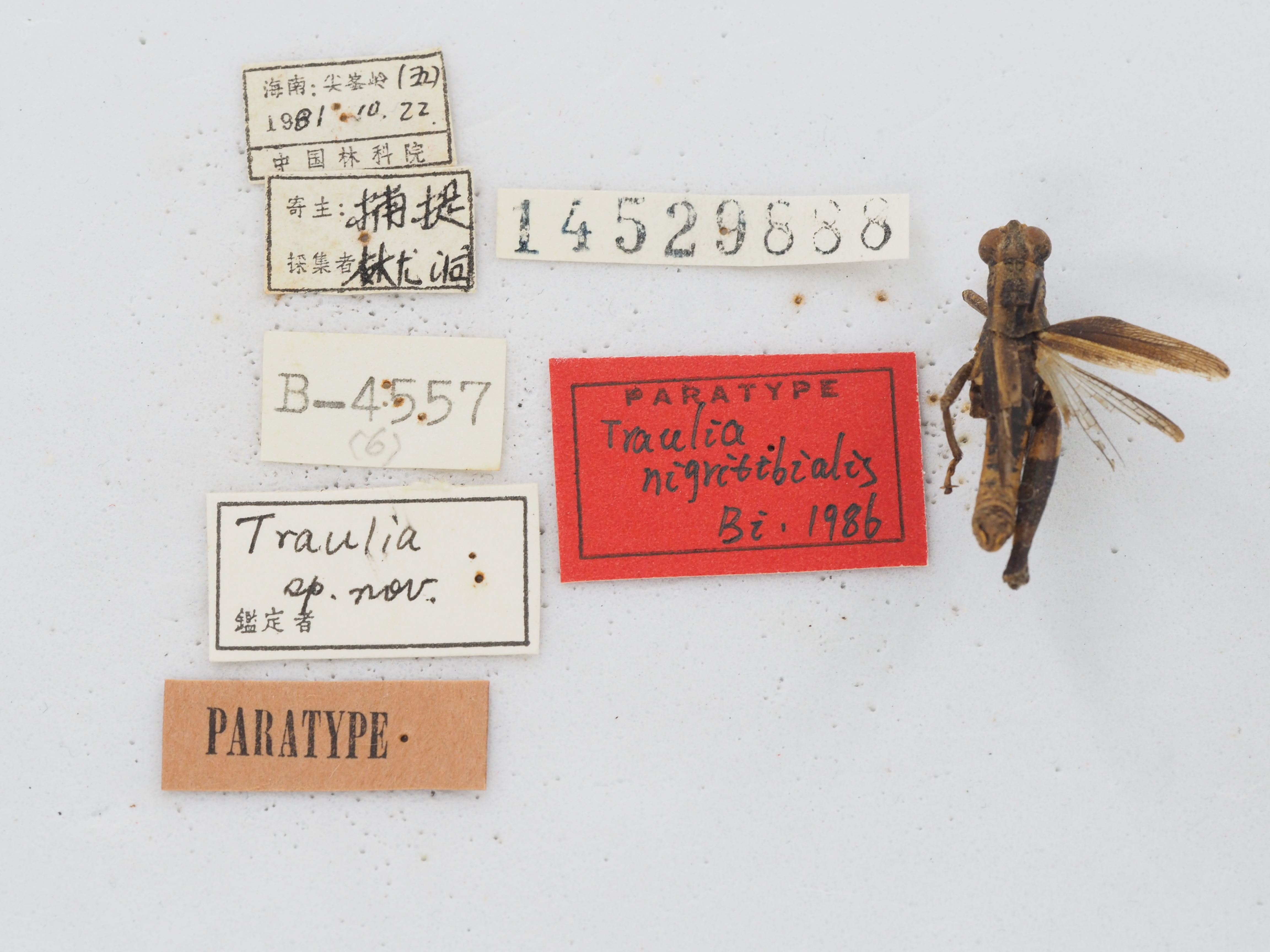 描述:雄性 体型中等,体表具粗刻点和皱纹。头大而短,较短于前胸背板。头顶向前倾斜,背面较低凹,颜面隆起在触角之间颇向前突出;其在复眼之间的宽度约为颜面隆起在触角之间宽度的2.2倍;全长具纵沟,两侧不平行,近上唇基略向外扩展;颜面侧隆线明显,略弯。复眼卵圆形,向外突出。触角丝状,21节,超过前胸背板的后缘,到达后足股节基部。前胸背板圆筒形,前缘较直,缺三角形凹口,后缘为钝角形向后突出;中隆线较隆起,全长明显;缺侧隆线;3条横沟明显深切中隆线,沟前区较长,约为沟后区长的1.6倍。前胸腹板突为圆锥形,顶端较钝。中胸腹板侧叶间之中隔较宽,其宽度大于长度;后胸腹板侧叶较宽地分开。前、后翅较短,到达或超过后足股节中部。后足股节略粗壮,上隆线具细齿;下膝侧片端部为圆弧形。后足胫节略弯,端部不扩大,缺外端刺,胫节刺外缘具刺7个,内缘具刺7~8个(包括端刺)。腹部向上翘起,腹部末节背面后缘中央两侧各具一个小点状尾片。肛上板为盾形,顶端略锐,基部中央较低凹,两侧中部各具一个较高的突起。尾须侧扁,基部较宽,端部呈刀状,中央略狭,其长超肛上板的端部。下生殖板短锥形,向上翘。阳具基背片和阳具复合体见图257d~e。