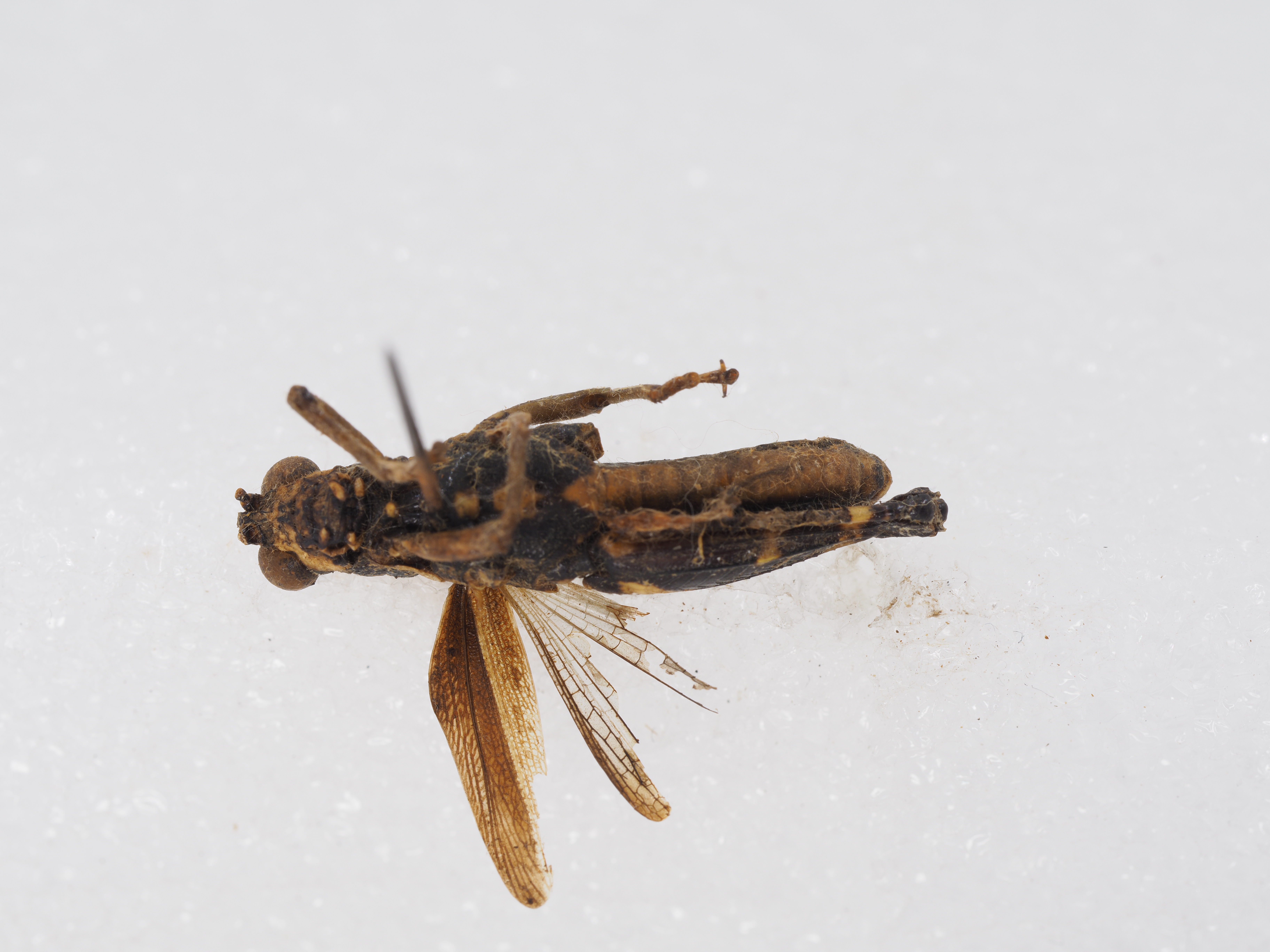 体色:通常为淡褐色至黑褐色。头为淡黄色,背面具暗色纵条纹,复眼后具暗色斑纹。触角背面为淡褐色,底面为黑褐色。复眼为褐色。颜面在触角基部为黑褐色,在近上唇基具四方形黑色斑块。下颚须和下唇须均为黄色。前胸背板中央具一条黑纵纹,在沟前区的前部和沟后区各具近长方形黑丝绒斑纹。前翅在肘脉域之前为暗褐色。后足股节外侧基部具有一个倾斜的三角形黄色斑纹;下隆线中部具一小黄色斑块;膝前环淡色完整,但外侧略暗,内侧较淡。后足胫节为黑褐色,仅近基部具淡色环,有时端部外侧