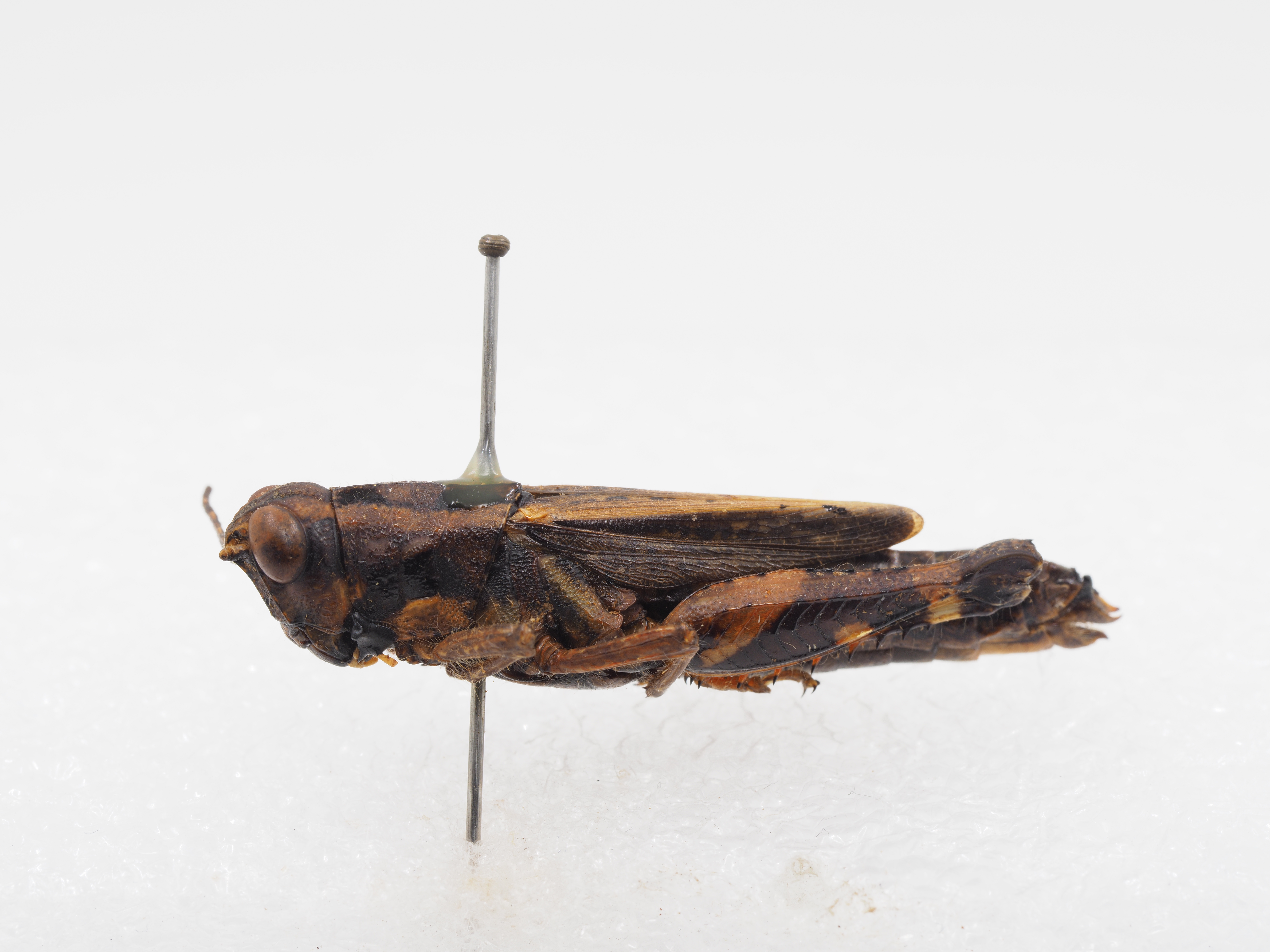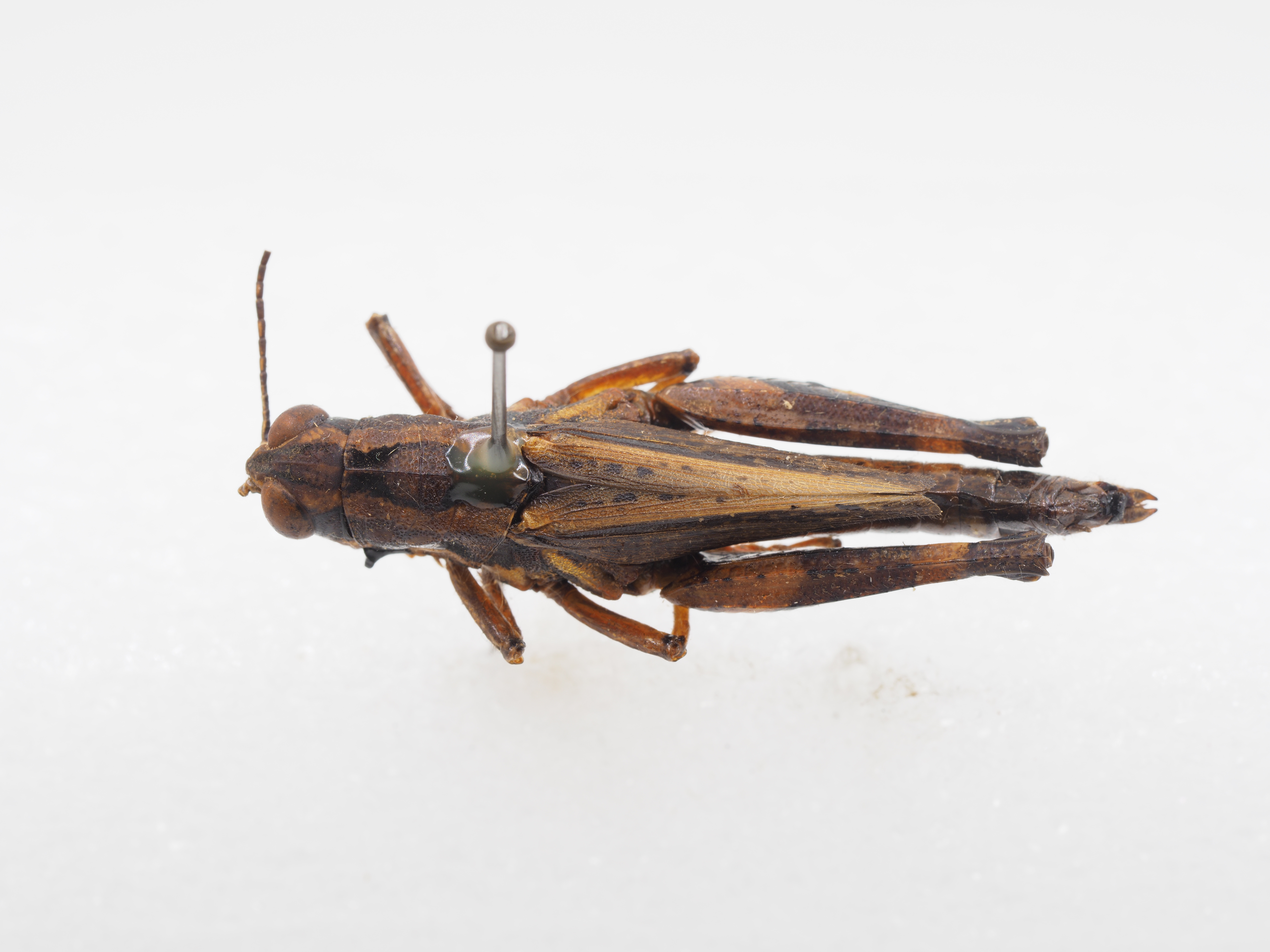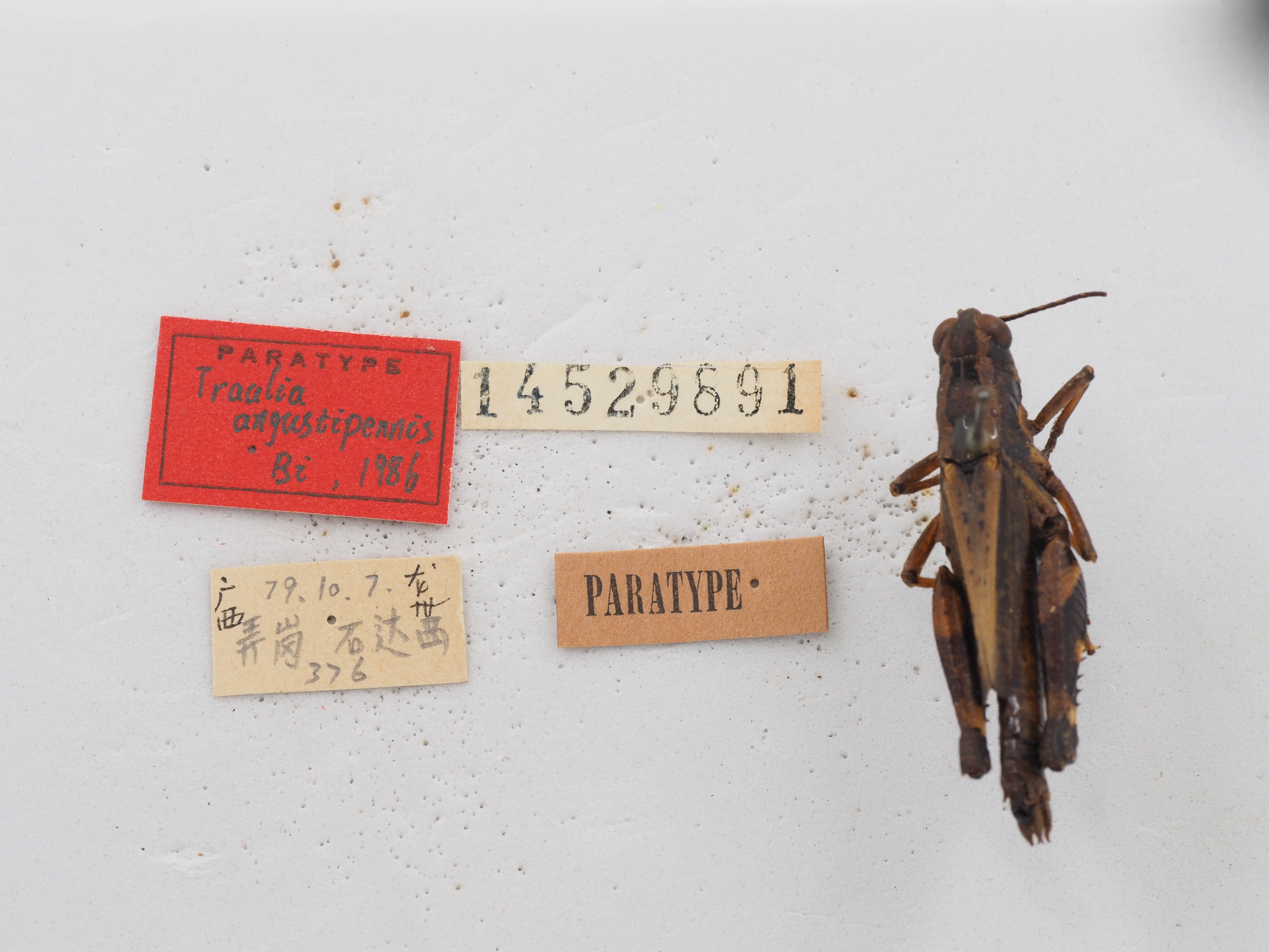 描述:雄性 体大型,较粗壮,具粗刻点和稀少绒毛。头大而短,较短于前胸背板。头顶向前倾斜,头顶在复眼之间的宽度约为颜面隆起在触角之间宽度的2倍。头侧窝为长三角形。颜面侧隆线略弯。复眼卵圆形,向外突出。触角丝状,基部数节背面较平,其长超过前胸背板后缘。前胸背板为筒形,背面较平,其前缘中央略凹,后缘略向后突;中隆线明显,缺侧隆线;3条横沟均明显切断中隆线,沟前区较长于沟后区。前胸腹板突为圆锥形,顶端略钝。中胸腹板侧叶间之中隔略宽,上狭下宽;中隔的宽度明显地大于长度。前、后翅均发达,前翅较远地不到达后足股节膝部。后足股节略粗壮,上隆线具细齿;下膝侧片端部为宽弧形。后足胫节略弯,端部边缘不扩大,缺外端刺;胫节刺外缘具刺7个,内缘具刺8个包括端刺。腹部末节背板后缘两侧各具一个微小尾片。肛上板盾形,长宽近相等;顶端较尖,基部中央具纵沟,中部较平,两侧缘突起较低。尾须侧扁基部与端部较扩大,中央较狭。下生殖板为短圆锥形,向上翘。阳具基背片和阳具复合体见图254e~f。