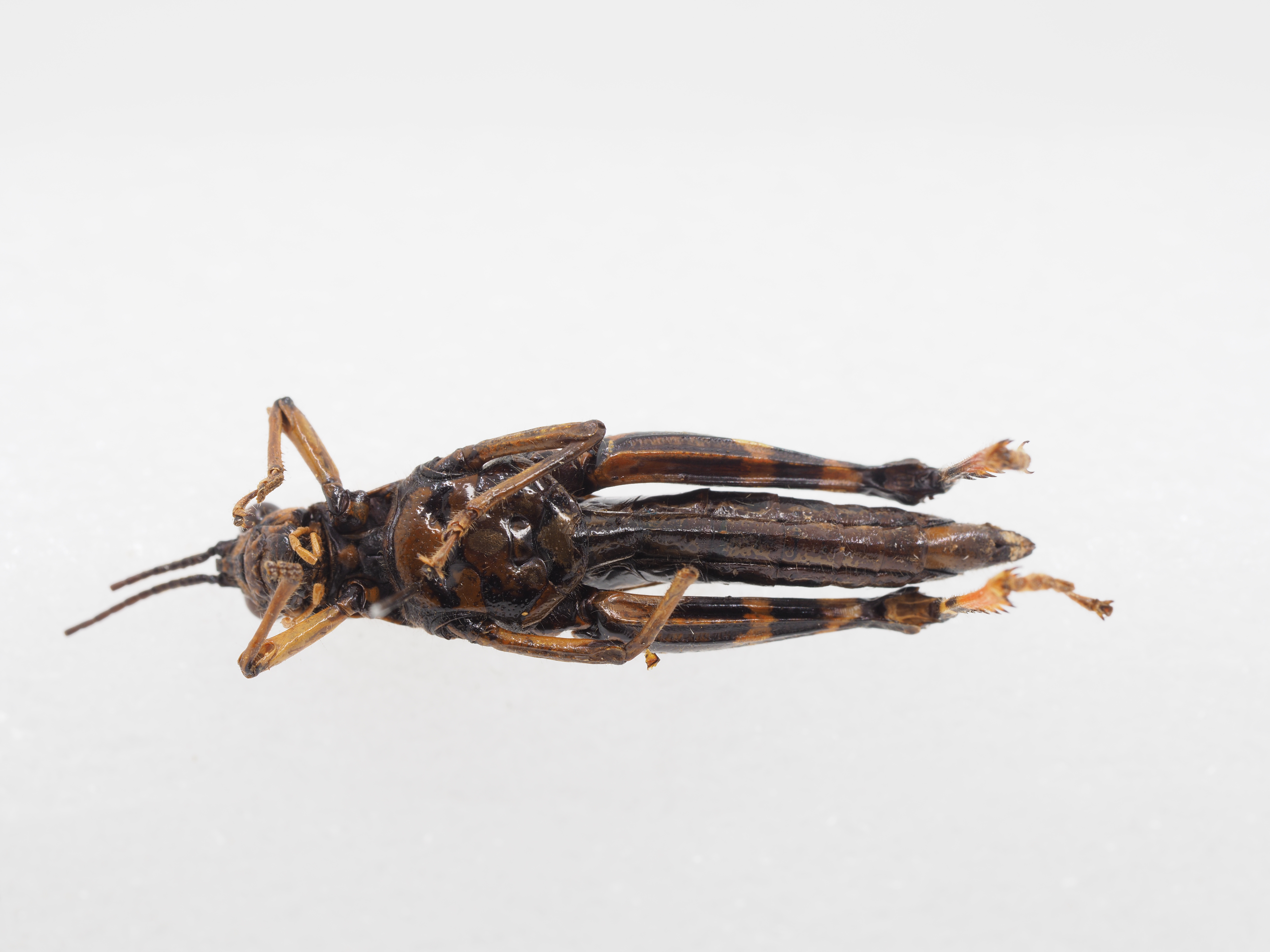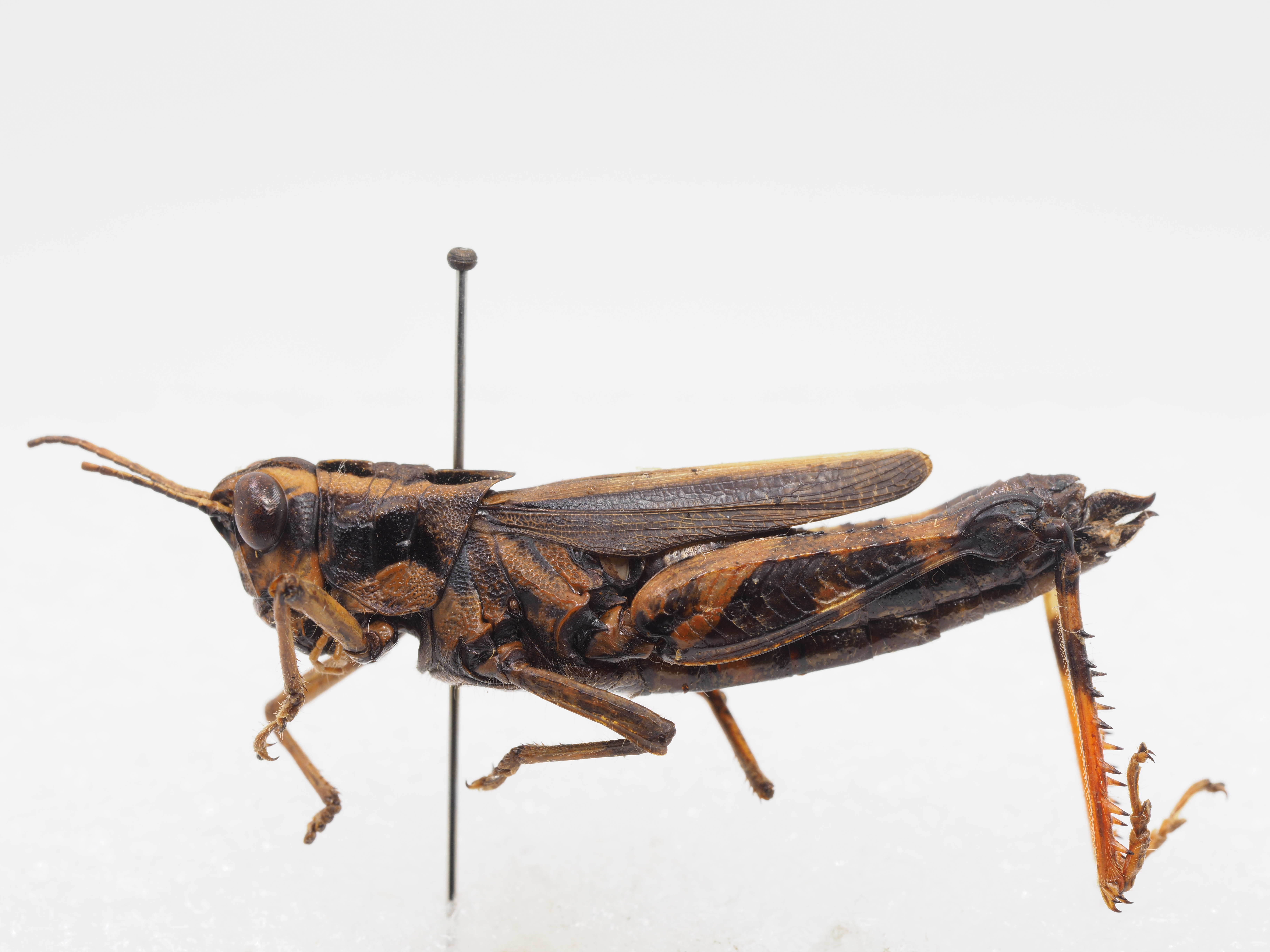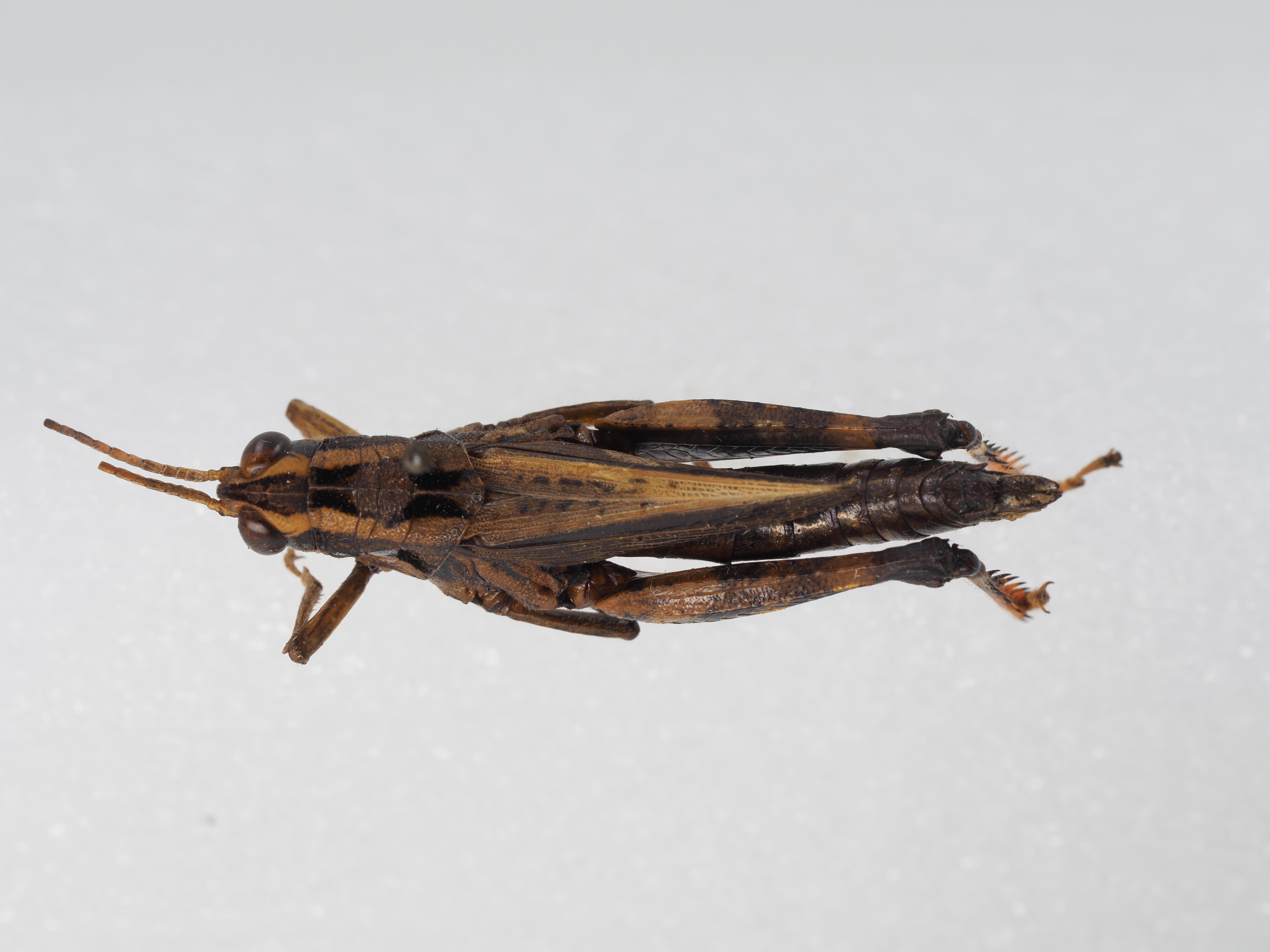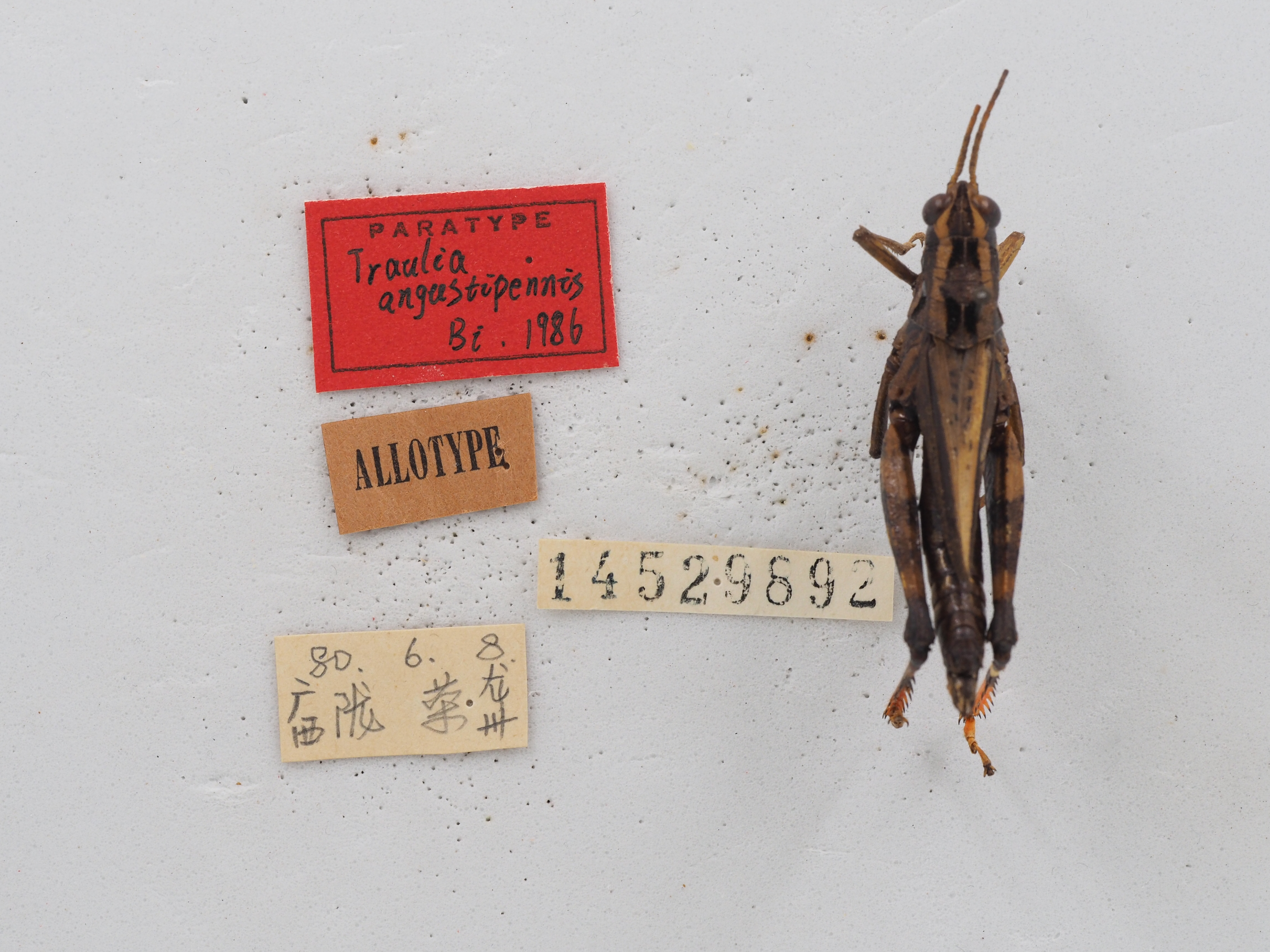 描述:雄性 体大型,较粗壮,具粗刻点和稀少绒毛。头大而短,较短于前胸背板。头顶向前倾斜,头顶在复眼之间的宽度约为颜面隆起在触角之间宽度的2倍。头侧窝为长三角形。颜面侧隆线略弯。复眼卵圆形,向外突出。触角丝状,基部数节背面较平,其长超过前胸背板后缘。前胸背板为筒形,背面较平,其前缘中央略凹,后缘略向后突;中隆线明显,缺侧隆线;3条横沟均明显切断中隆线,沟前区较长于沟后区。前胸腹板突为圆锥形,顶端略钝。中胸腹板侧叶间之中隔略宽,上狭下宽;中隔的宽度明显地大于长度。前、后翅均发达,前翅较远地不到达后足股节膝部。后足股节略粗壮,上隆线具细齿;下膝侧片端部为宽弧形。后足胫节略弯,端部边缘不扩大,缺外端刺;胫节刺外缘具刺7个,内缘具刺8个包括端刺。腹部末节背板后缘两侧各具一个微小尾片。肛上板盾形,长宽近相等;顶端较尖,基部中央具纵沟,中部较平,两侧缘突起较低。尾须侧扁基部与端部较扩大,中央较狭。下生殖板为短圆锥形,向上翘。阳具基背片和阳具复合体见图254e~f。