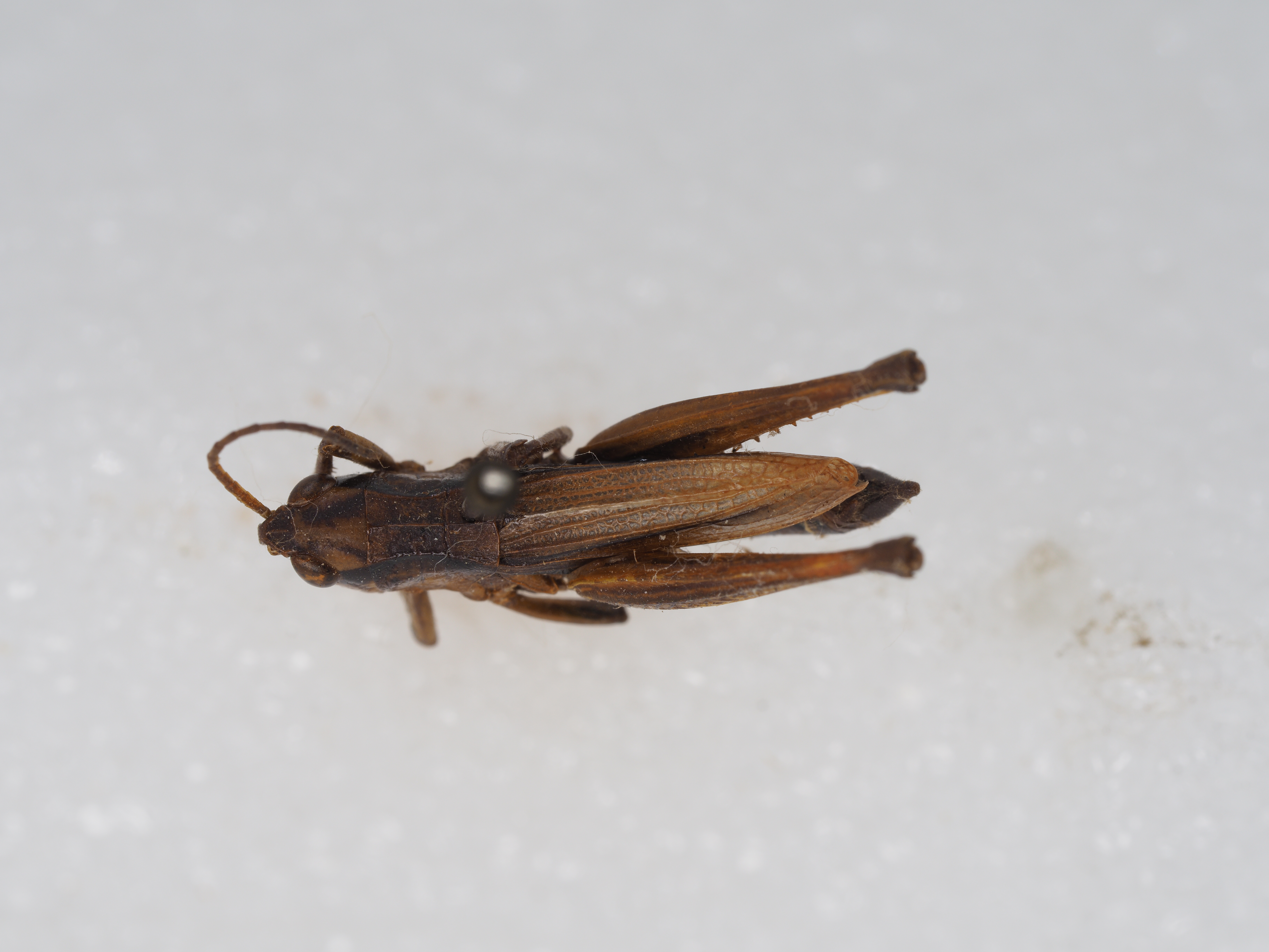 体色 暗褐色。后足股节外侧具二个不明显的黑褐色横斑,内侧黑色,具二明显的黄褐色横斑,下侧略带橙红色,膝部黑色。后足胫节淡红褐色,基部黑色。
