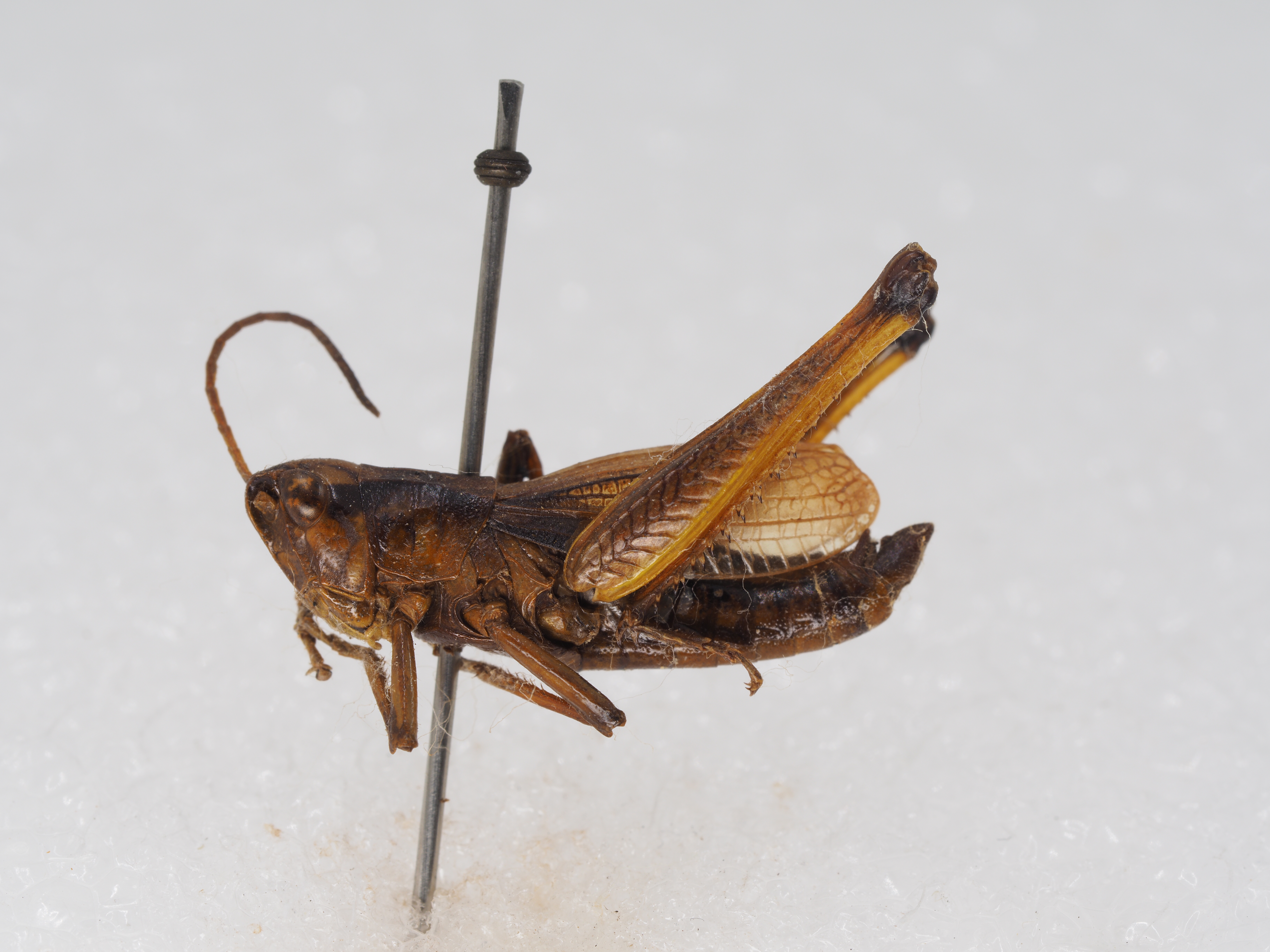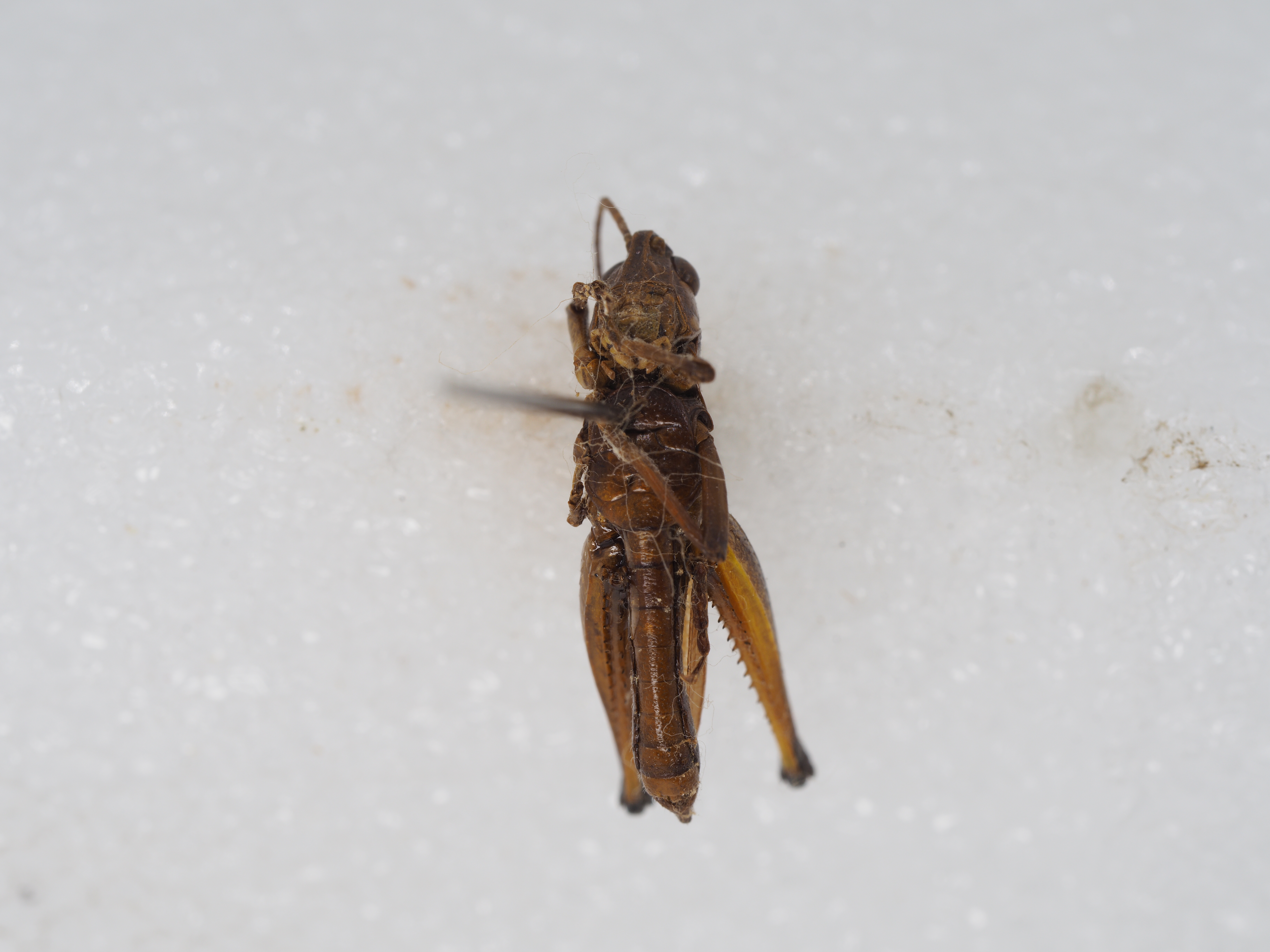 雌性 体较大。头顶较宽,眼间距宽为触角间颜面隆起宽的2.3—3倍。颜面倾斜,颜面隆起宽平,颊下区具大的刻点。触角较短,略不到达后足股节基部,中段一节长为宽的2倍。复眼的垂直直径等于或略小于眼下沟长。前胸背板后缘中央明显凹入;沟前区的长度为沟后区的1.4—1.7倍;侧片下缘弧形。前翅小,鳞片状,侧置,到达第一腹节背板后缘或第二节中部,翅顶延长,翅长为宽的1.6—1.75倍。后翅极小。鼓膜孔宽卵形。中胸腹板侧叶间中隔长为宽的2.5倍。肛上板长三角形,表面光滑,尾须短锥形。产卵瓣狭长,上产卵瓣之上外缘无凹口,具细齿,下产卵瓣之下外缘直,具细齿,基部无大齿。下生殖板后缘中央角形突出。