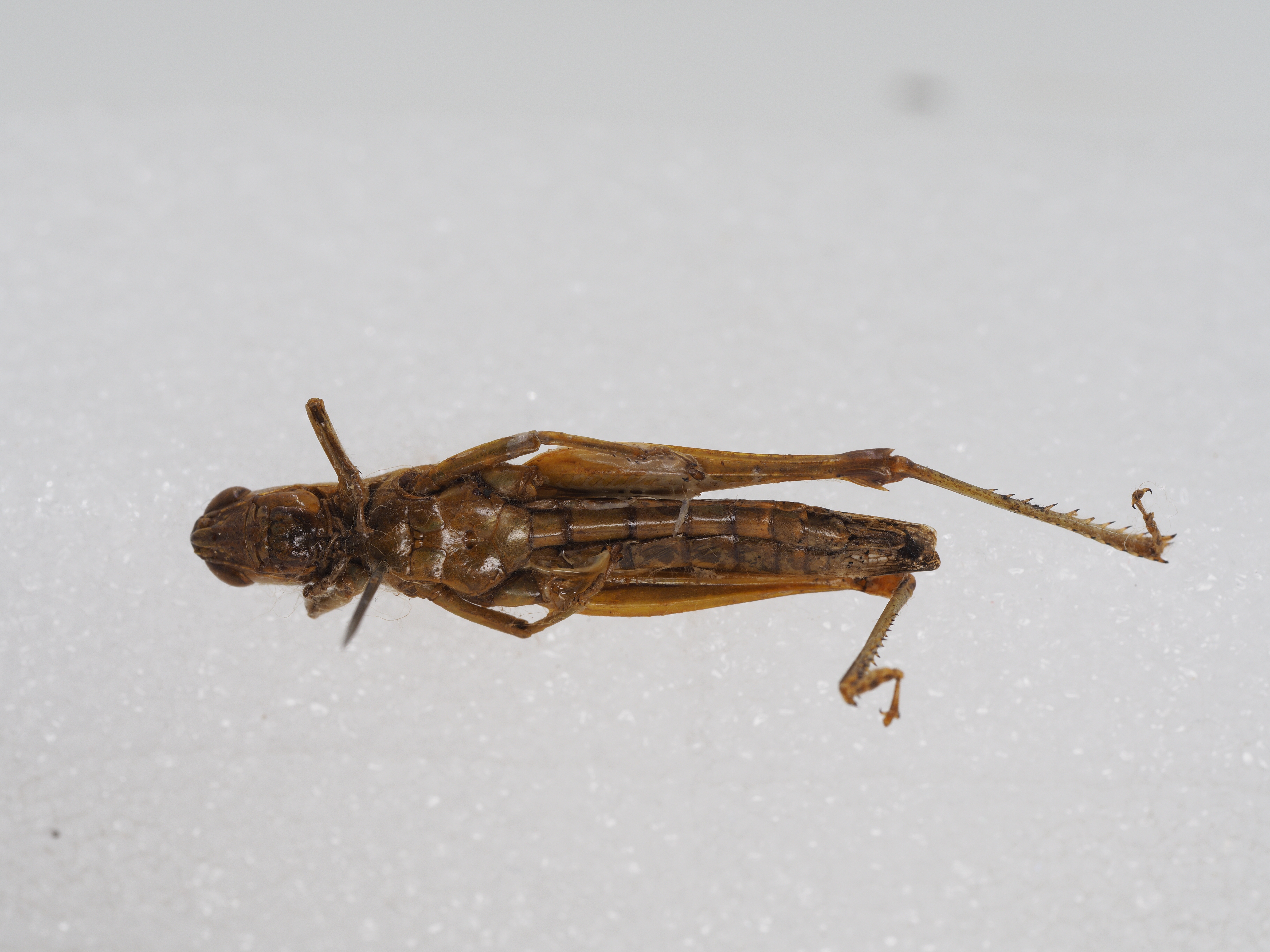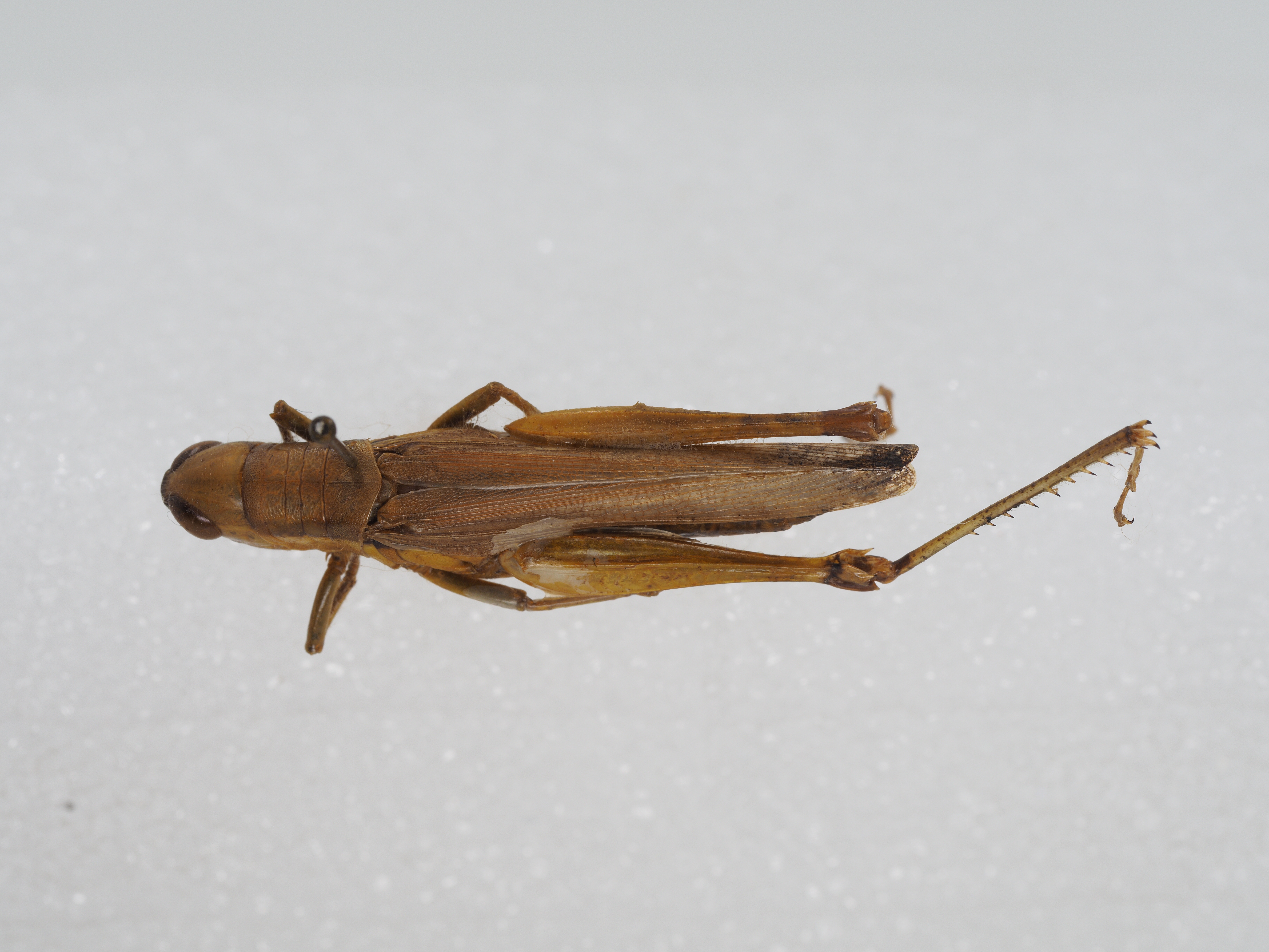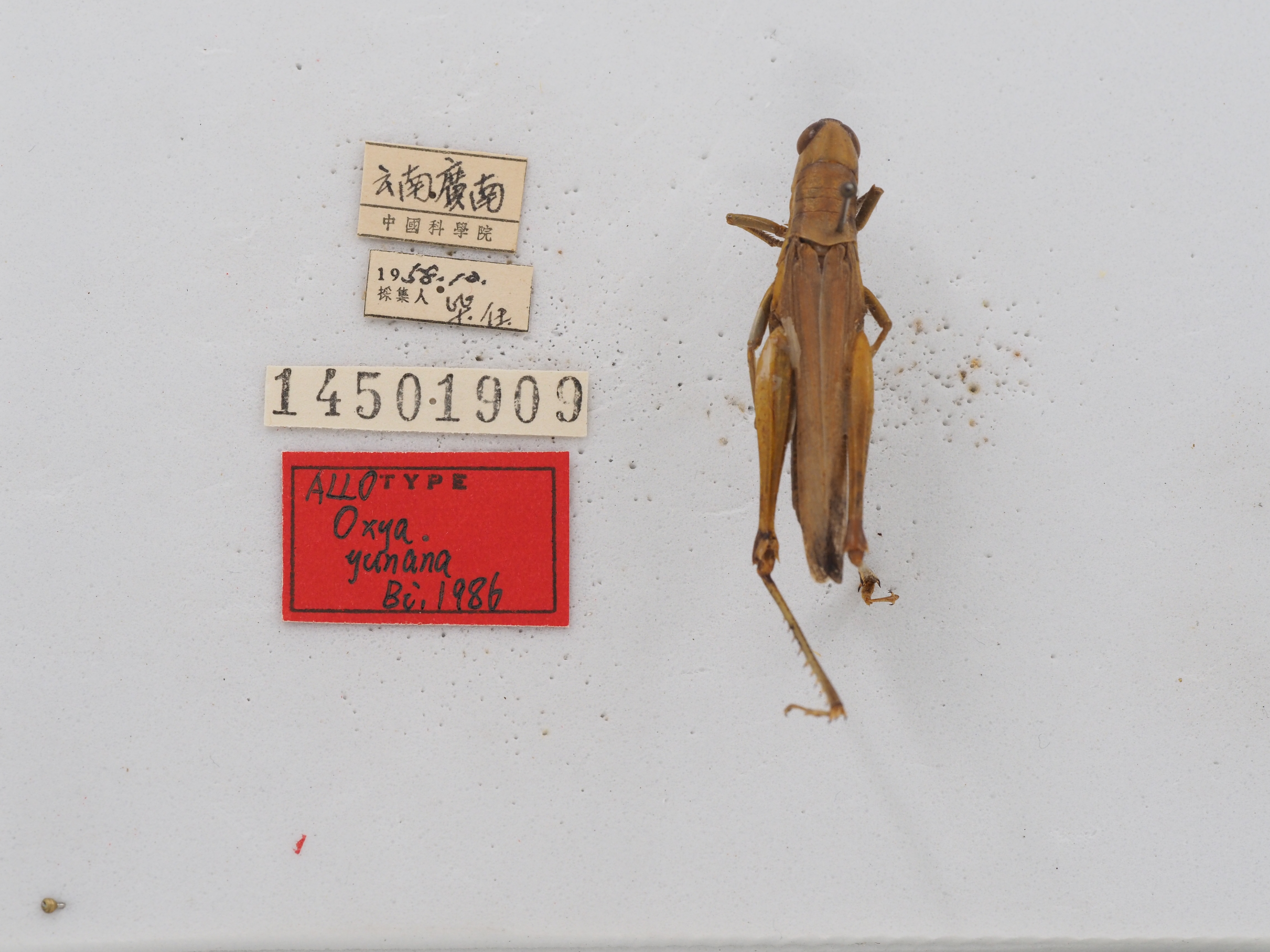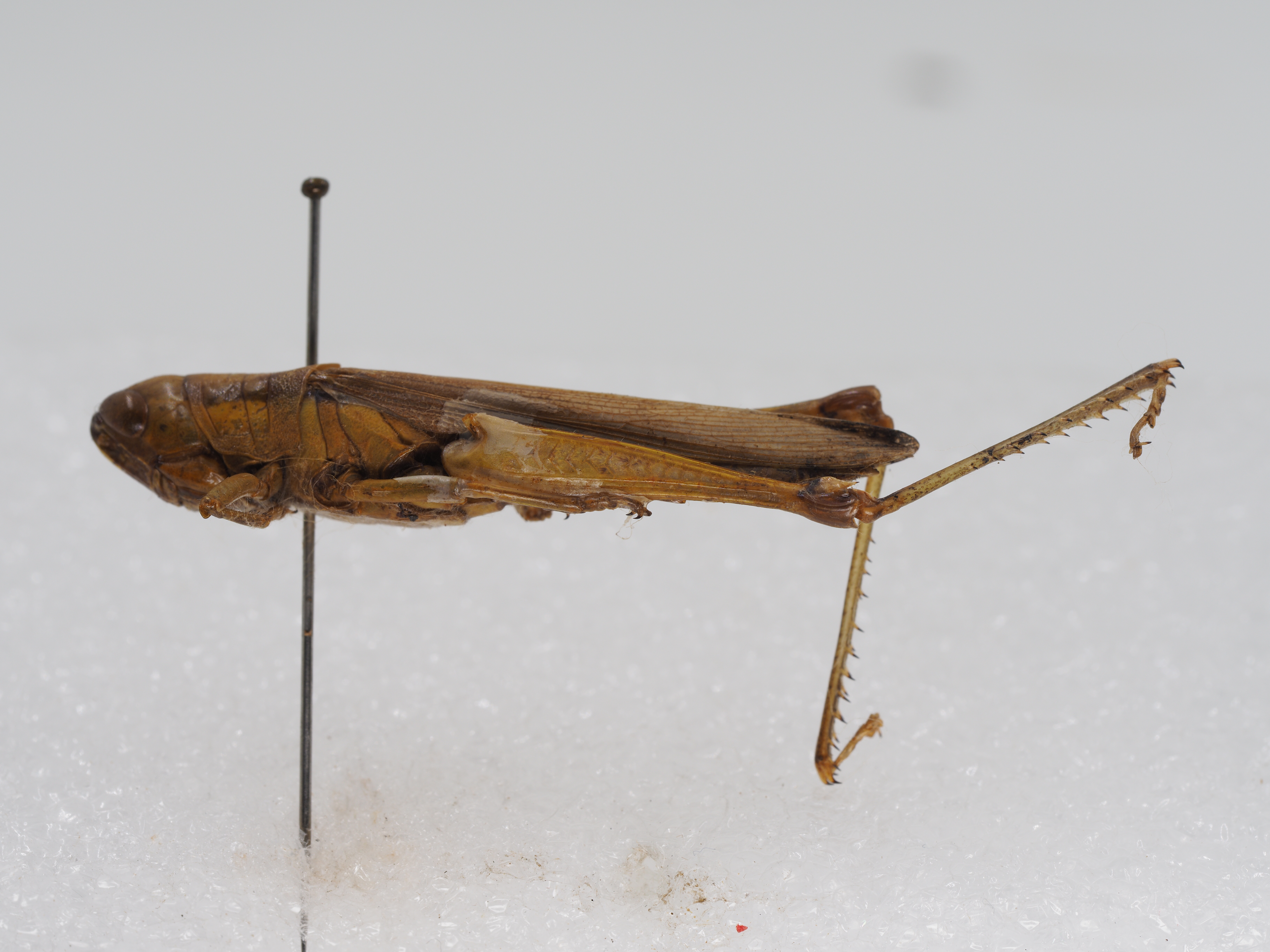 描述:雄性 体型略大,体表具有细小刻点。头顶向前倾斜突出,顶端圆形,其宽约为在复眼前缘之长的两倍,其在复眼之间宽度略宽或等于其颜面隆起在触角之间的宽度。颜面隆起在中央单眼之下较宽,中央单眼之上较狭,全长具较宽纵沟。触角丝状,其长超过前胸背板的后缘。复眼卵圆形,其纵径为横径的1.4倍,为其眼下沟长的3倍。前胸背板较平,其前缘平弧形,后缘呈钝角突出,两侧缘几乎平行;中隆线较低,缺侧隆线;3条横沟明显切断中隆线,后横沟位于中部之后,沟前区长于沟后区;侧片之长略大于高。前胸腹板突呈圆锥形,顶端略圆,略向后倾斜。中胸腹板侧叶间之中隔较狭,中隔之长约为其宽的2.6倍。后胸腹板侧叶的后端相互毗连。前、后翅均发达,其长超过后足股节端部,前翅前缘之基突不明显突出。后足股节匀称,中隆线缺细齿,内、外下膝侧片的顶端均具有锐刺。后足胫节近端部之半的上侧内、外缘均扩大成狭片状,顶端具有外端刺和内端刺;沿其外缘具刺8~9个,内缘具刺9~11个。跗节爪间中垫较大,常超过爪长。腹部第1节侧面具椭圆形的鼓膜器。肛上板为三角形,表面较光滑。尾须圆锥形,基部较宽,中部较直,顶端钝圆形,其长超过肛上板的顶端。下生殖板呈锥形,顶端略平。阳具基背片外冠突较粗短,内冠突呈小齿状。阳具复合体的色带瓣和阳具端瓣较细长,色带瓣前缘具深凹。二者弯曲略呈“S”形,色带后突背观呈三角形,端部较狭;两侧突较大。