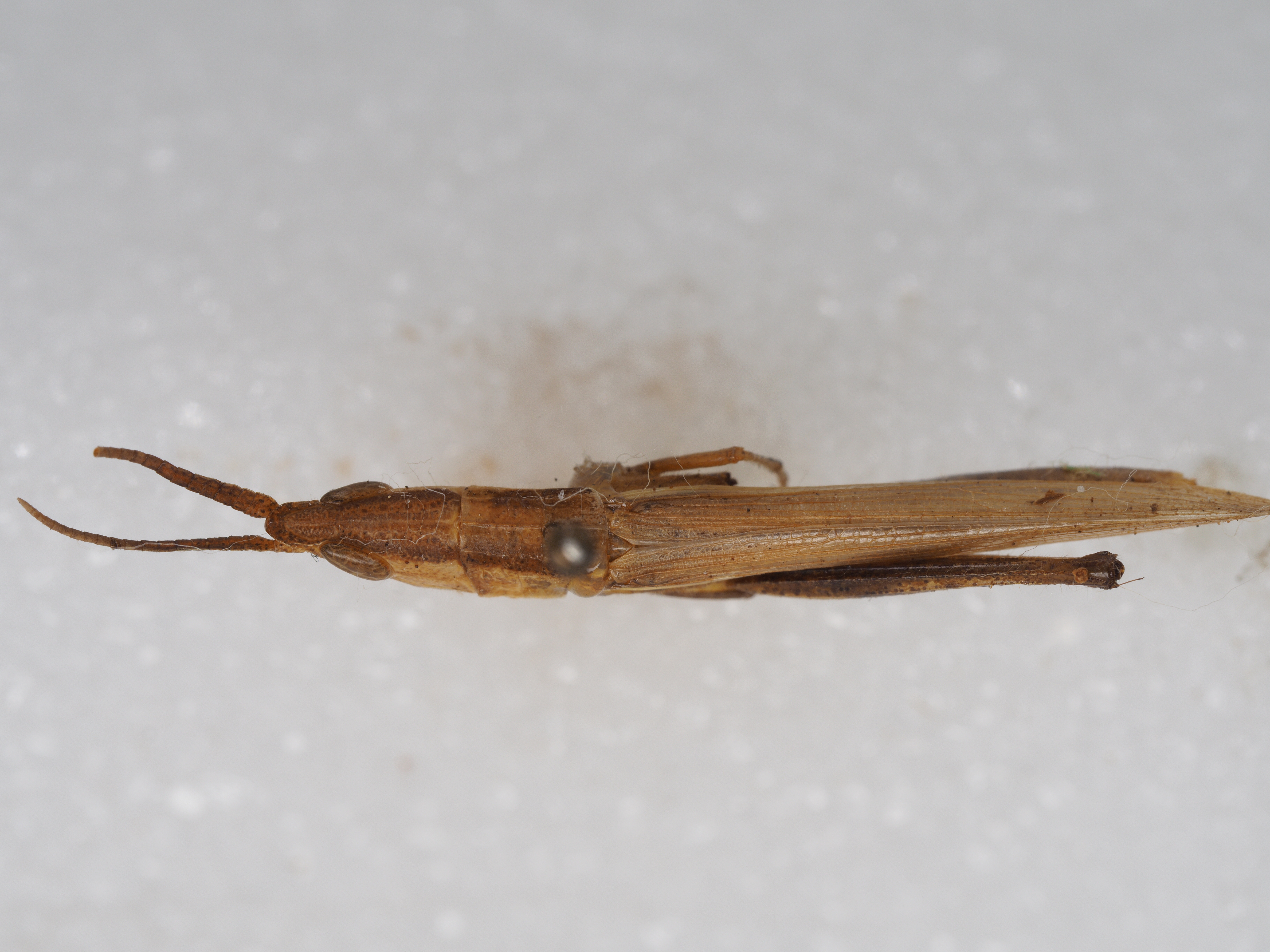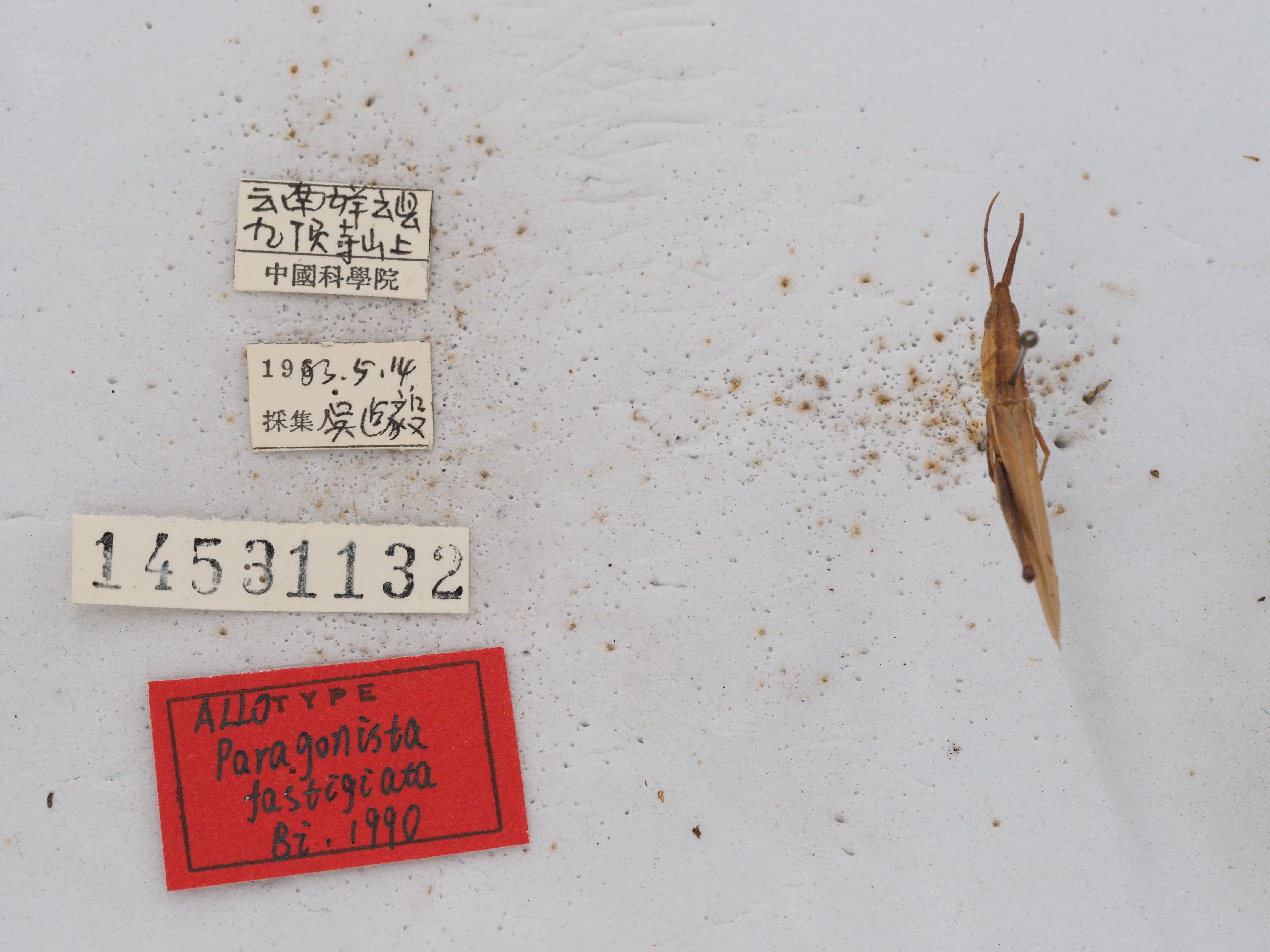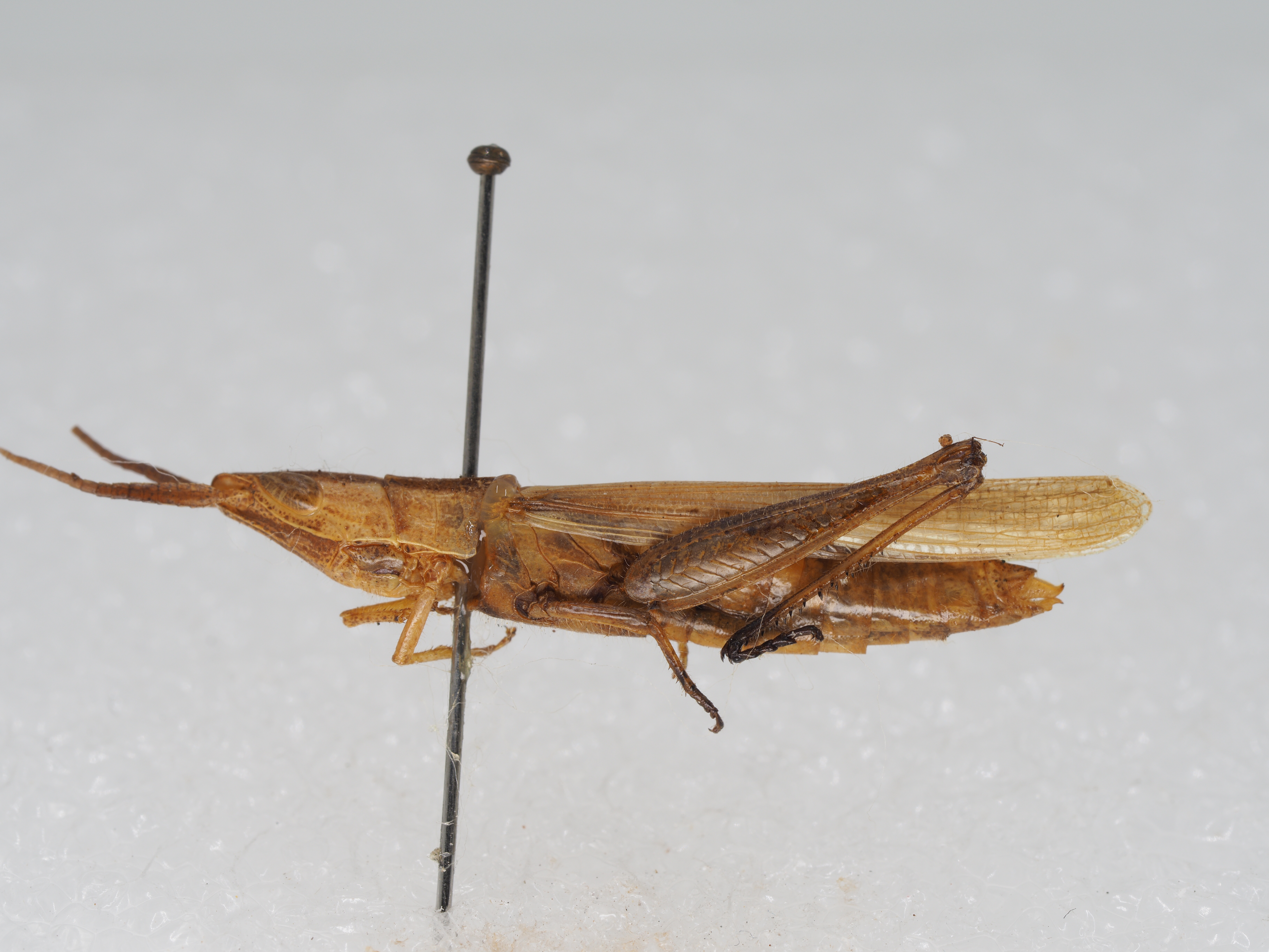 描述:雄性 体中小型,细长。头部锥形,较长于前胸背板。头顶突出,复眼前缘至头顶顶端的长度较长于复眼的横径,顶端圆弧形(图69a)。颜面颇倾斜,颜面隆起明显,具宽而浅的纵沟。头侧窝缺。复眼长卵形,纵径为横径的2倍。触角细长,剑状,到达后足股节的基部。前胸背板中、侧隆线均明显,侧隆线近乎平行,沟前区长于沟后区;后缘向后呈弧形突出;前胸背板侧片前下角近直角形,后下角向后突出。前胸腹板在两前足基节之间略呈圆形隆起。中胸腹板侧叶之间中隔略宽;后胸腹板在后端彼此毗连前、后翅发达,等长,前翅超过后足股节的顶端,顶部圆形,中脉域具闰脉。后足股节膝侧片顶圆形,内侧下隆线具一列音齿。后足胫节内侧具刺12—13个,外侧具刺11—12个,缺外端刺。肛上板长三角形,基部中央具浅纵沟。尾须长锥形,顶尖。下生殖板细锥形,顶端尖。阳具基背片桥状,锚状突透明而细小,内冠突为横三角形,外冠突较长,背面较平,顶端较锐,边缘突起不明显。