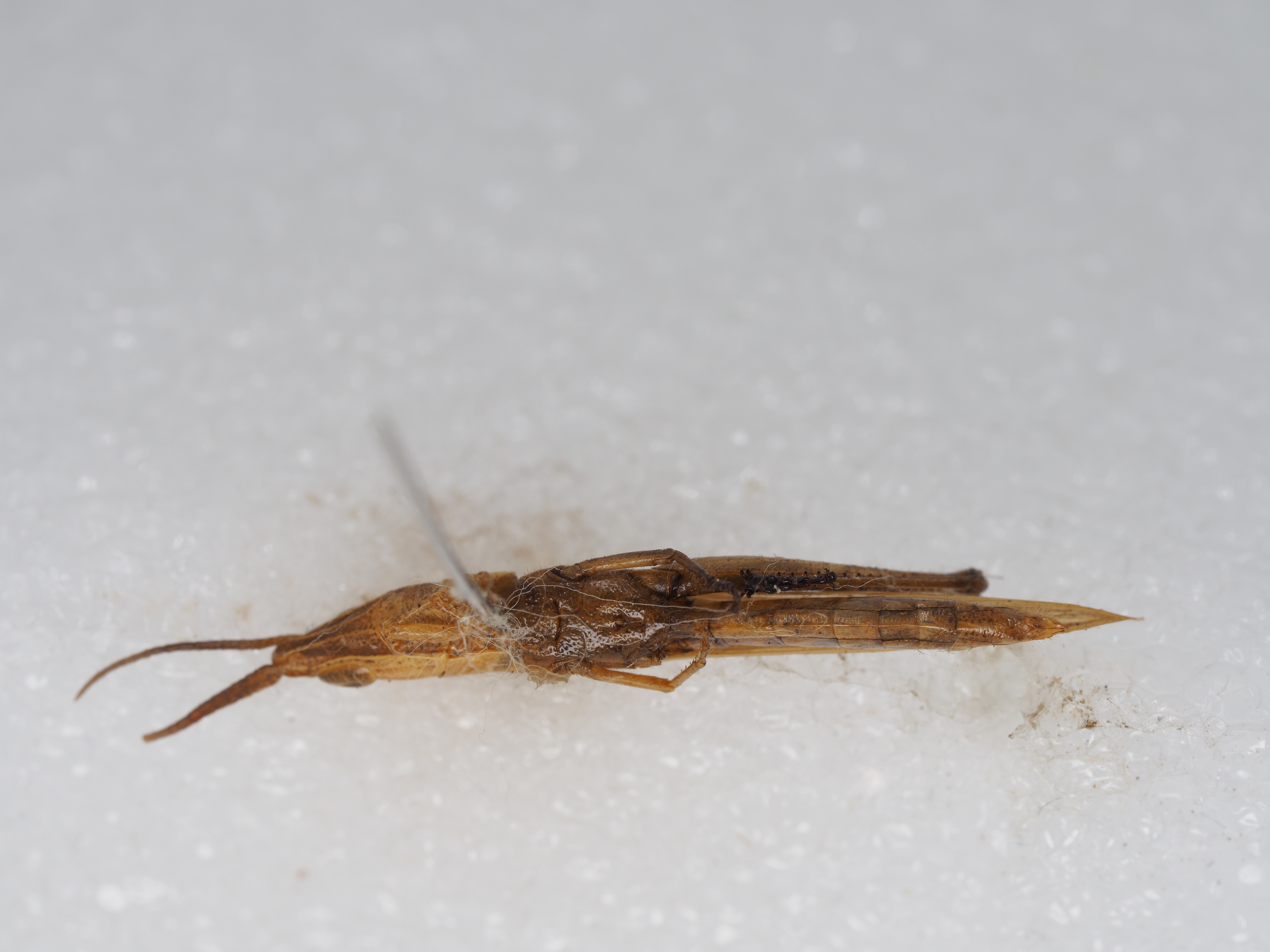 雌性 体较大于雄性。触角剑状,略短。产卵瓣顶端略弯,上产卵瓣外缘光滑。下生殖板后缘中央呈三角形突出,两侧具小而短的角状突出(图69b)。余相似于雄性。