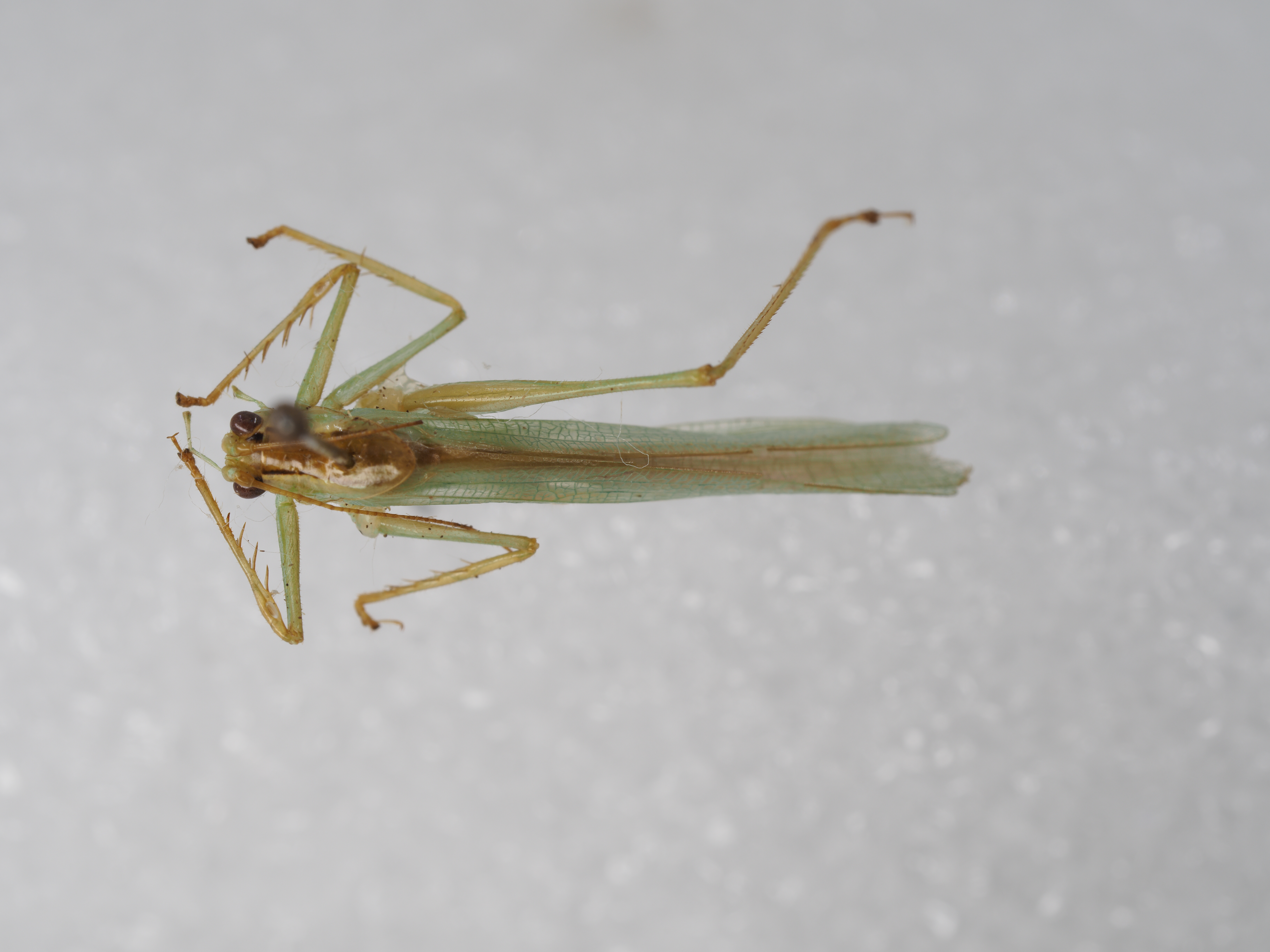 描述:雄性:头顶圆锥形,顶端圆钝,背而具弱纵沟。复眼圆形,呈半球状向前突出。下颚须第5节几乎不长于第4节,端部稍扩大。前胸背板侧片后缘几乎直,肩凹不明显。前翅颇远地超出后足股节顶端,后翅长于前翅。前足胫节腹侧内、外缘刺排列式为5,5(1,1)型,后足胫节背侧内、外缘各具小齿30-32个。腹部末节背板后部深凹状。尾