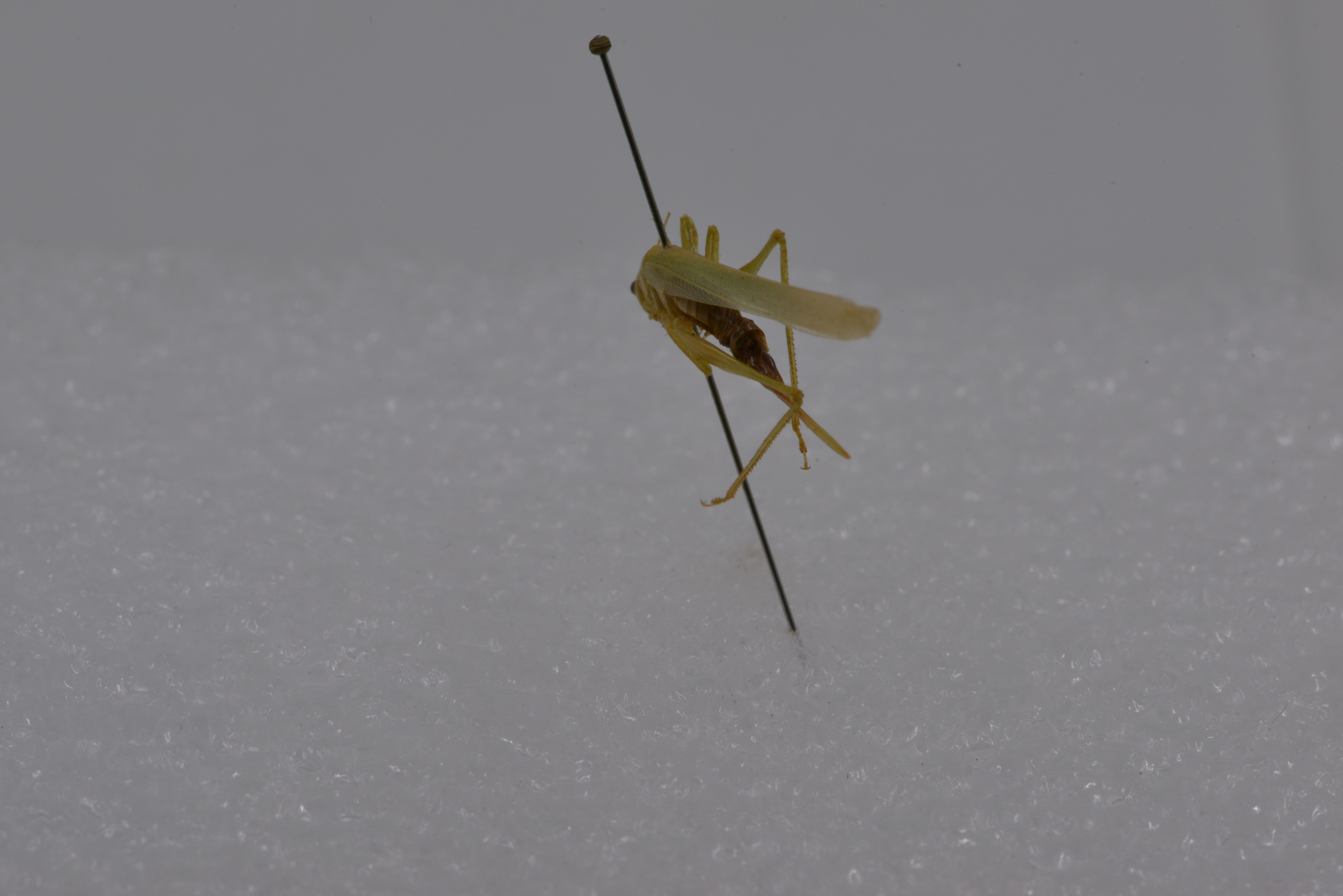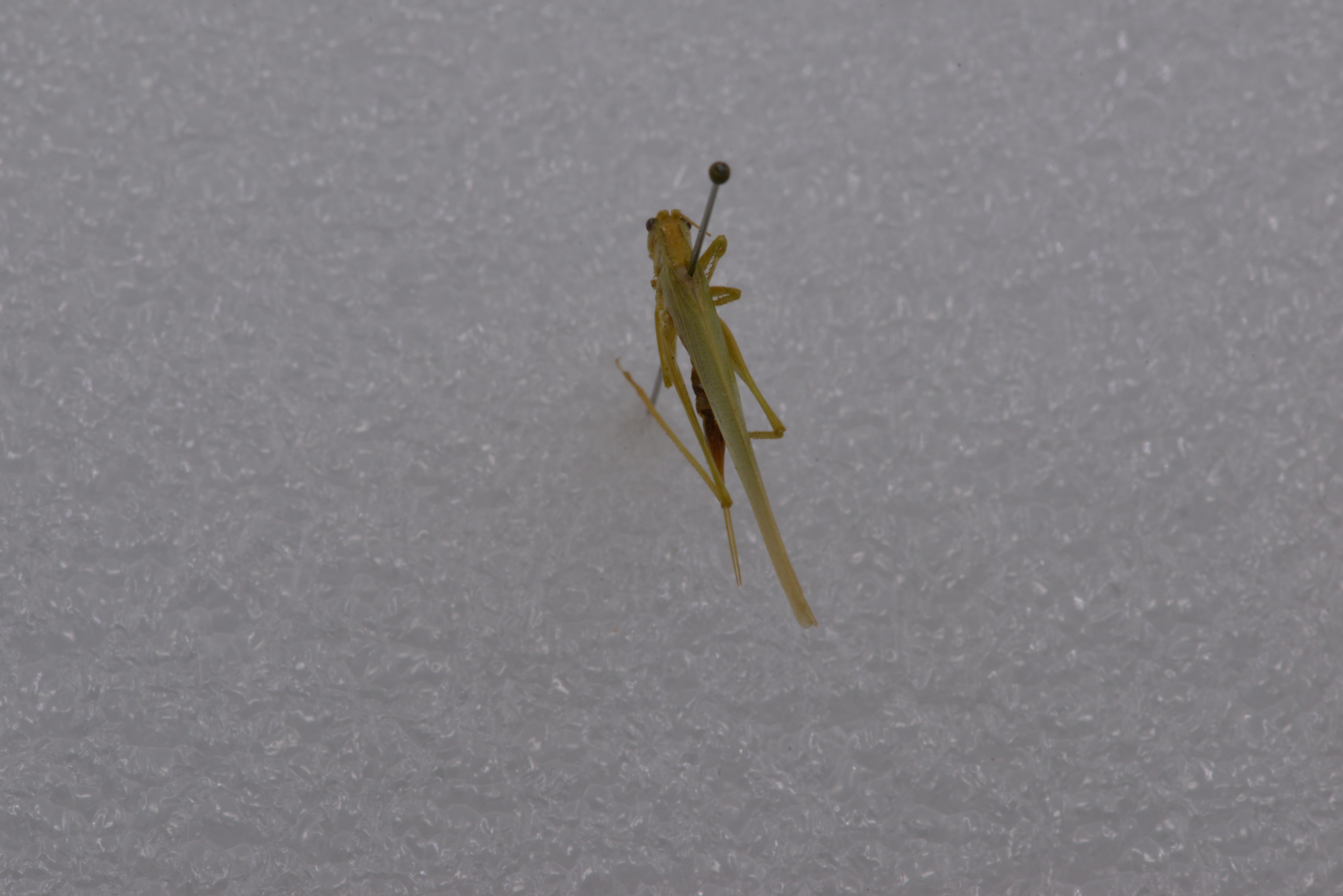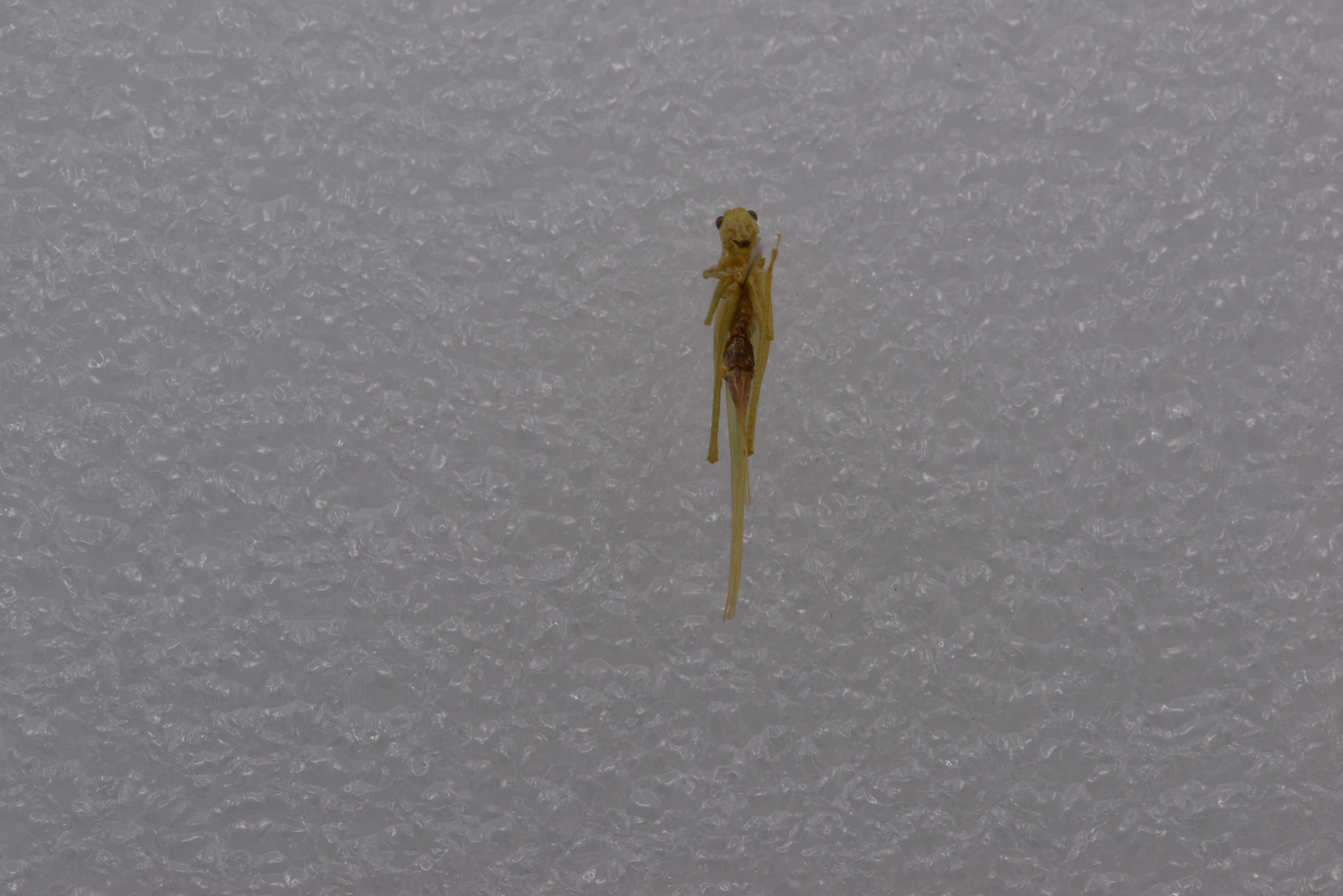 体淡绿色。前胸背板背面黄色具暗黑色侧纵纹,后足股节膝叶顶端具暗色边,后足胫节背缘齿暗色。