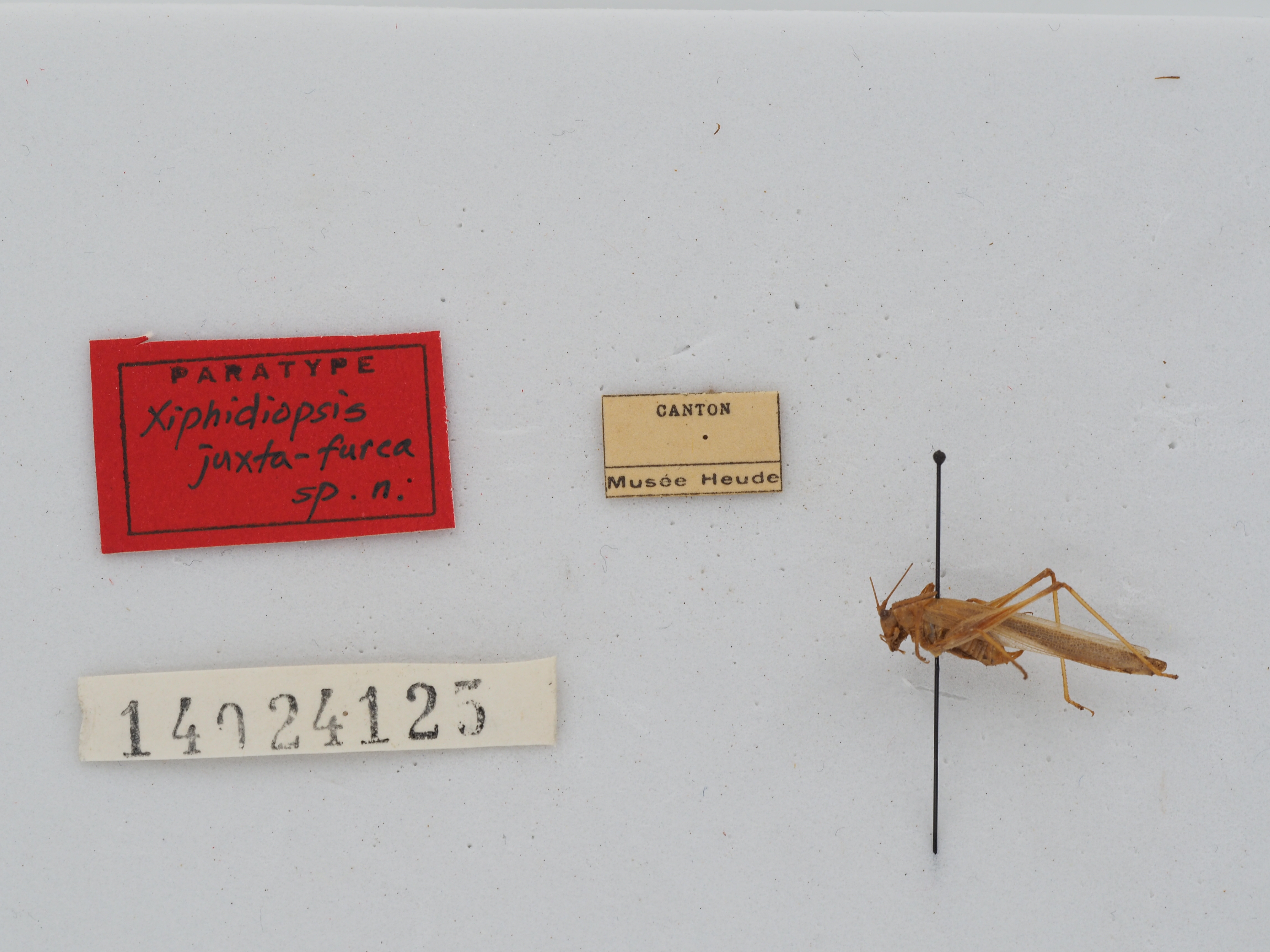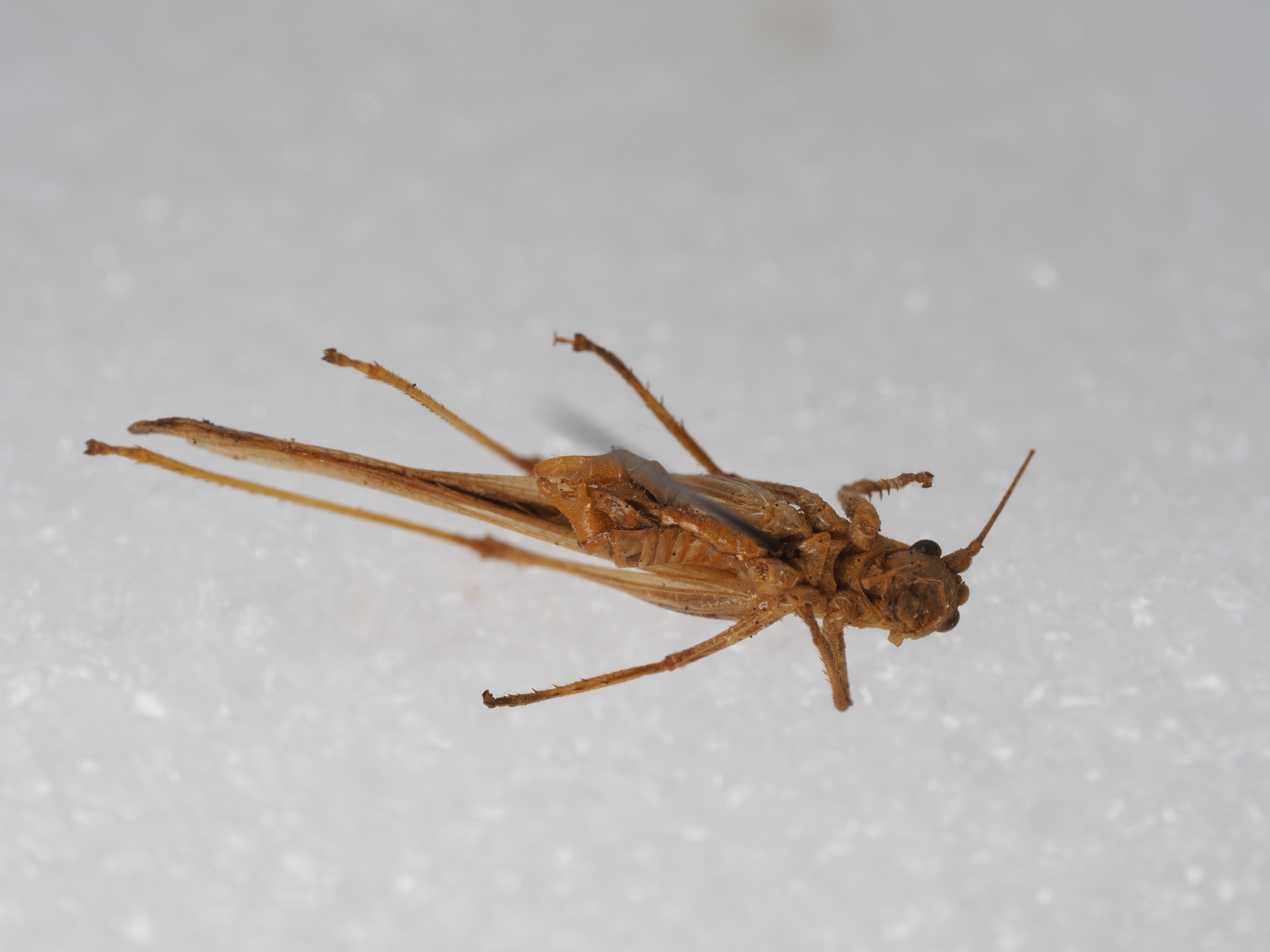 描述:雄性:头顶圆锥形,向前突出,背面具纵沟。复眼圆形,半球状向前突出。下颚须第5节稍长于第4节,端部略为扩大。前胸背板侧片后缘肩凹稍明显。前翅较远地超出后足股节顶端,后翅长于前翅。前足胫节腹侧内、外缘刺排列式为4,6(1,1)型,后足胫节背侧内、外缘各具小齿25一28个。腹部末节背板后缘具一对毗连的侧扁突起。尾须基半部厚实,内背侧具一指尖状小突起,在其下方具一大形腹片J尾须端半部较薄扁,近端部具小三角形内突。下生殖板形状似提琴,具中纵沟,端部较深地开裂。