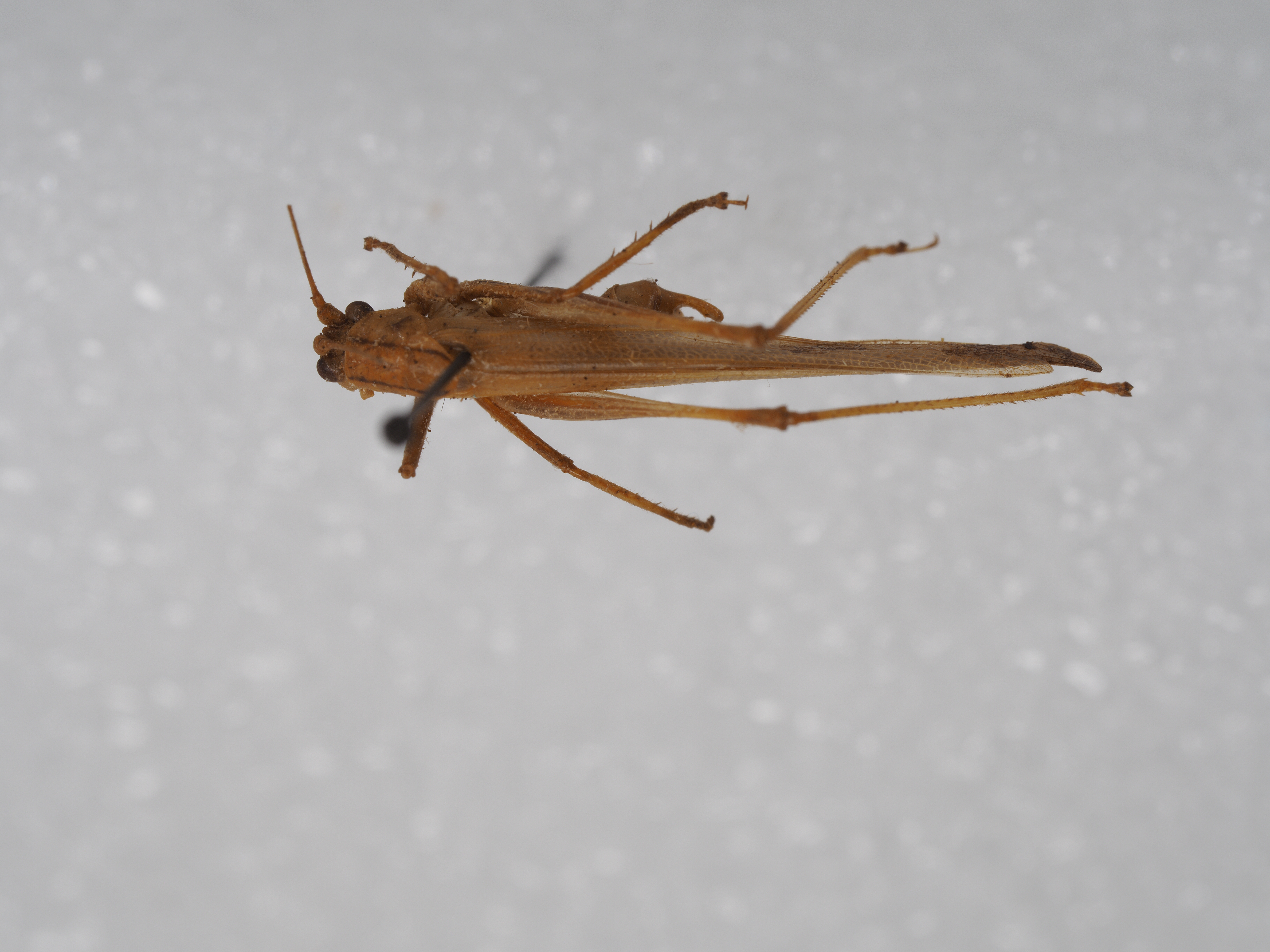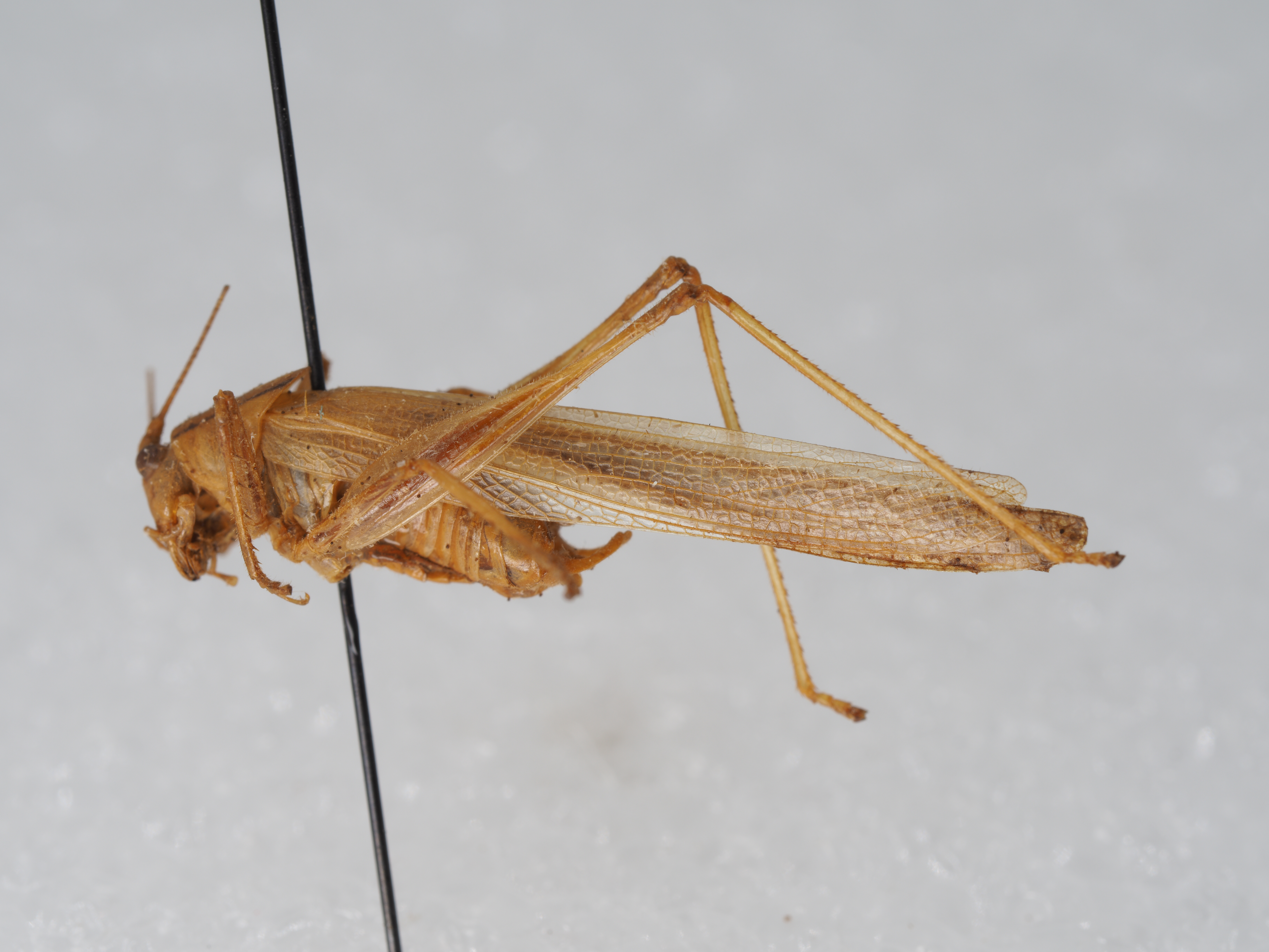 体褐黄色(活时或许为绿色)。前胸背板背面具晴黑色侧纵纹,后足股节膝叶顶端具暗色斑点,后足胫节背缘齿褐色。