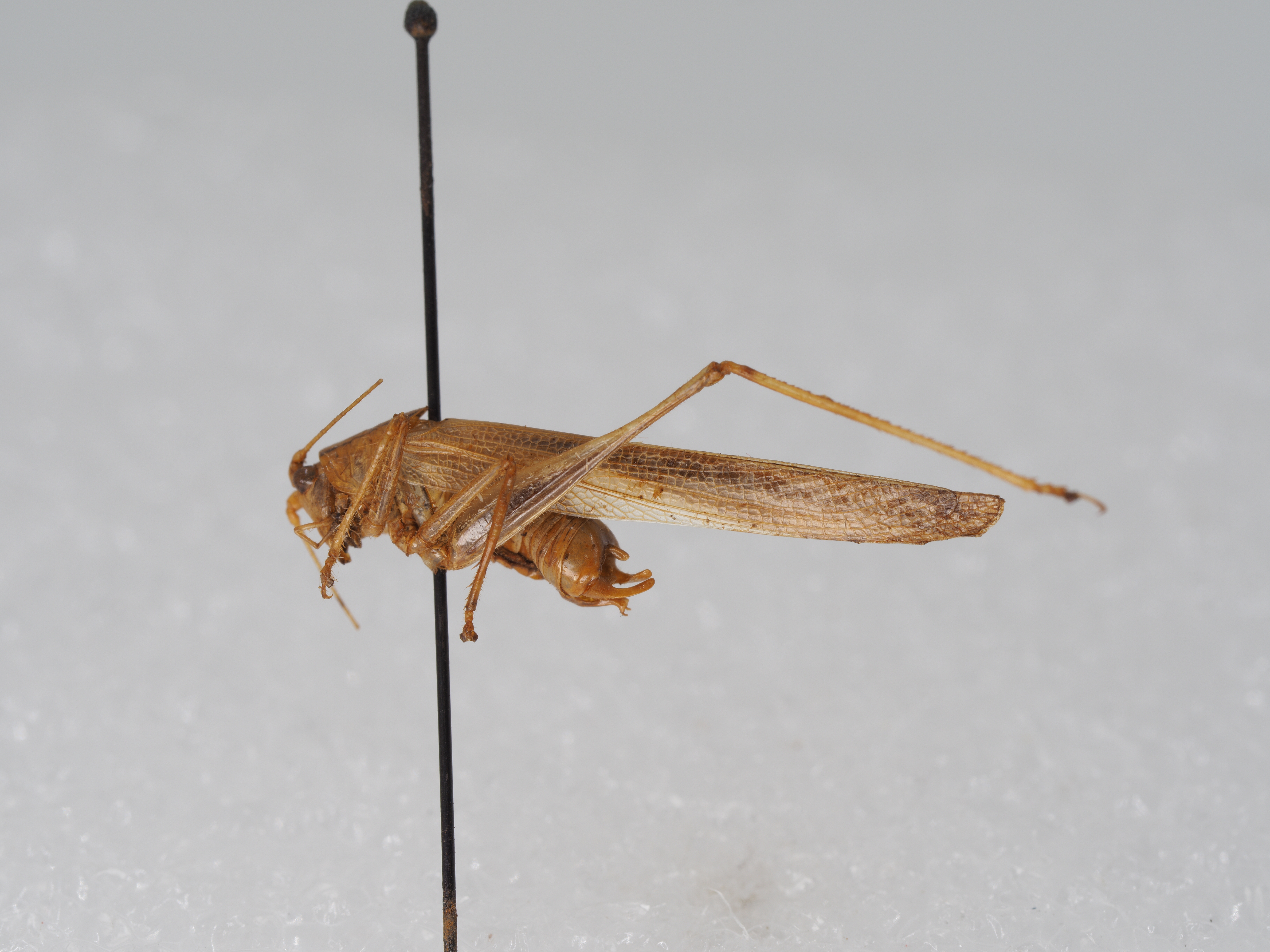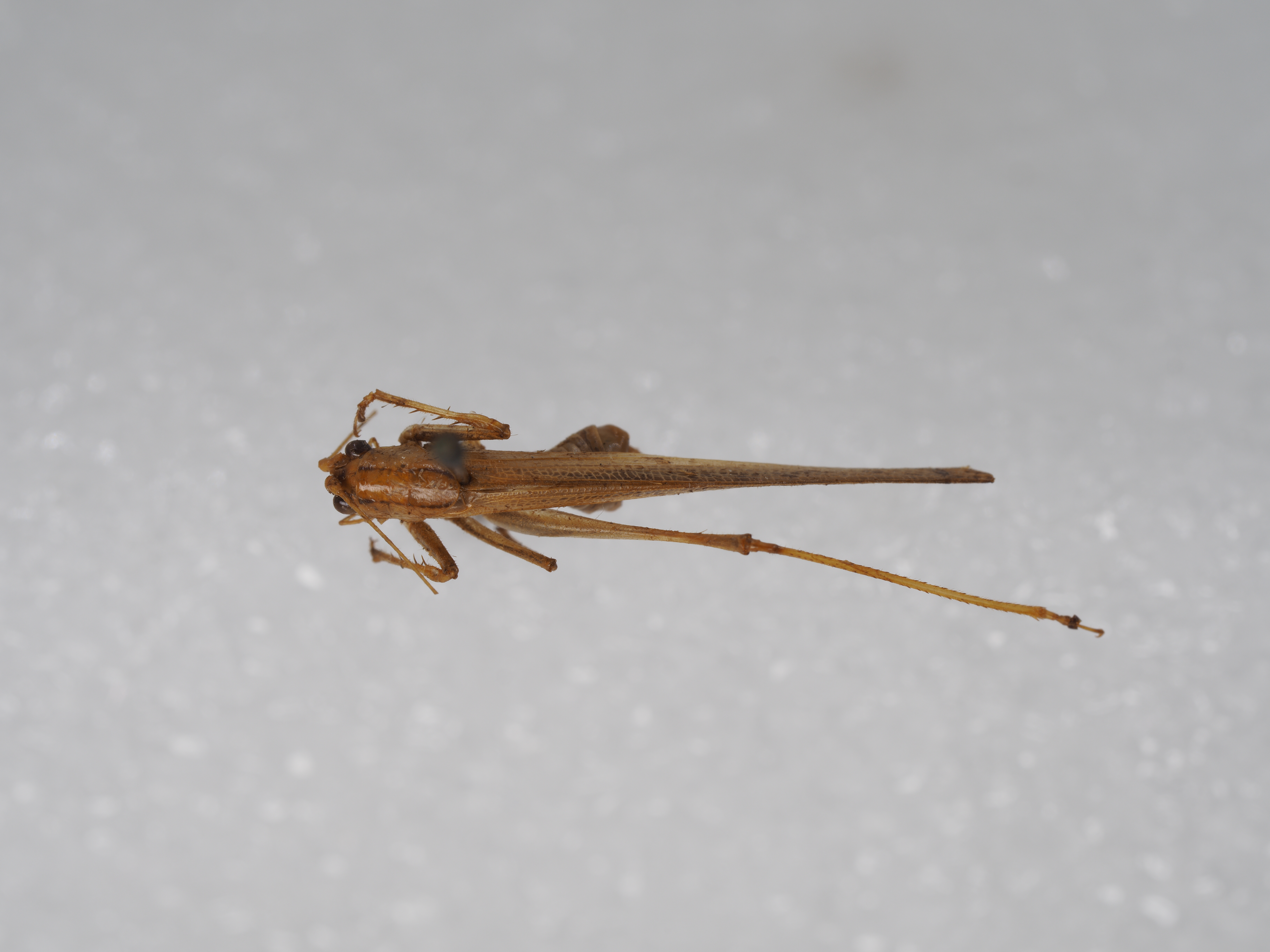 体褐黄色(活时或许为绿色)。前胸背板背面具晴黑色侧纵纹,后足股节膝叶顶端具暗色斑点,后足胫节背缘齿褐色。