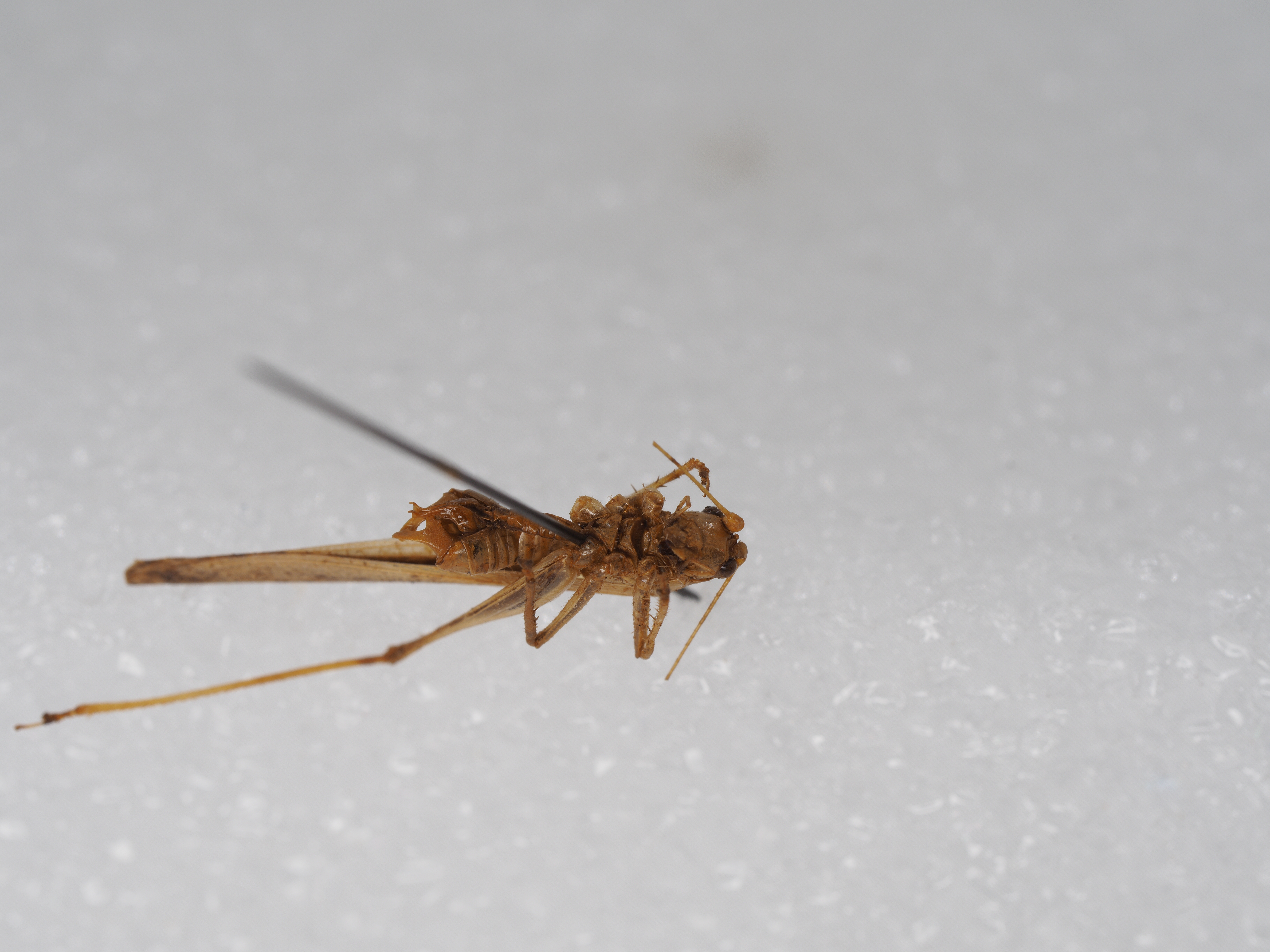 描述:雄性:头顶圆锥形,向前突出,背面具纵沟。复眼圆形,半球状向前突出。下颚须第5节稍长于第4节,端部略为扩大。前胸背板侧片后缘肩凹稍明显。前翅较远地超出后足股节顶端,后翅长于前翅。前足胫节腹侧内、外缘刺排列式为4,6(1,1)型,后足胫节背侧内、外缘各具小齿25一28个。腹部末节背板后缘具一对毗连的侧扁突起。尾须基半部厚实,内背侧具一指尖状小突起,在其下方具一大形腹片J尾须端半部较薄扁,近端部具小三角形内突。下生殖板形状似提琴,具中纵沟,端部较深地开裂。