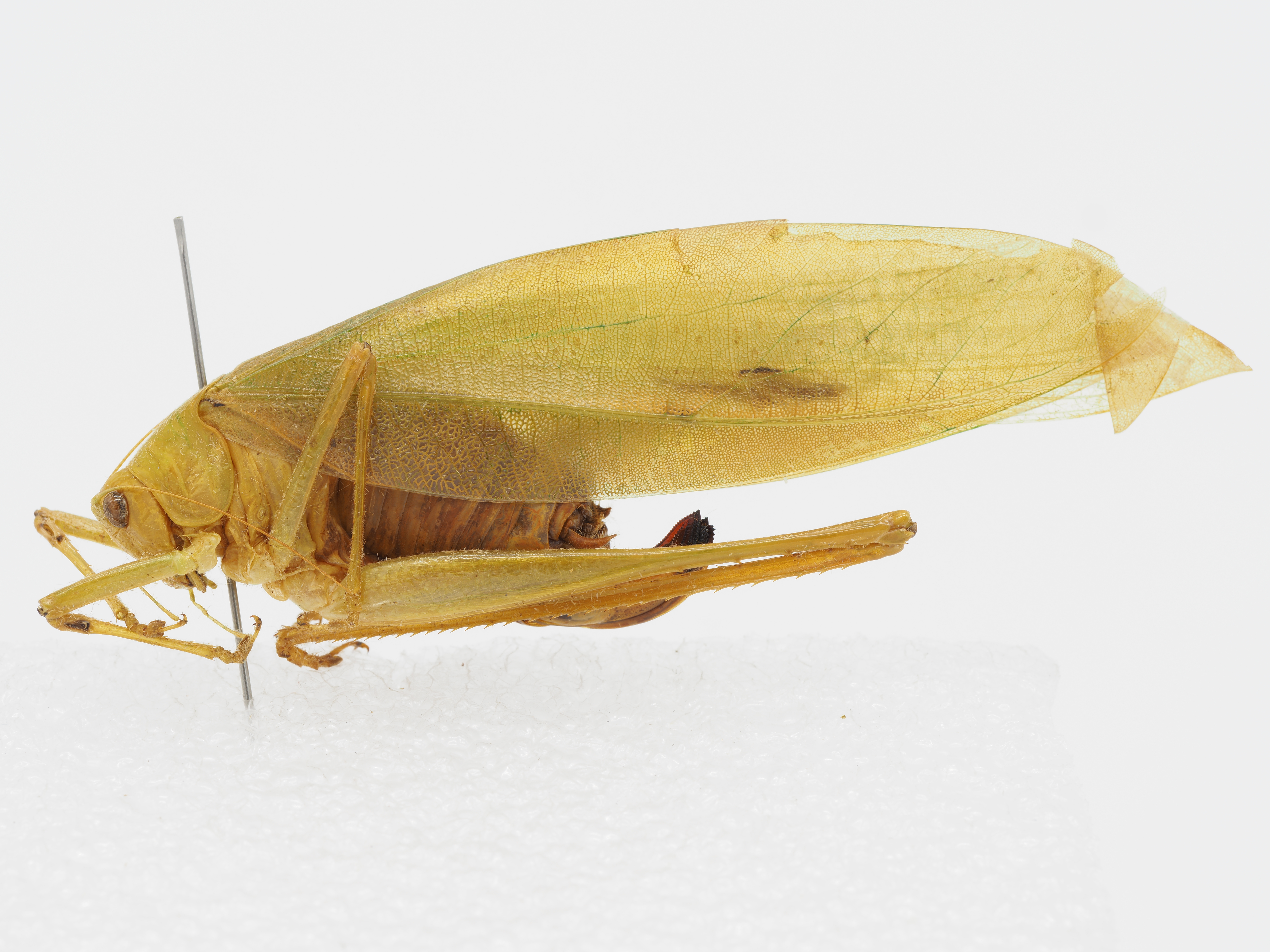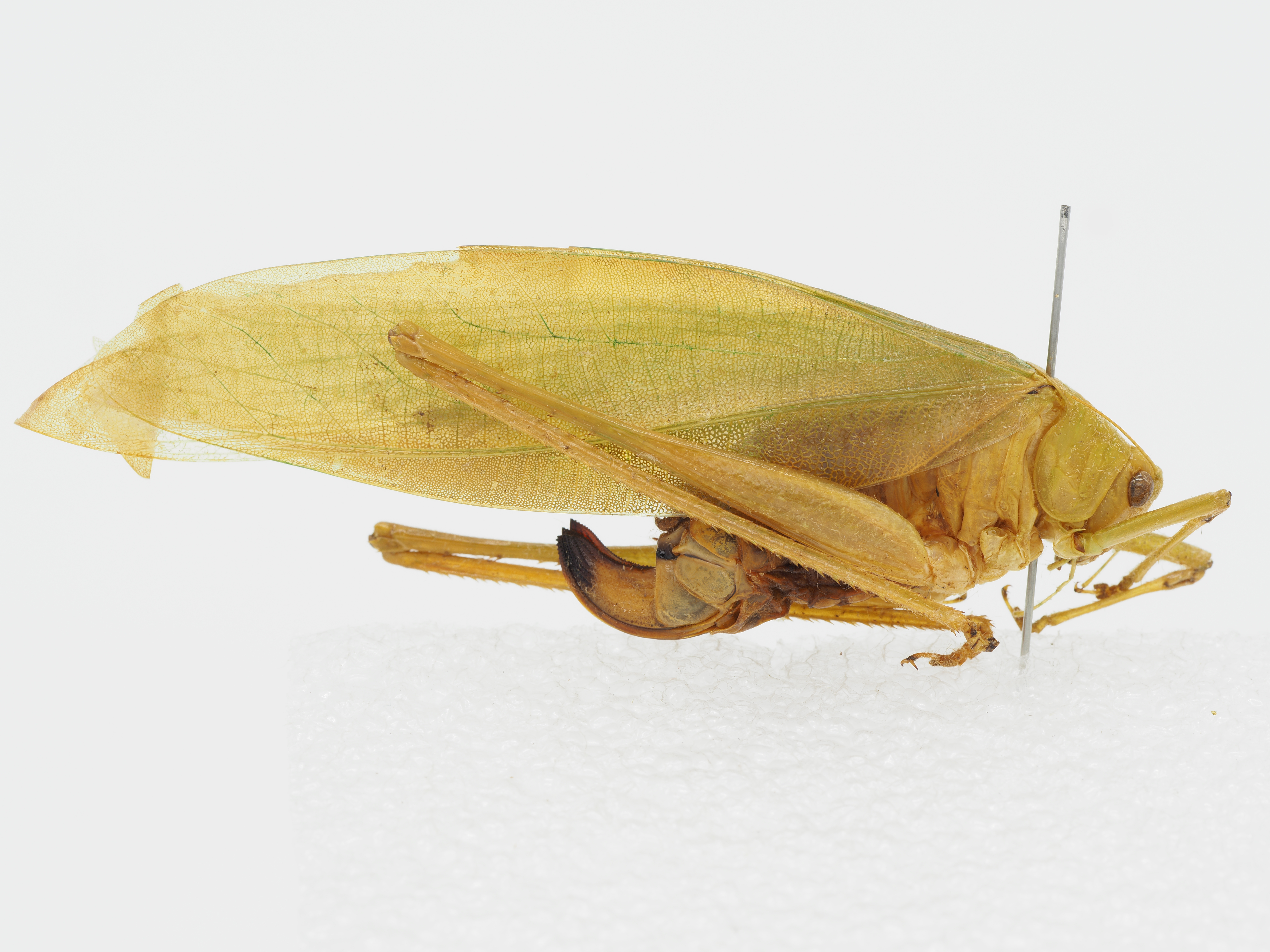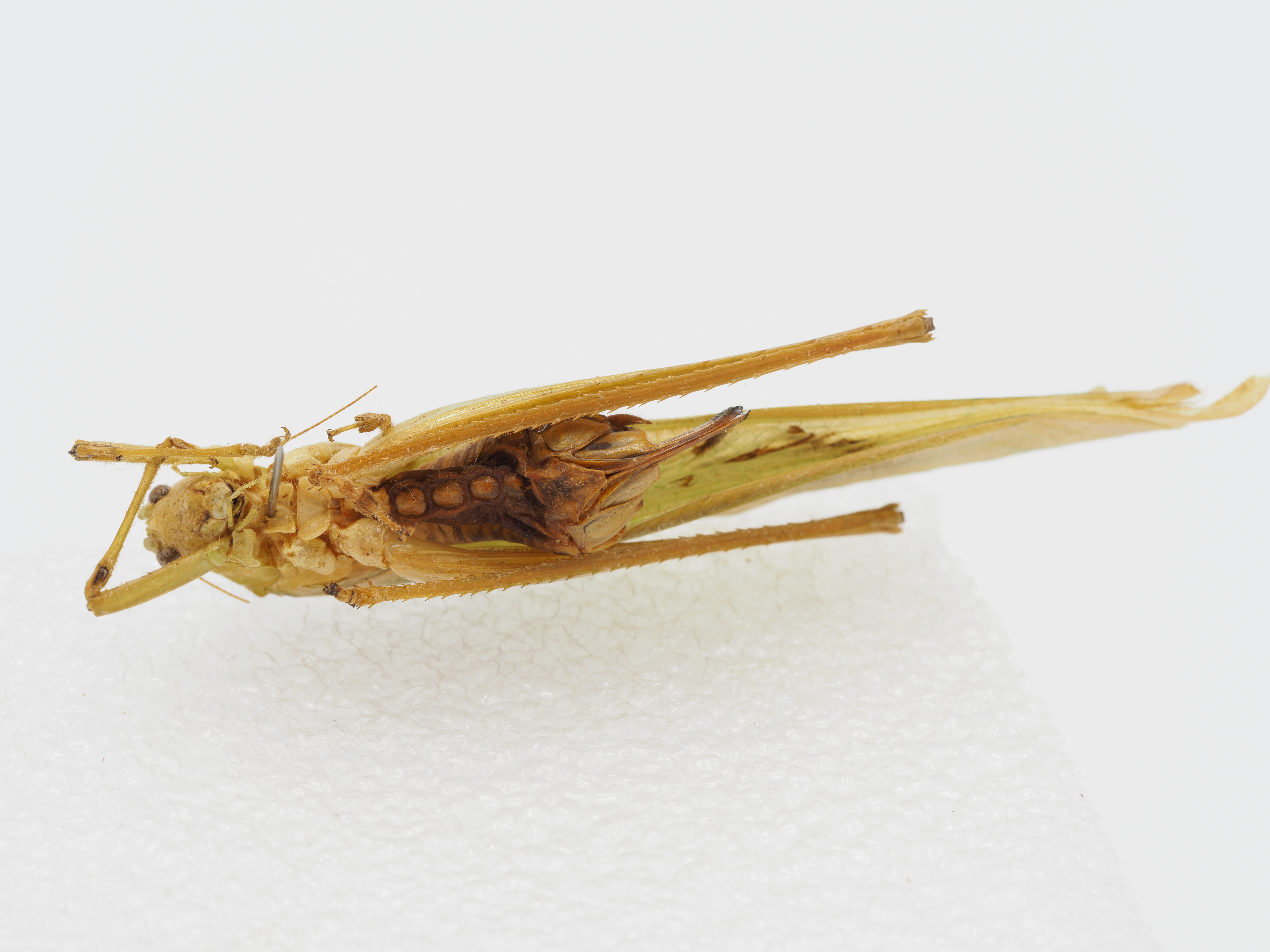 然后向端部渐变狭,翅端圆。前翅摩擦发音区基部约具 10 个较退化的小齿,其余区域具