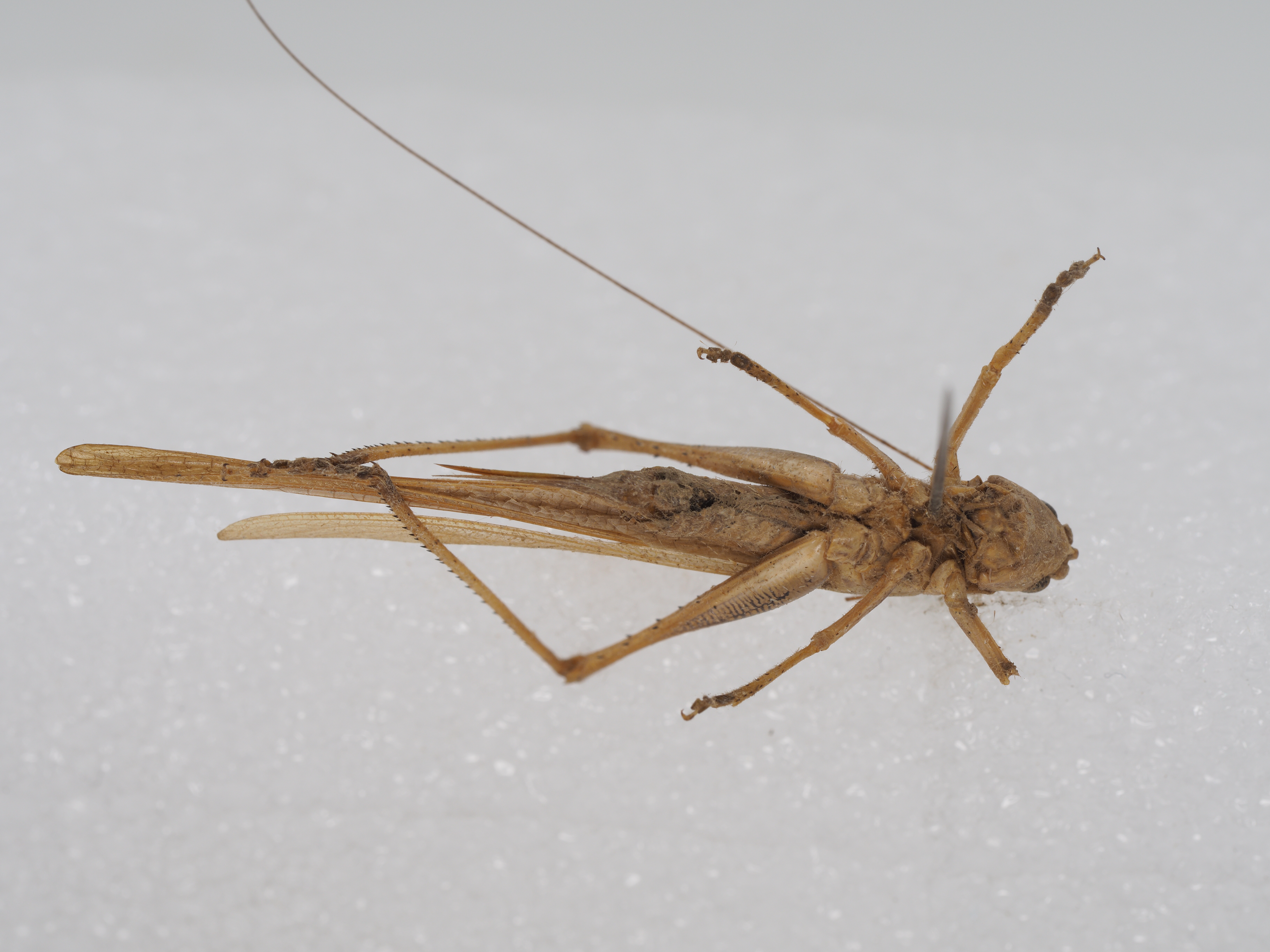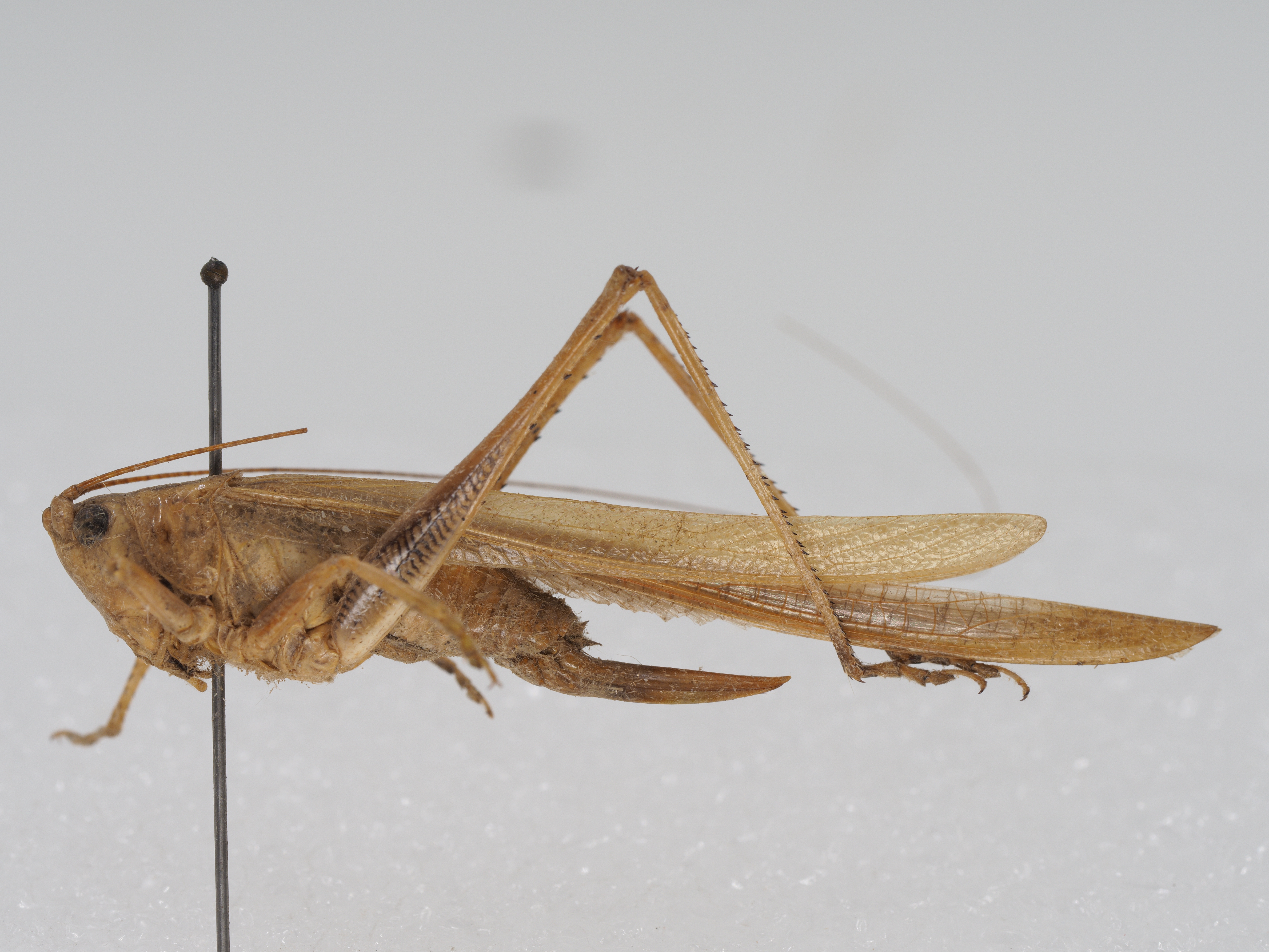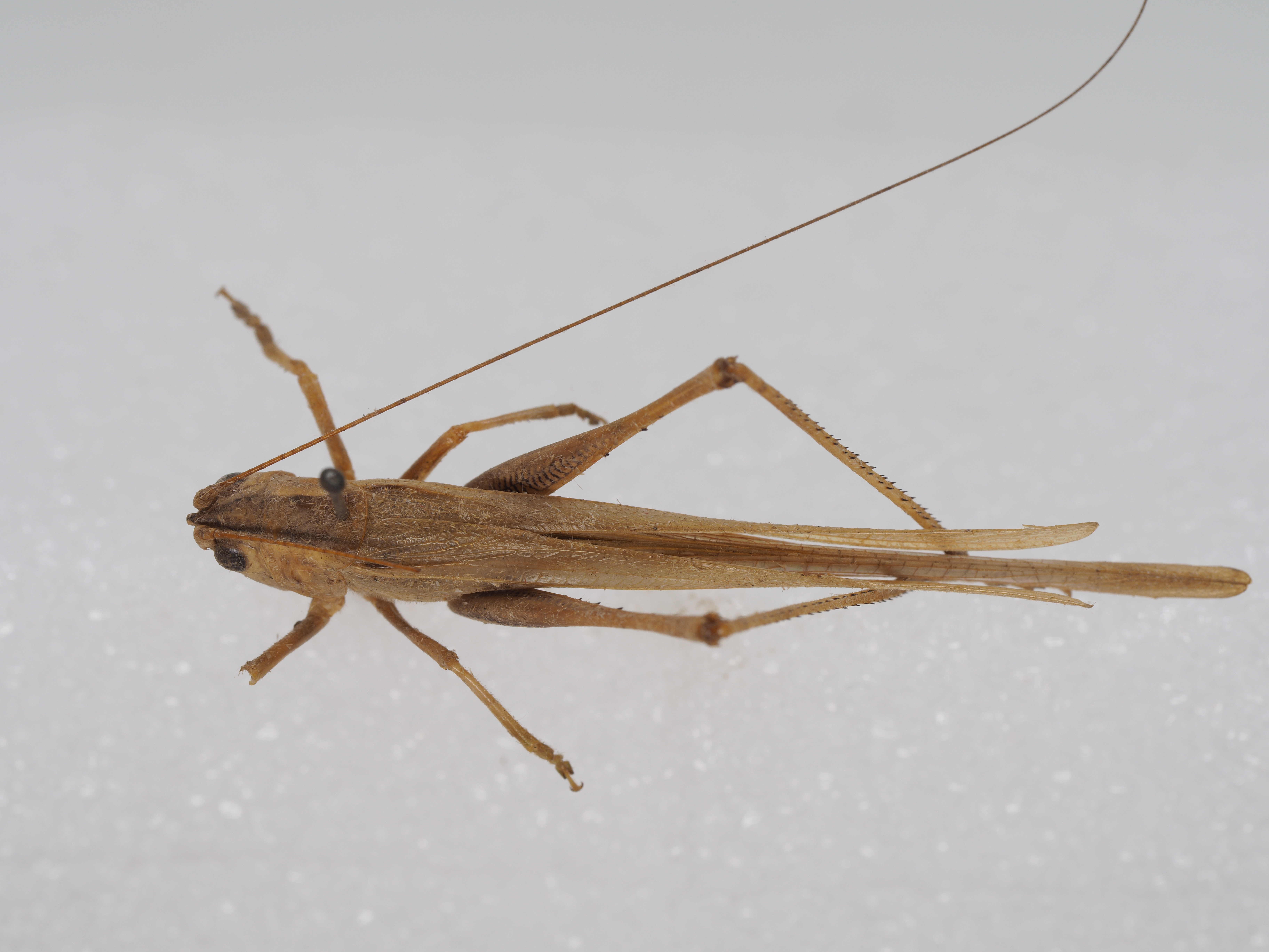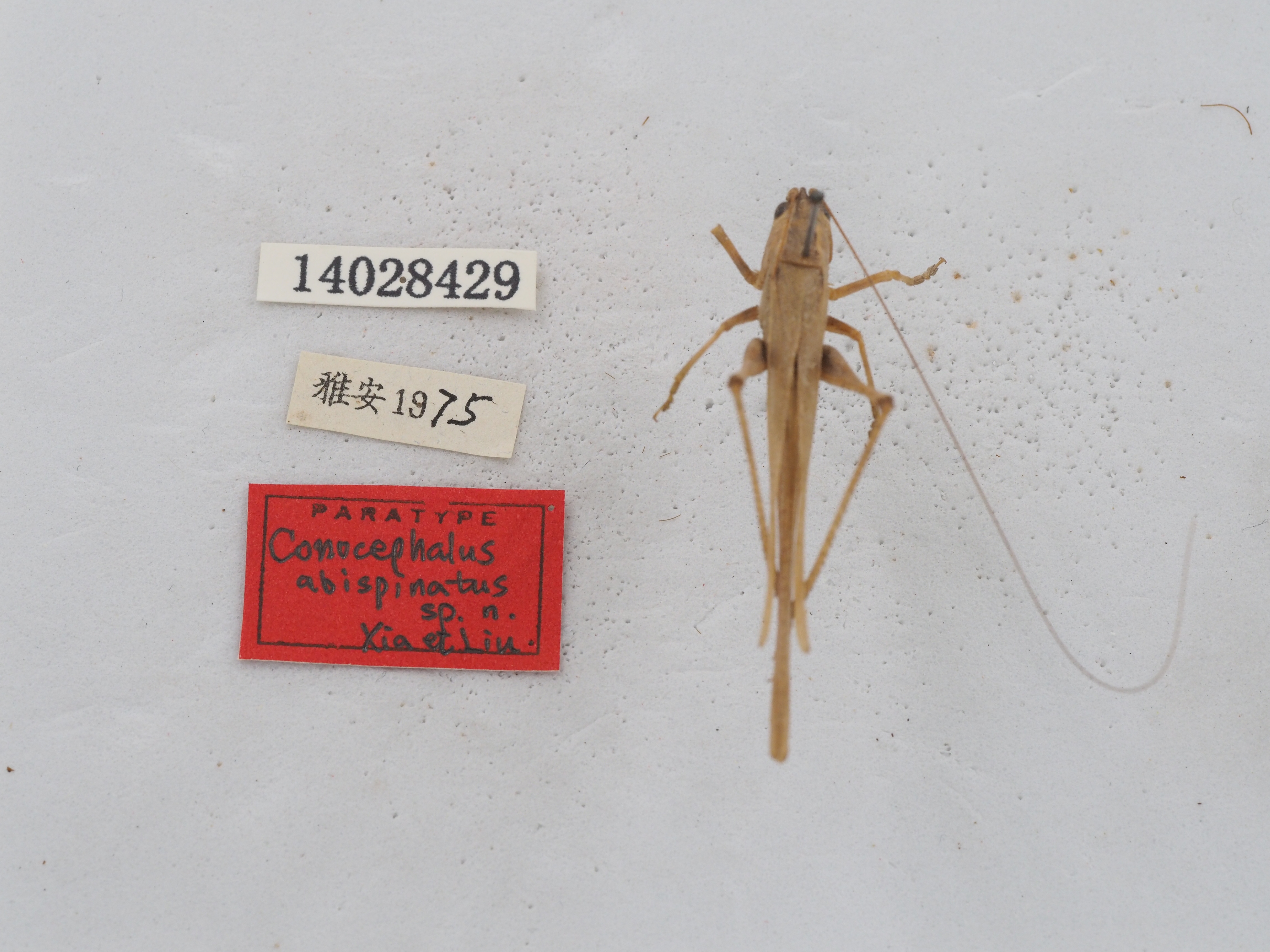 描述:雄性:体甚大。头顶较狭,约等于触角第一节宽之半;从前面观侧缘近乎平行,与颜顶仅具一细缝相分隔。前胸背板背面较平坦,侧片高明显大于长,下缘前段强倾斜。前胸腹板缺刺突。前翅颇远地超出后足股节顶端,后翅长于前翅,其超出部分约为前胸背板长的1.6-1.8倍。中足股节腹面具有外刺1-3个,后足股节腹面具内刺2-4个,外刺4一6个。腹部末节背板后缘平切。尾须端部较细长,内缘具有2齿。下生殖板后缘具宽V形的凹口,腹刺细长,其长约为宽3倍。