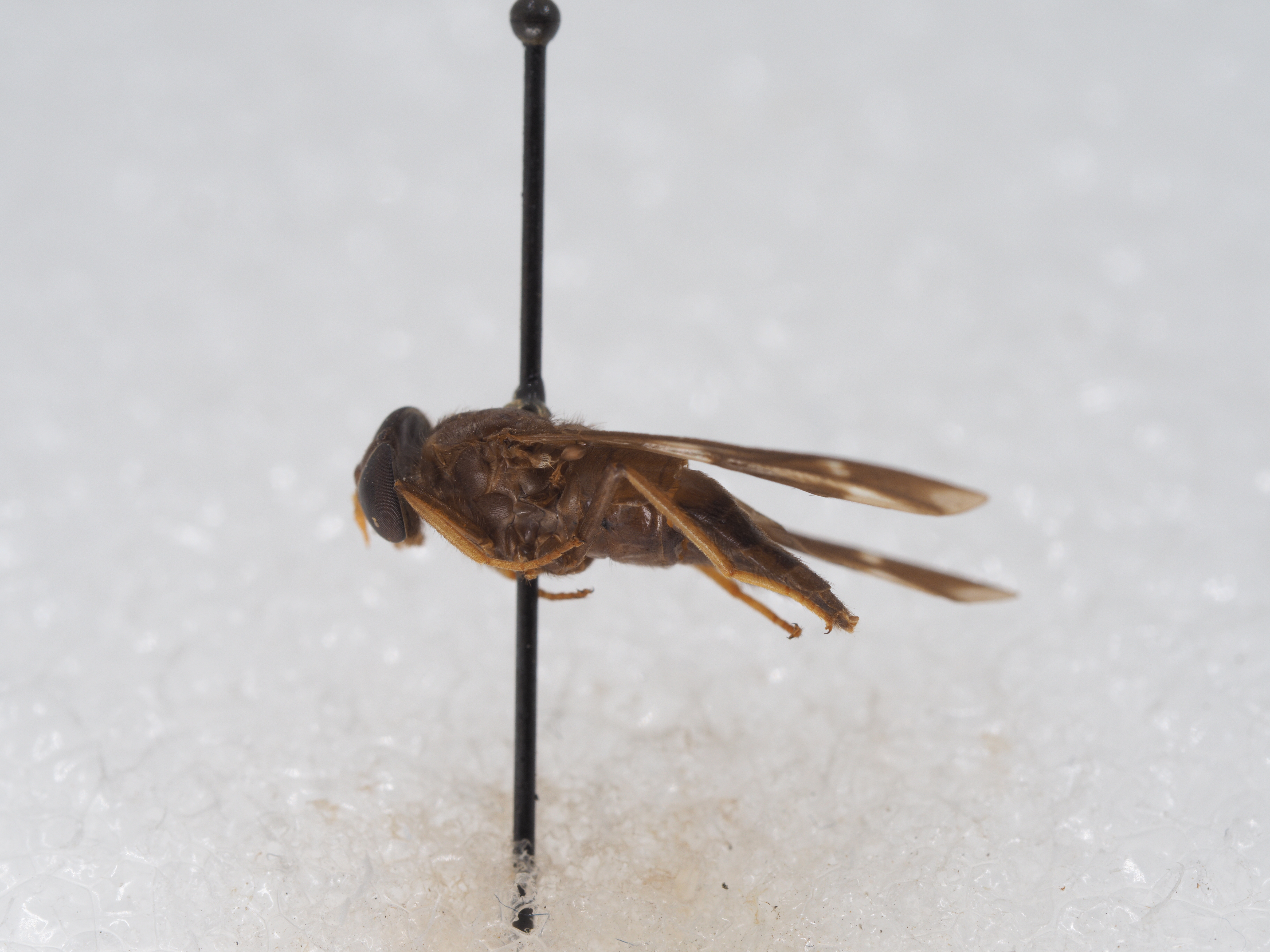 胸部:背板棕色,着生棕色毛,盾片具三条平行的红棕色细纵条,达到小盾片。足股节棕色,着生棕色毛;胫节和跗节黄棕色,着生黄色毛,后足胫节端部无距。翅具棕色斑,r4无附脉,第1后室开放。腋瓣有一丛白色毛。平衡棒棕色。