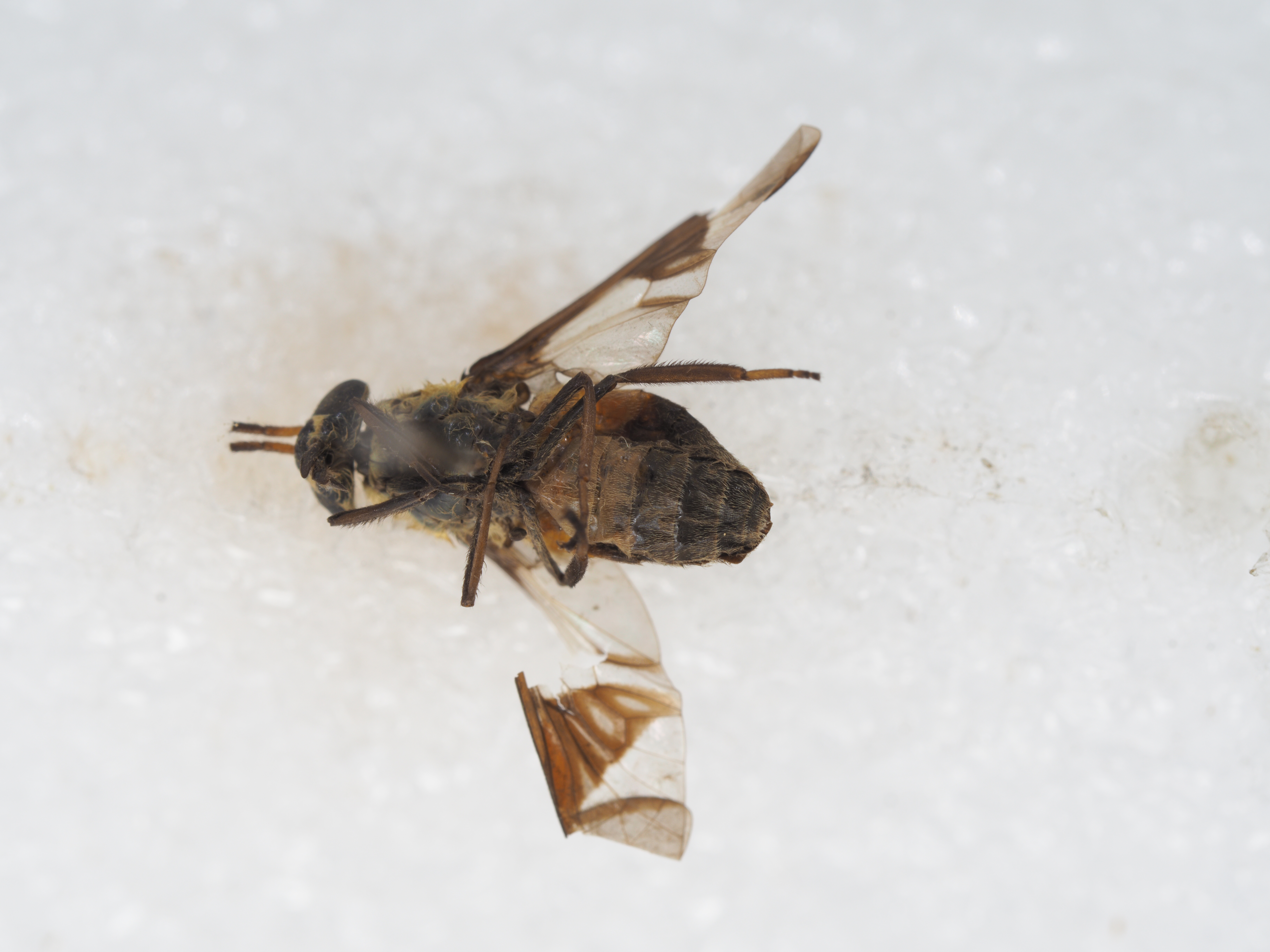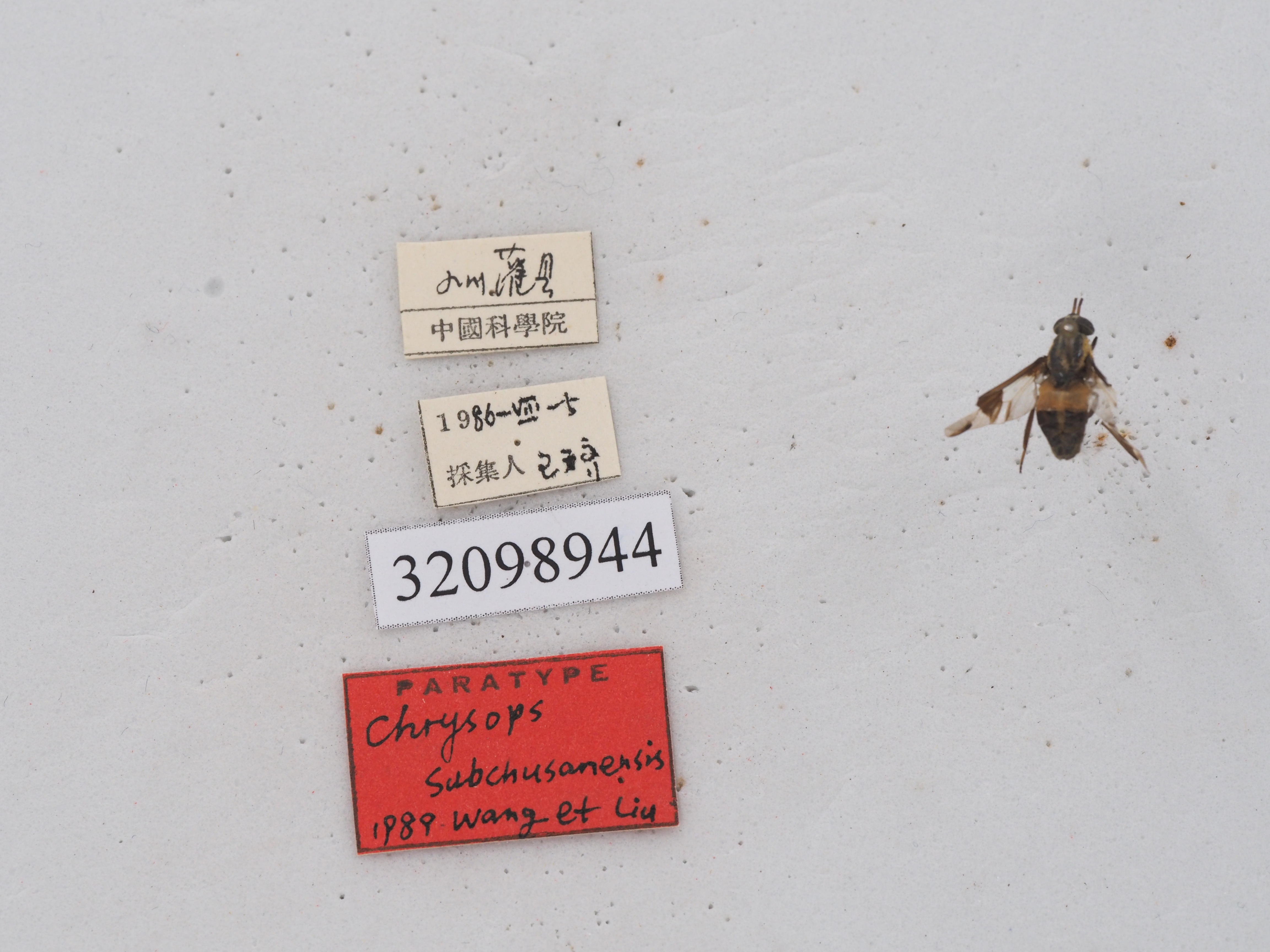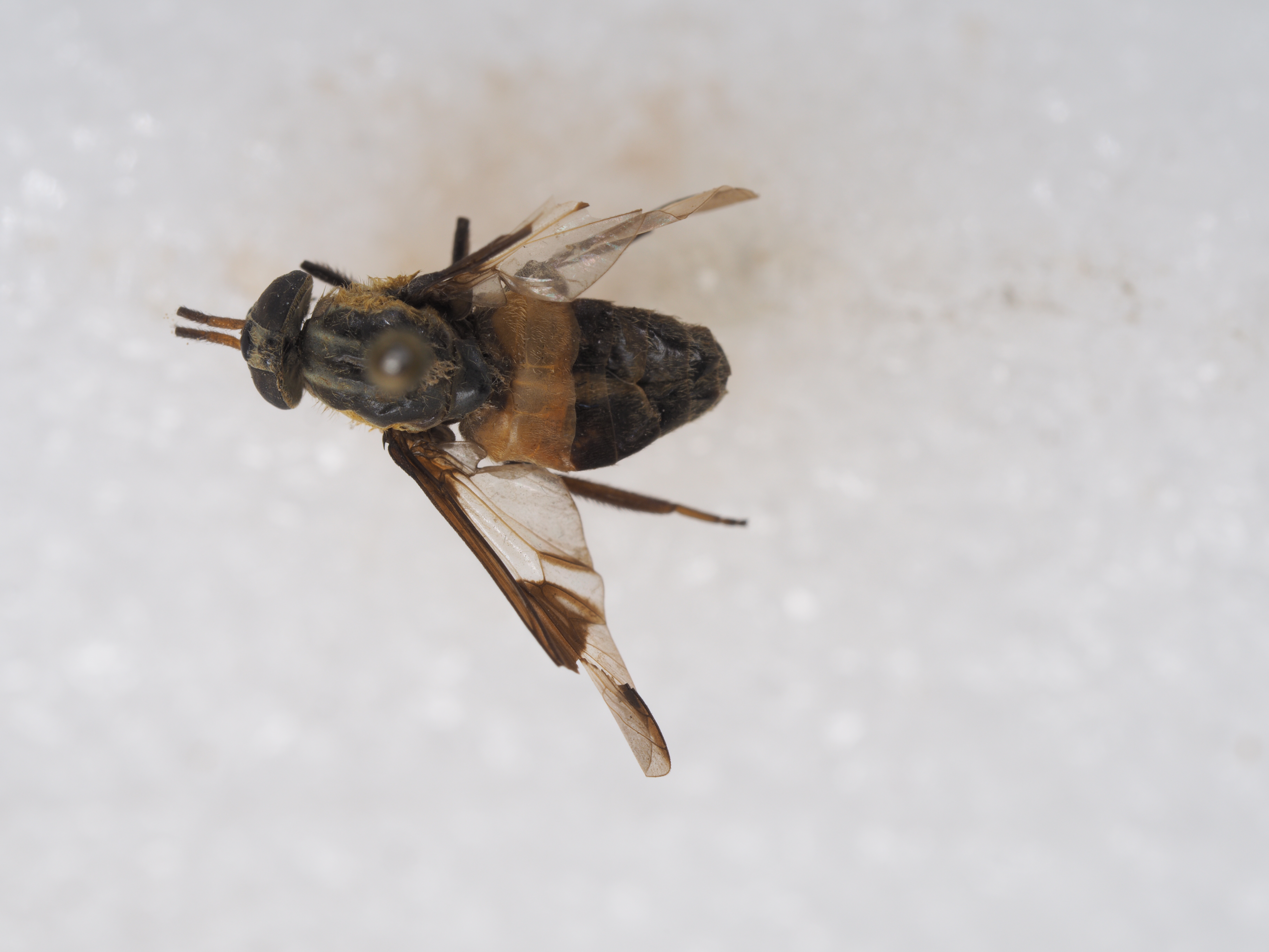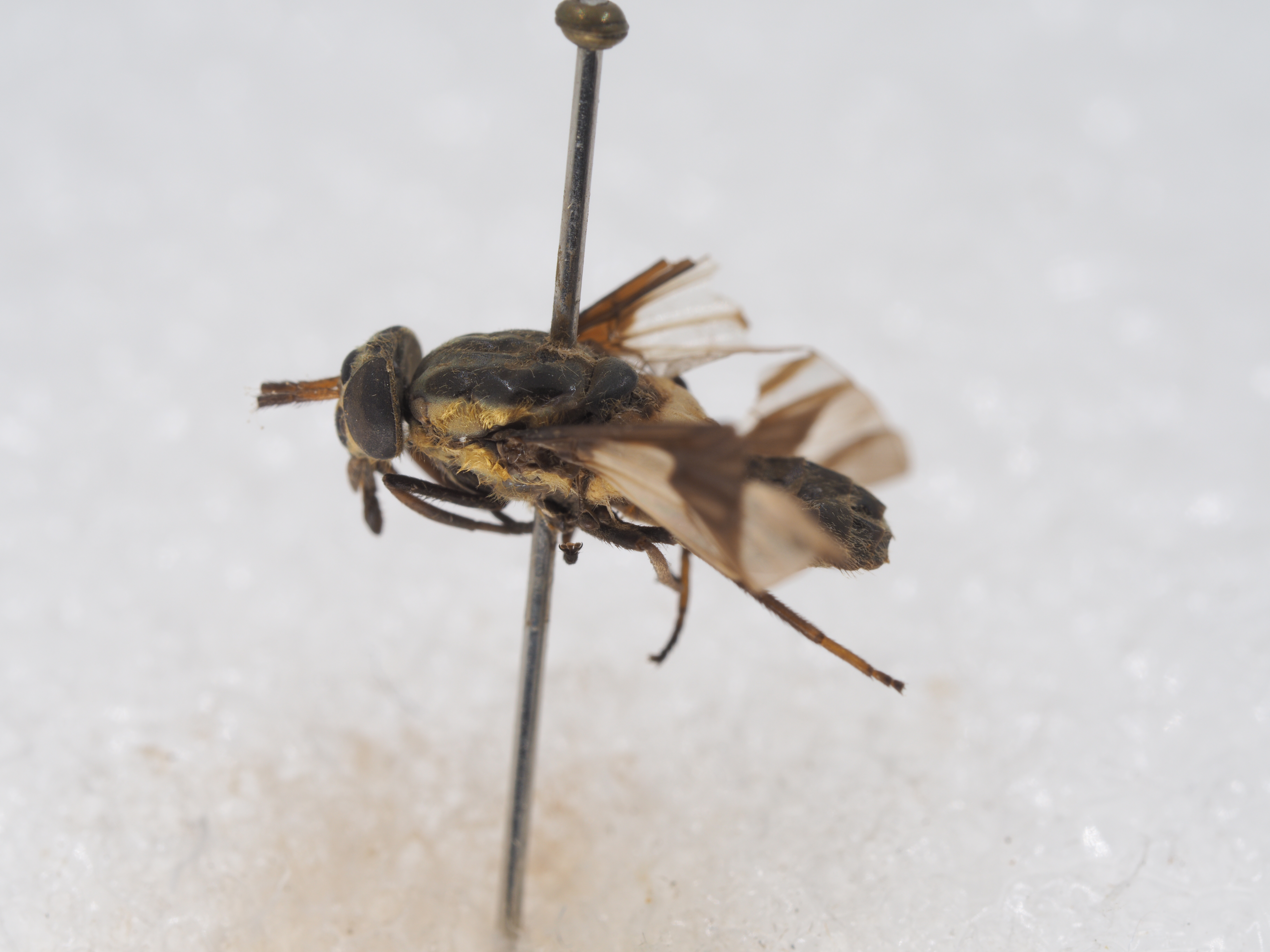 胸部:亮黑色,着生金黄色毛。盾片中央两条宽的灰兰色纵带不达到小盾片;两侧具黄色毛组成的纵带。侧板上部灰蓝色,着生金黄色毛,下部黑色。足基节和股节暗棕色;除前足胫节端部暗棕色外,其余胫节均为橙棕色;前足跗节暗棕色,中、后足跗节除端部暗棕色外均为橙棕色;全足着生黑毛夹杂灰棕色毛。翅斑褐色,径室、中室及第4后室中央具透明斑;端斑与横带斑连接处几乎占据第1径室,端部占r4脉长度1/7。平衡棒黑色。