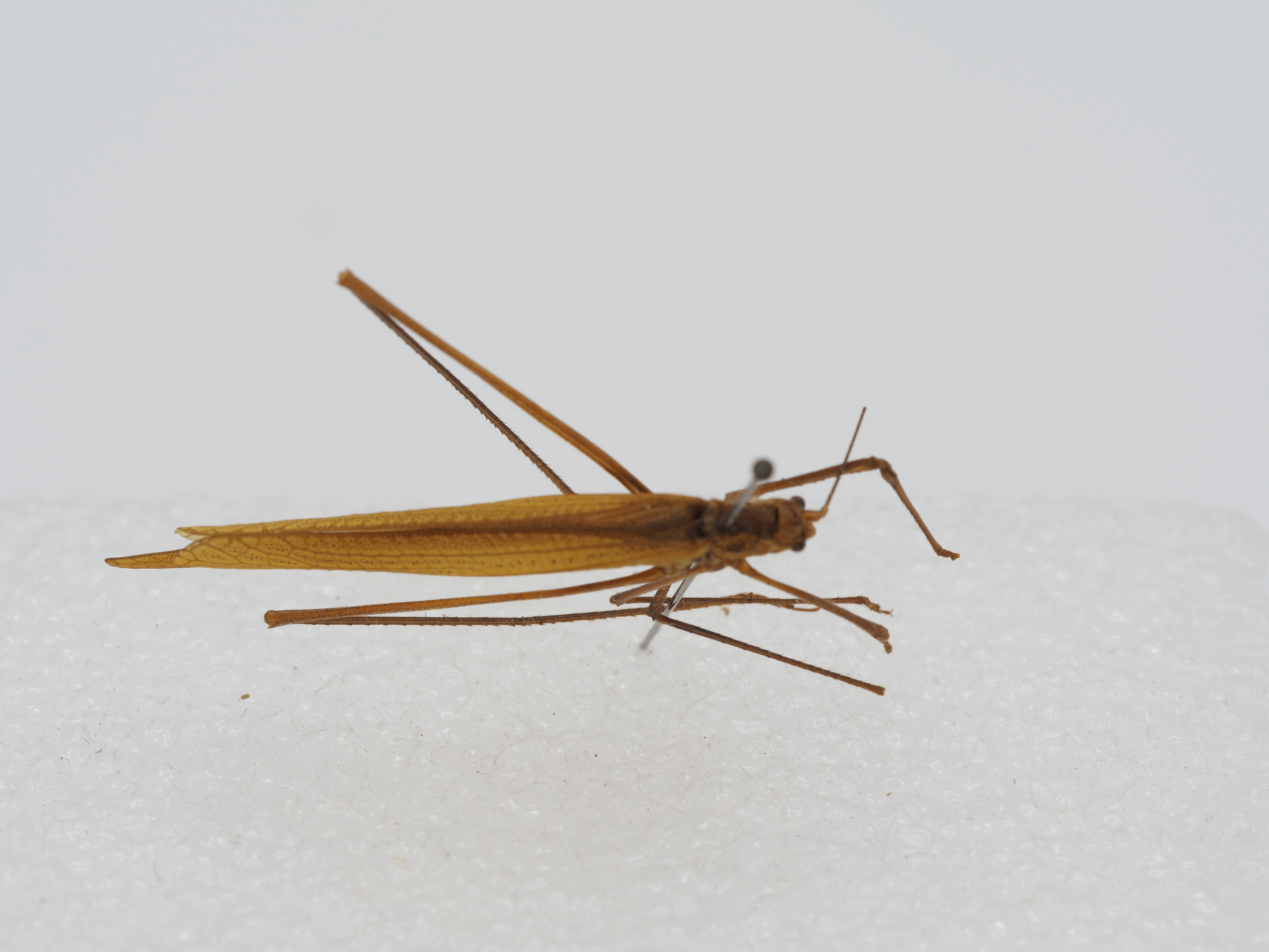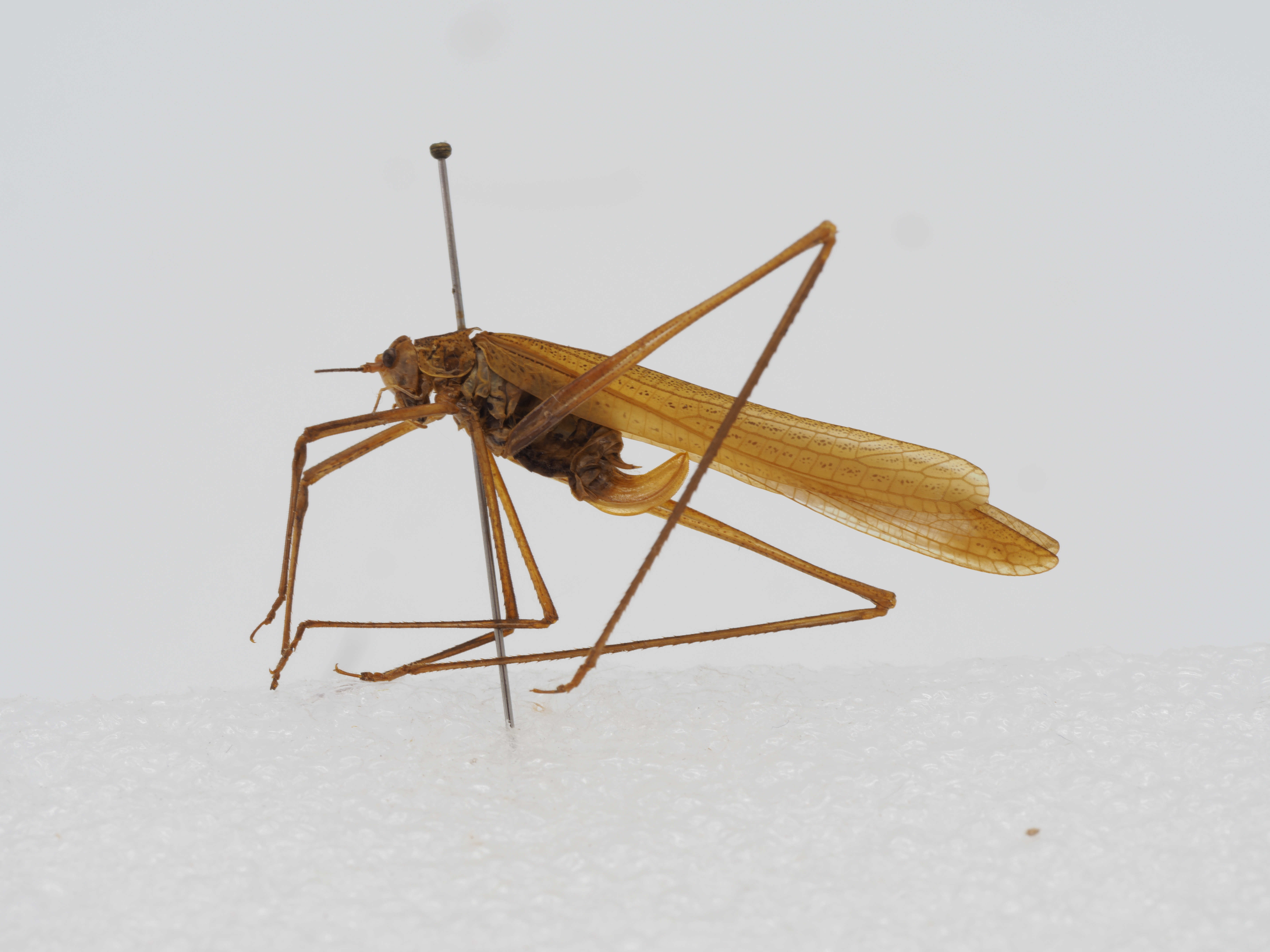 描述:雄性体形较小。头顶尖角形,端半部侧扁,狭于触角第一节,背面具沟;后头隆起。复眼卵园形,突出,前胸背板背面微圆凸,沟后区扁平,缺侧隆线倒片稍微长大于宽,下缘倾斜,后下角圆形,后缘肩凹稍明显。前翅较狭、稍超过后足股节端部;Rs脉从R脉中部之前分出,具4分枝;横脉排列较规则。后翅长于前翅。前足基节缺刺。前足股节腹面内缘具4-7个小刺,外缘缺刺;中足股节腹面内极缺刺,外缘具12-15个小刺;后足股节腹面内缘缺刺,外缘具 0-3个小刺,前足胫节背面具纵沟和背距,内侧和外侧听器均为封闭型。第十腹节背板后缘平截形。,肛上板延长,基部和端部约等宽,侧缘几乎平行,后缘具弱的凹缘,尾须细长,到达或稍超过下生殖板顶端、内弯,端部具一尖刺。下生殖板狭长,端半部较强地向上弯曲,近端部背腹面向扩大;端部的1/3开裂成两叶,内侧表面具微小的细刺。雌性,产卵瓣侧扁,较强地向上弯曲,边缘具细齿。体淡褐黄色。头部和前胸背板背面、