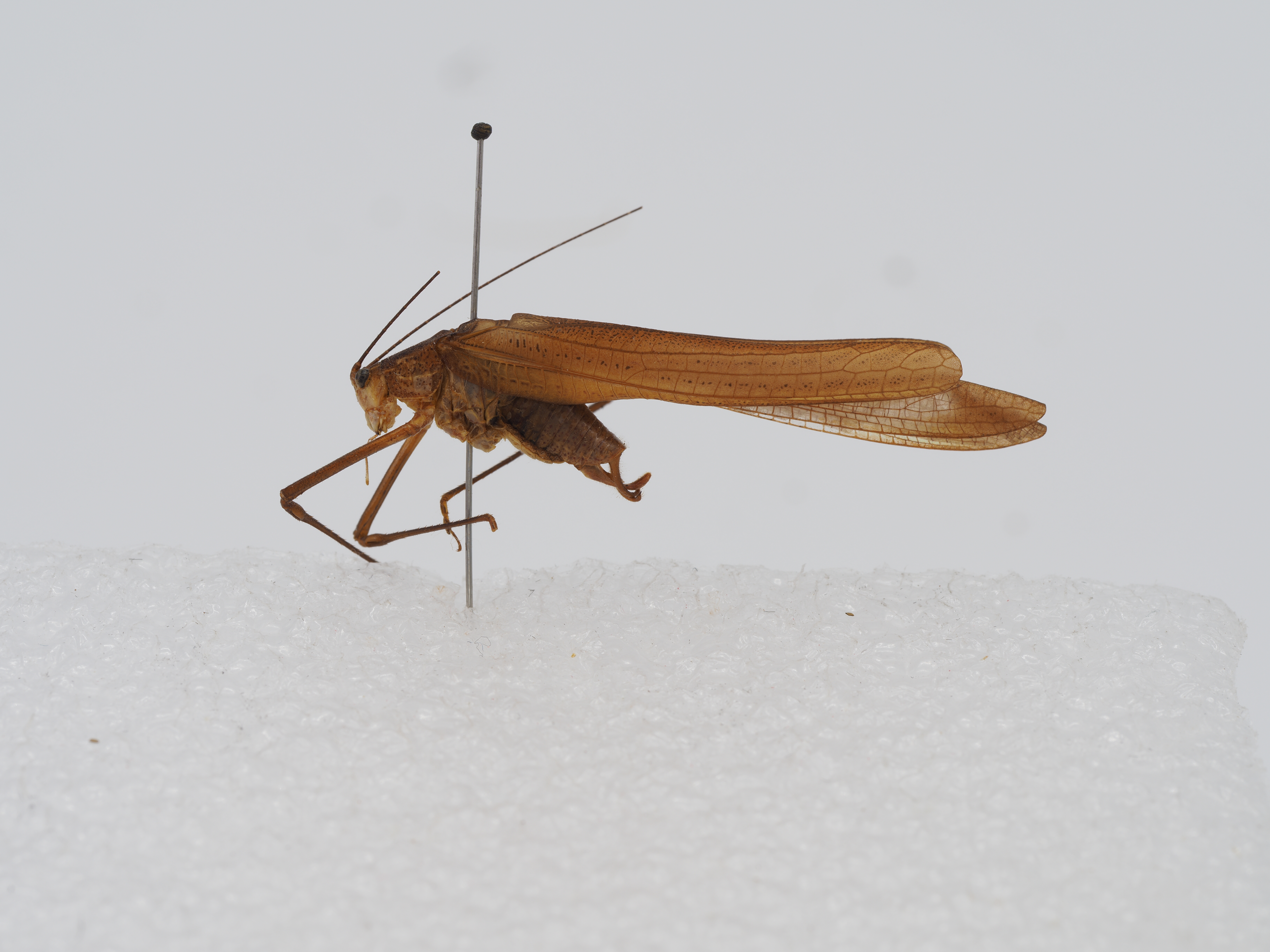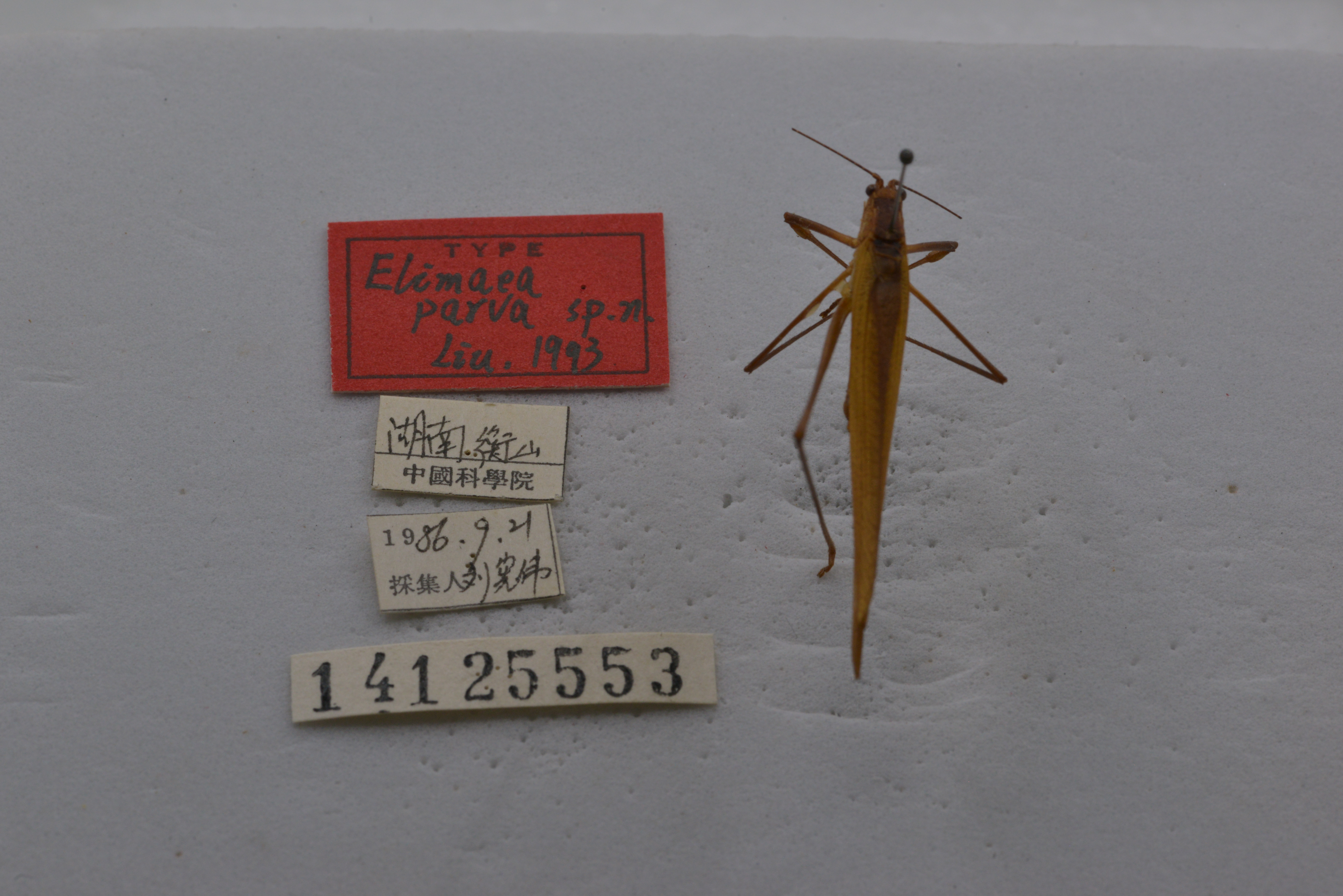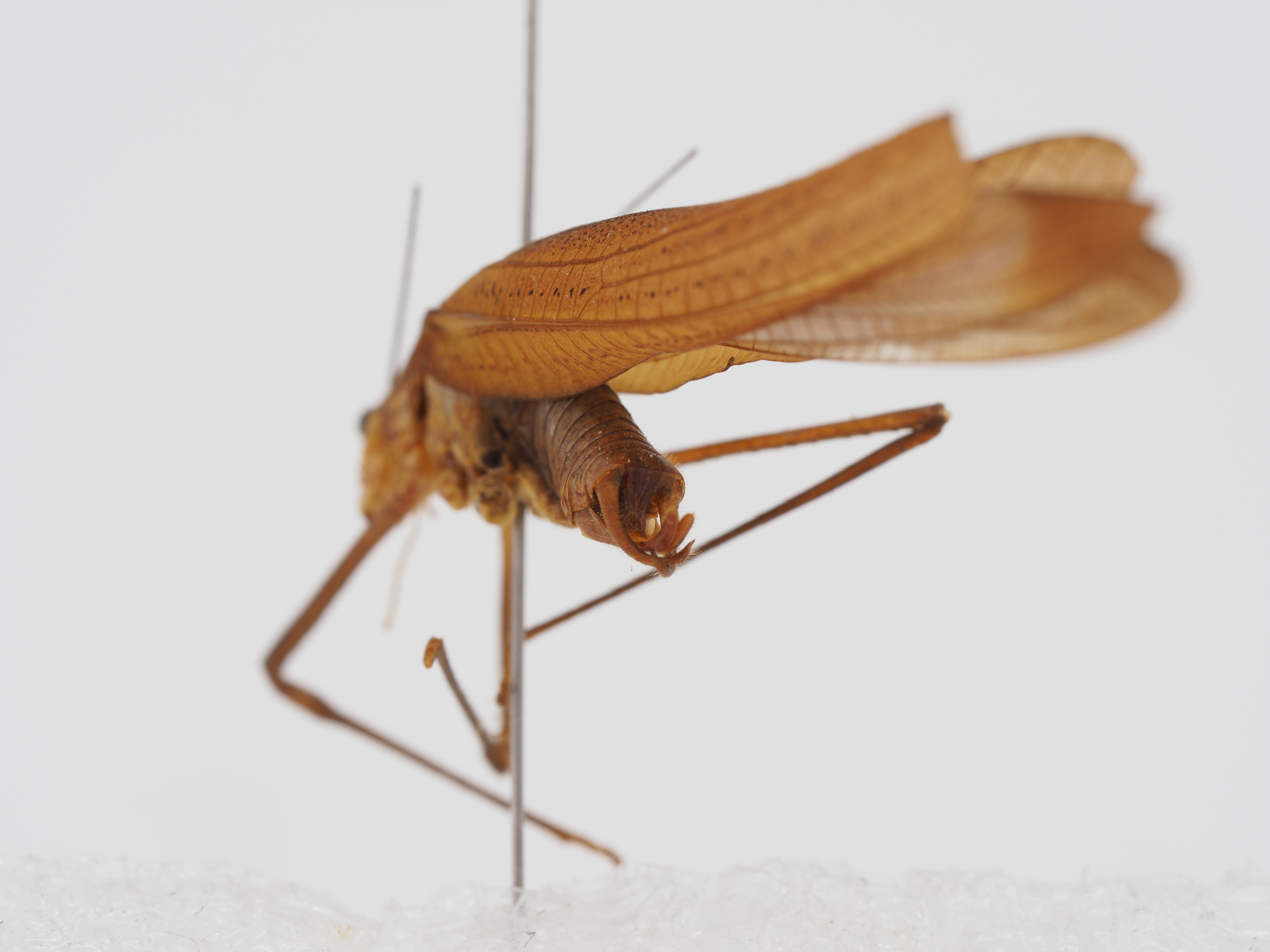 描述:雄性体形较小。头顶尖角形,端半部侧扁,狭于触角第一节,背面具沟;后头隆起。复眼卵园形,突出,前胸背板背面微圆凸,沟后区扁平,缺侧隆线倒片稍微长大于宽,下缘倾斜,后下角圆形,后缘肩凹稍明显。前翅较狭、稍超过后足股节端部;Rs脉从R脉中部之前分出,具4分枝;横脉排列较规则。后翅长于前翅。前足基节缺刺。前足股节腹面内缘具4-7个小刺,外缘缺刺;中足股节腹面内极缺刺,外缘具12-15个小刺;后足股节腹面内缘缺刺,外缘具 0-3个小刺,前足胫节背面具纵沟和背距,内侧和外侧听器均为封闭型。第十腹节背板后缘平截形。,肛上板延长,基部和端部约等宽,侧缘几乎平行,后缘具弱的凹缘,尾须细长,到达或稍超过下生殖板顶端、内弯,端部具一尖刺。下生殖板狭长,端半部较强地向上弯曲,近端部背腹面向扩大;端部的1/3开裂成两叶,内侧表面具微小的细刺。雌性,产卵瓣侧扁,较强地向上弯曲,边缘具细齿。体淡褐黄色。头部和前胸背板背面、