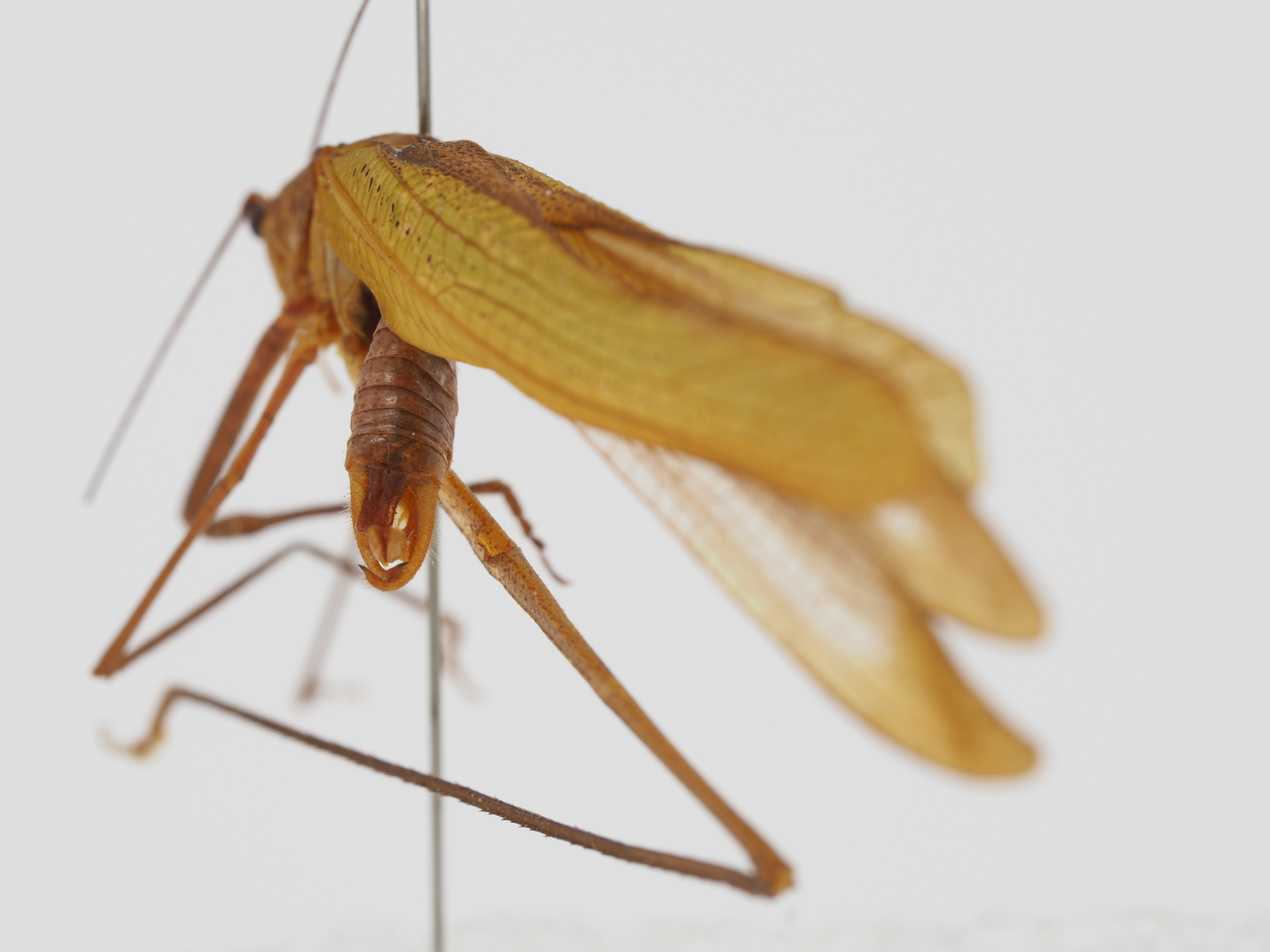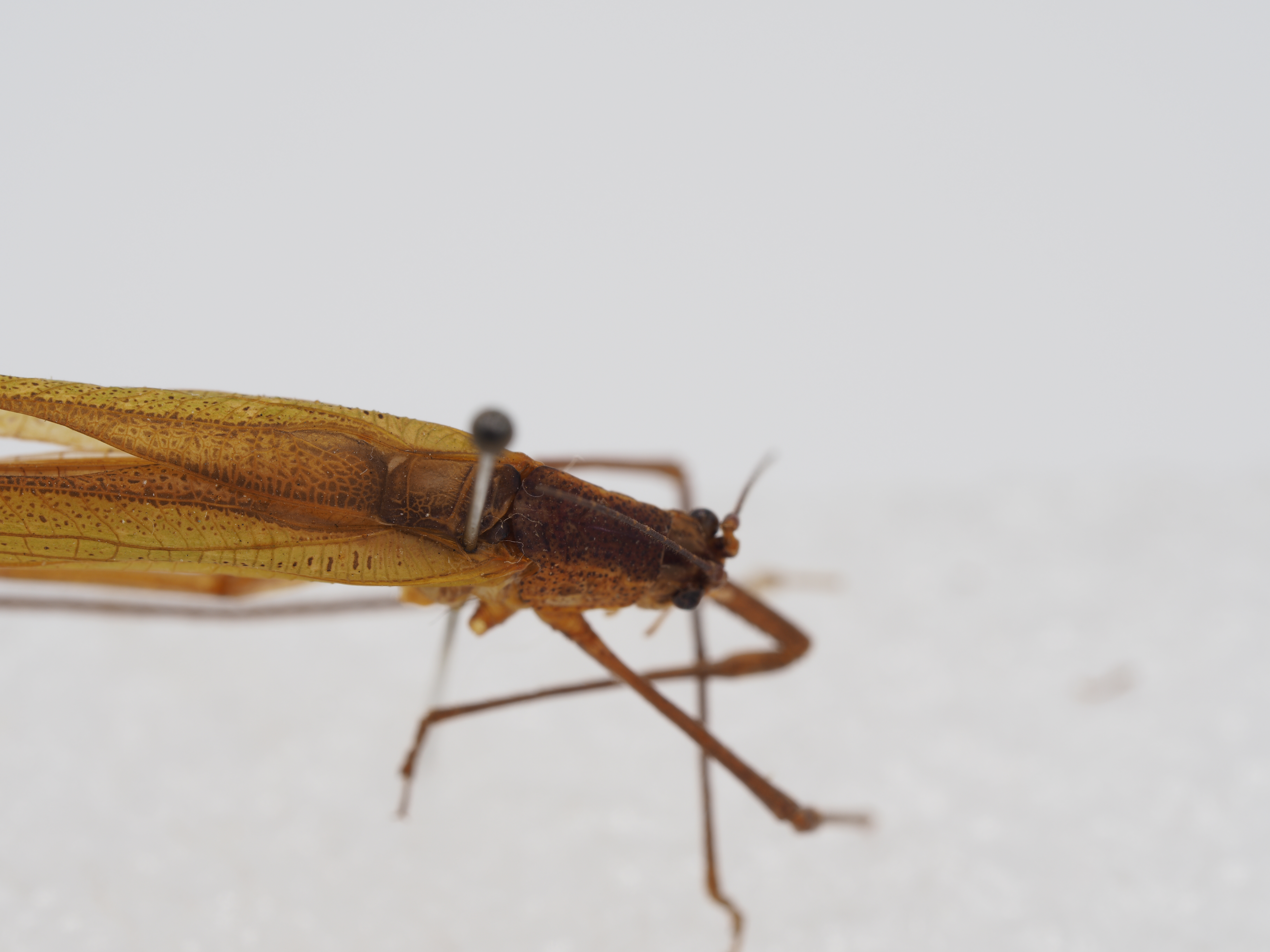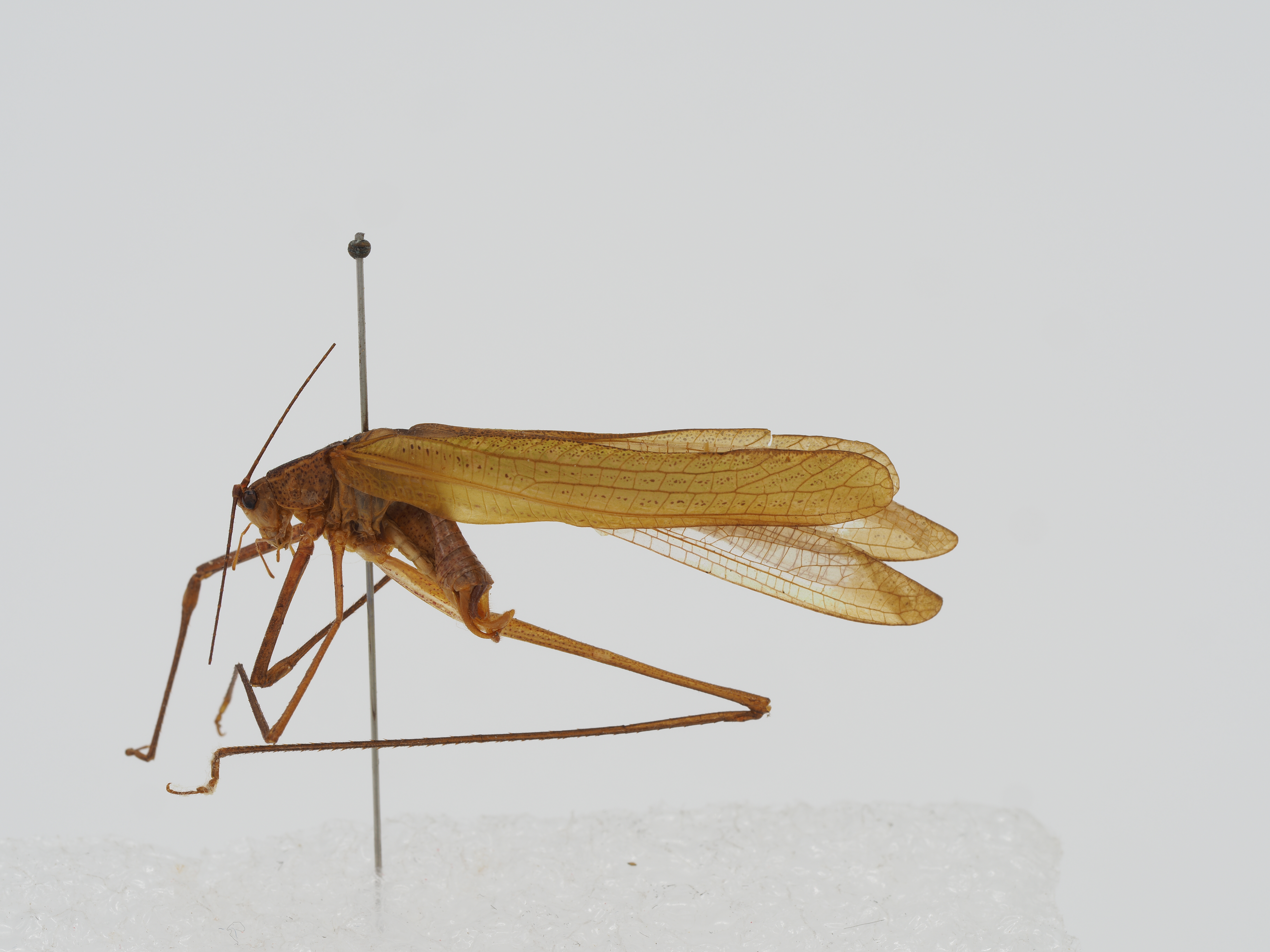 描述:雄性体形较小。头顶尖角形,端半部侧扁,狭于触角第一节,背面具沟;后头隆起。复眼卵园形,突出,前胸背板背面微圆凸,沟后区扁平,缺侧隆线倒片稍微长大于宽,下缘倾斜,后下角圆形,后缘肩凹稍明显。前翅较狭、稍超过后足股节端部;Rs脉从R脉中部之前分出,具4分枝;横脉排列较规则。后翅长于前翅。前足基节缺刺。前足股节腹面内缘具4-7个小刺,外缘缺刺;中足股节腹面内极缺刺,外缘具12-15个小刺;后足股节腹面内缘缺刺,外缘具 0-3个小刺,前足胫节背面具纵沟和背距,内侧和外侧听器均为封闭型。第十腹节背板后缘平截形。,肛上板延长,基部和端部约等宽,侧缘几乎平行,后缘具弱的凹缘,尾须细长,到达或稍超过下生殖板顶端、内弯,端部具一尖刺。下生殖板狭长,端半部较强地向上弯曲,近端部背腹面向扩大;端部的1/3开裂成两叶,内侧表面具微小的细刺。雌性,产卵瓣侧扁,较强地向上弯曲,边缘具细齿。体淡褐黄色。头部和前胸背板背面、