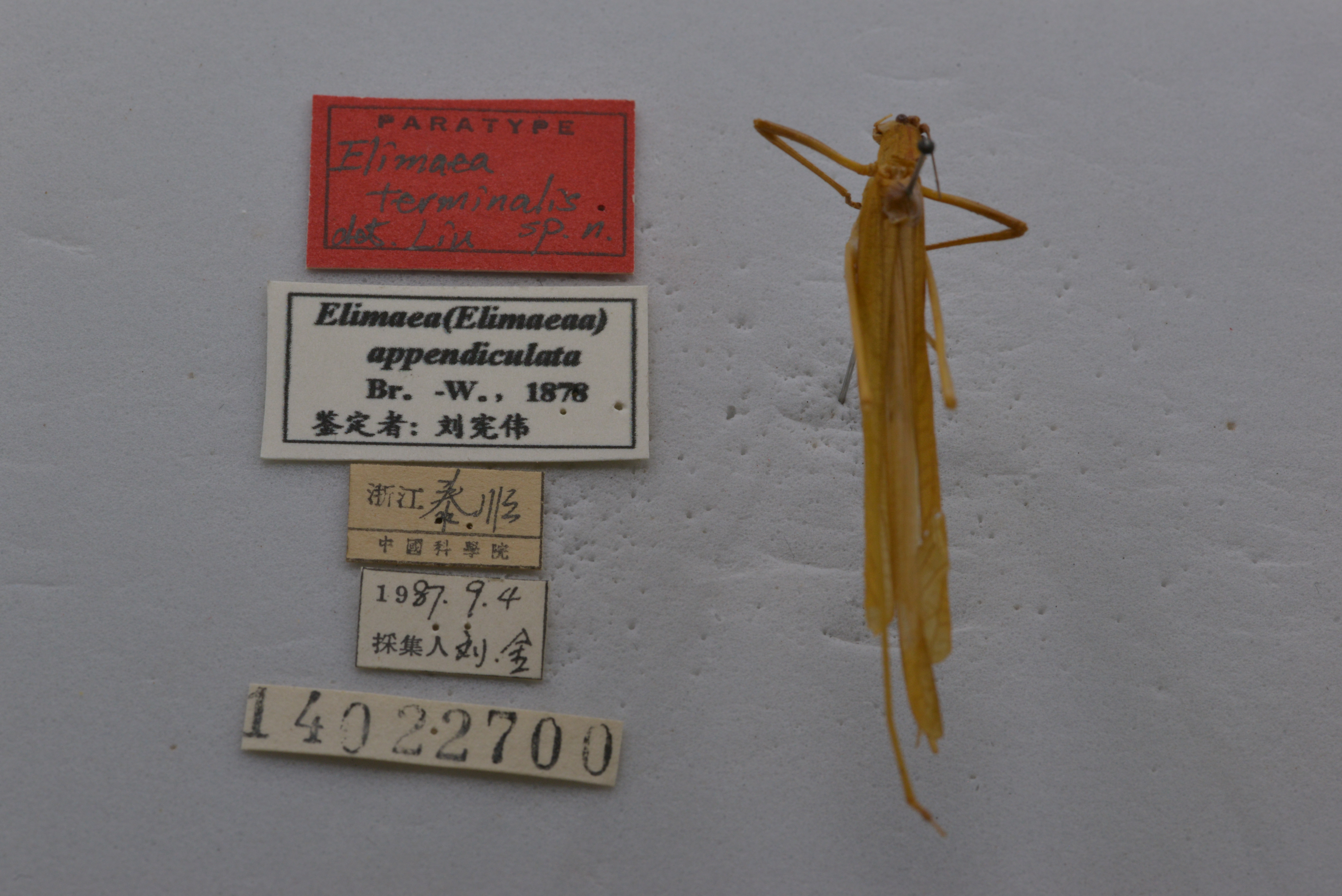 描述:本新种的体形大小,颜色及形态特征均与疹点掩耳螽Elimaea punctifera十分相似,区别仅在于雄性尾须近端部不增粗,顶端向上扭弯,其背缘具一条纵隆脊。这个种个体间变异如何,还有特于今后进一步的研究。