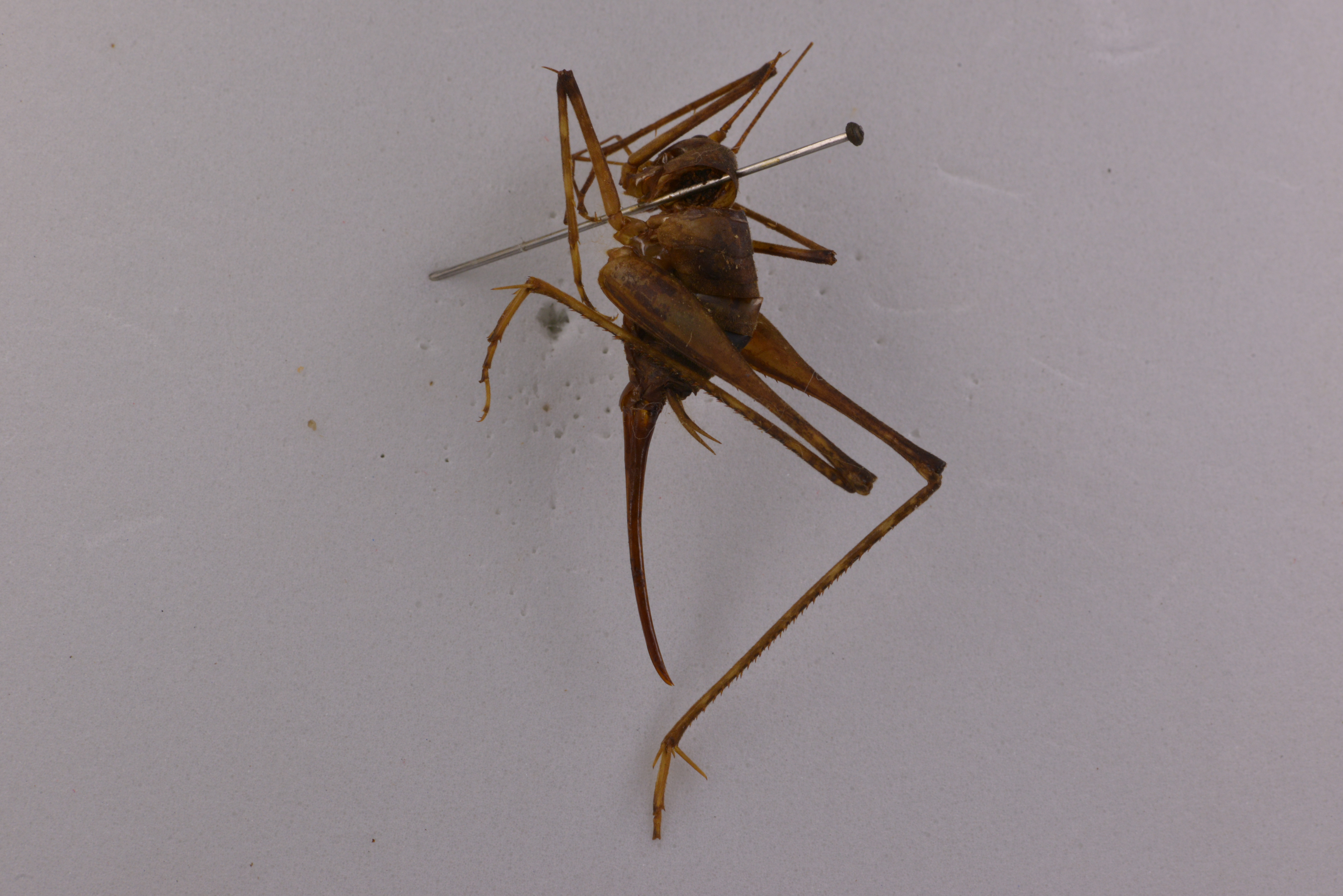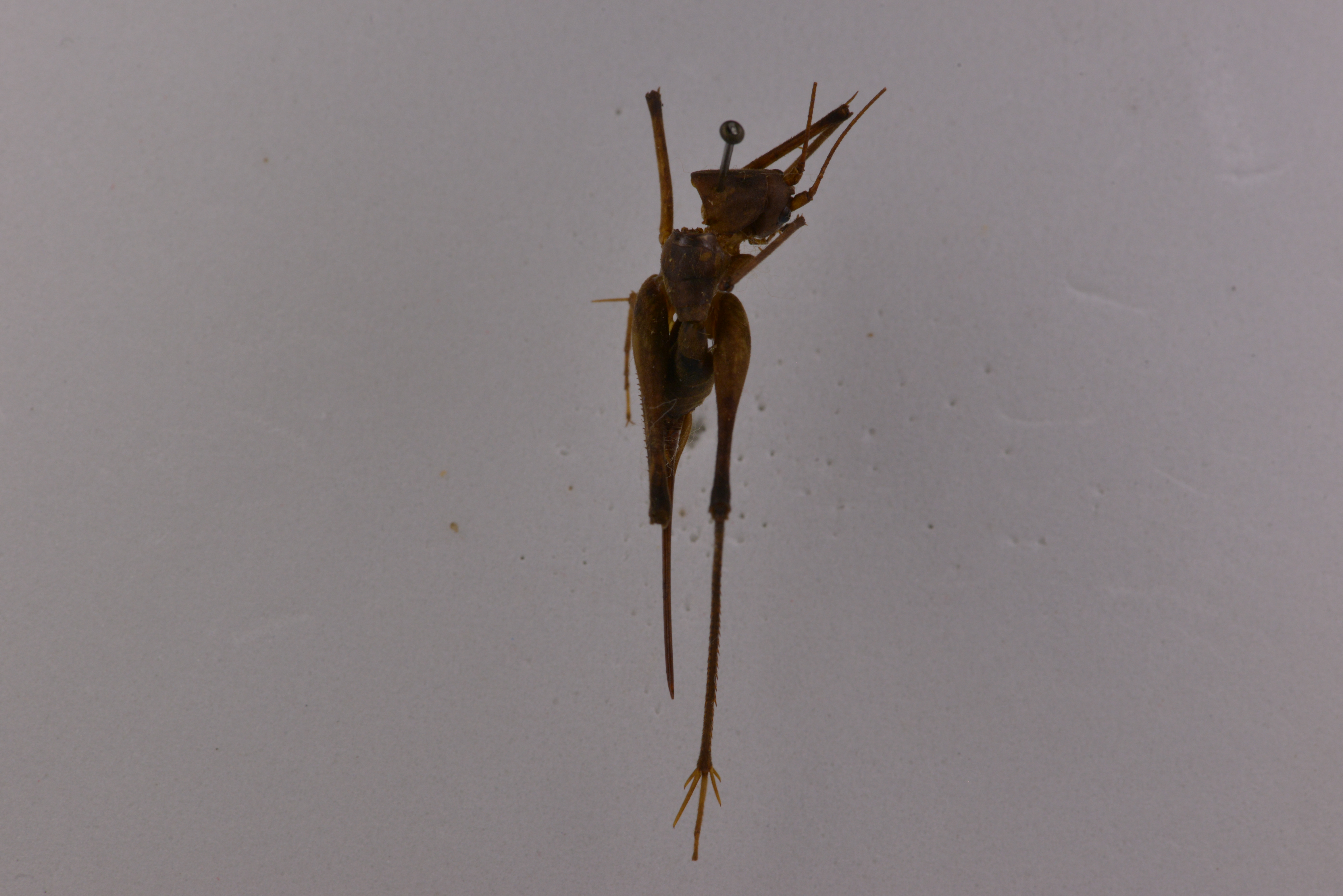 描述:雄:头顶具纵沟,分顶角为两个锥形的瘤。前足股节约为前胸背板长的1.6倍,腹面缺刺,内膝叶具1个小刺,外膝叶具1个较长的距。前足和中足胫节腹面各具2个内距和2个外距(不包括端距)。后足股节腹面内缘具7~9个刺,后足胫节背面具29~34个刺内侧上端距几乎等长于跗基节,跗基节背面具2~4个刺(包括端刺)。第7腹节背板具较狭长的中突起,端部圆形。肛侧板延长,中部之后稍微阔宽,端部呈斜截形。
