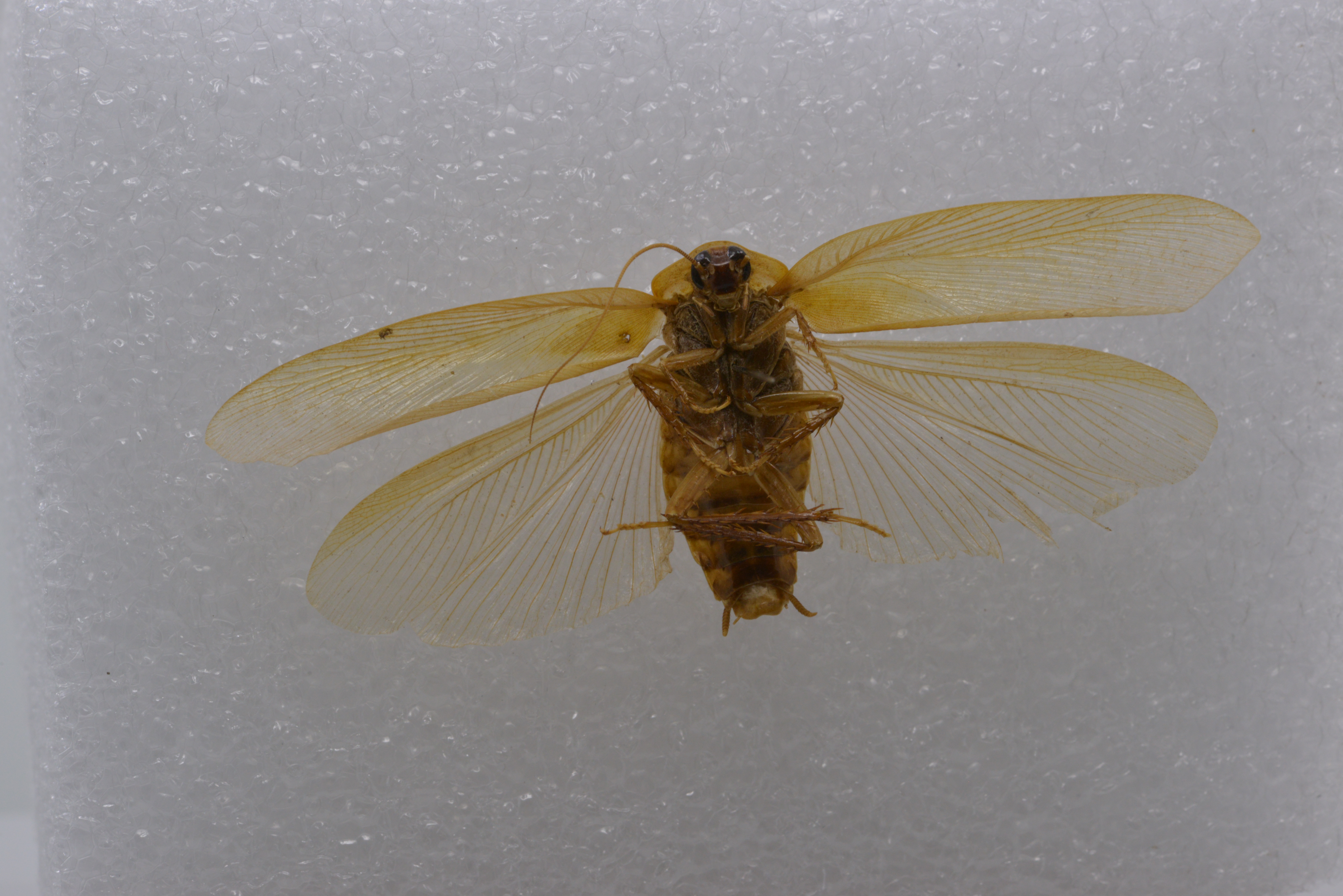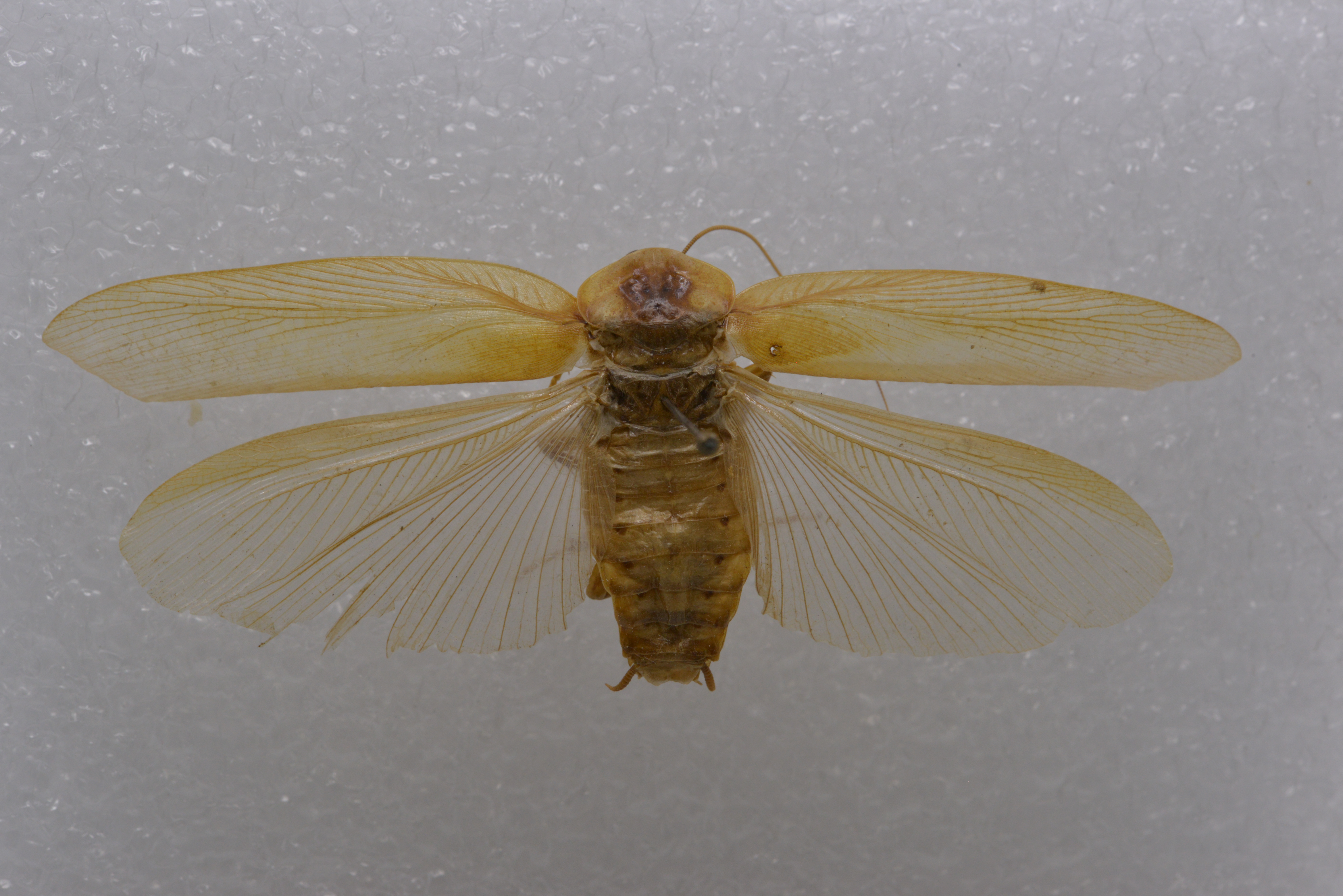 描述:雄头顶稍微露出前胸背板之前,复眼较大,其间距约为触角第1节宽的2倍,单眼间距与复眼间距几乎相等,下缘之间具1条横沟。前胸背板宽大于长,前缘宽圆形,后缘呈钝角形突出,表面中央具浅凹痕和皱褶。前翅和后翅均发达。前翅远超过腹端,其长约为宽3倍,端缘非波曲形,Sc脉具分枝。后翅稍短于前翅,端部宽圆形,CuA宽,不超过下生殖板,后缘中央具三角形的凹口,裂叶呈宽圆形。尾须15节。下生殖板横宽,后缘波曲形,左侧呈钝角形凸出;腹突微扁平。
